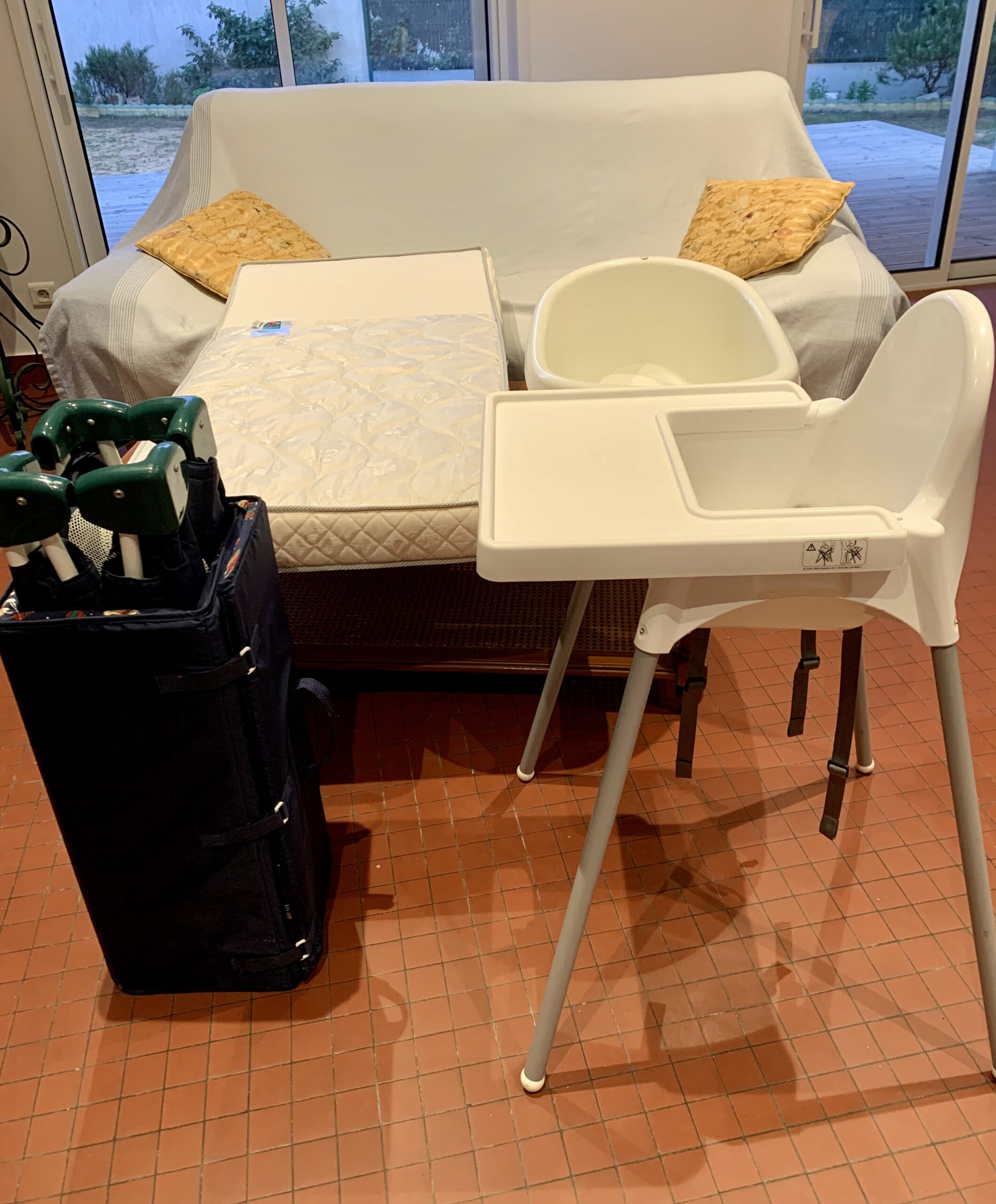 Matériel bébé à disposition: lit, chaise et baignoire.