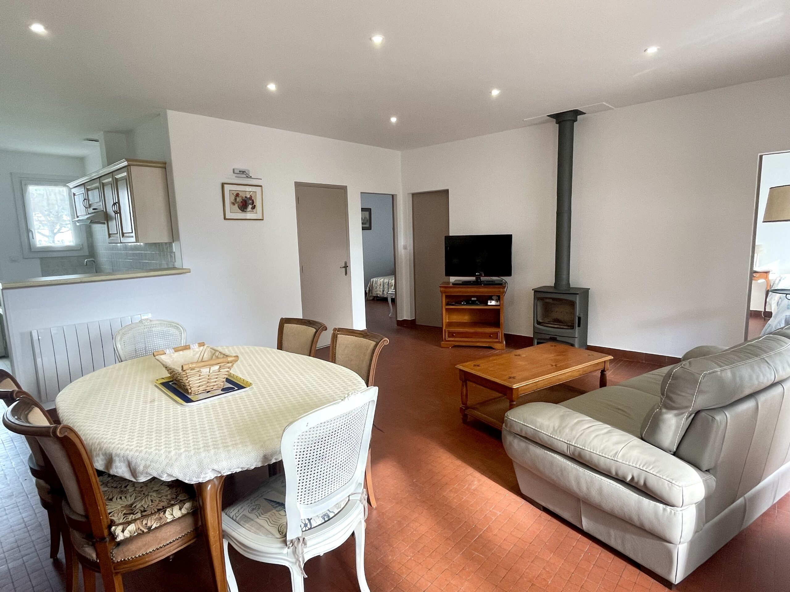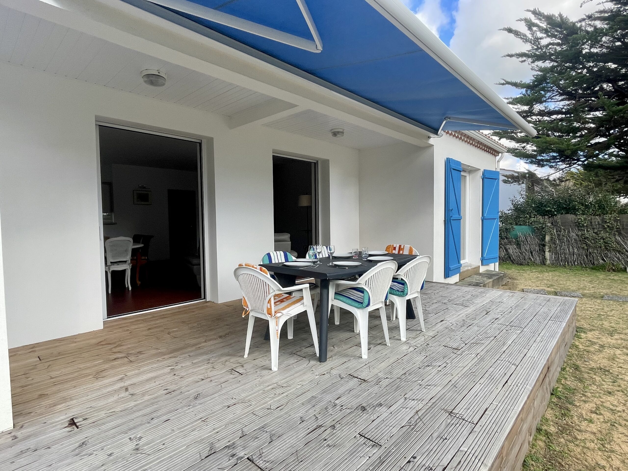 La pièce de vie ouvre sur l’arrière de la maison: une belle terrasse en bois semie-couverte et exposée sud (table, chaises et store banne) et jardin clos.