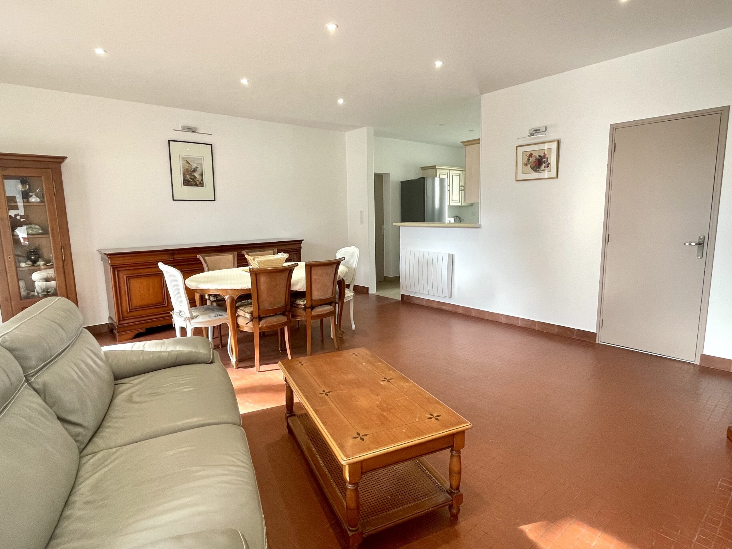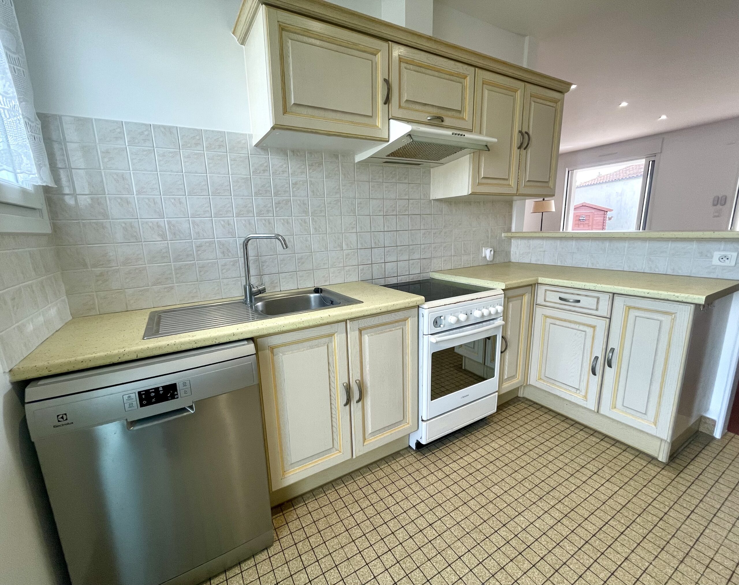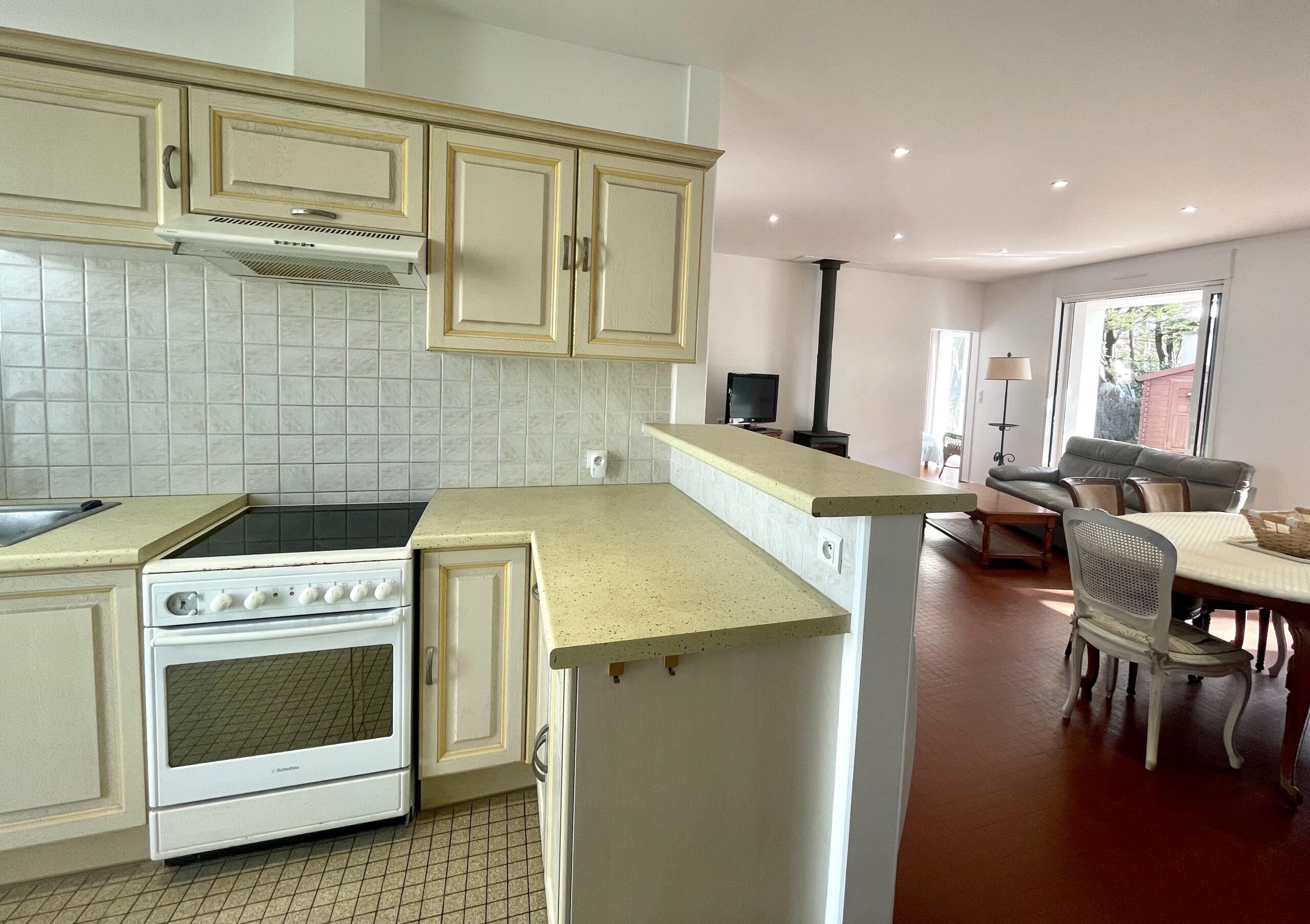 Elle se compose d’un coin cuisine équipée (plaque vitro, four, micro-ondes, lave-vaisselle, réfrigérateur avec partie congélateur), une spacieuse pièce de vie avec coin repas (table, chaises) et un coin détente (canapé + TV écran plat).