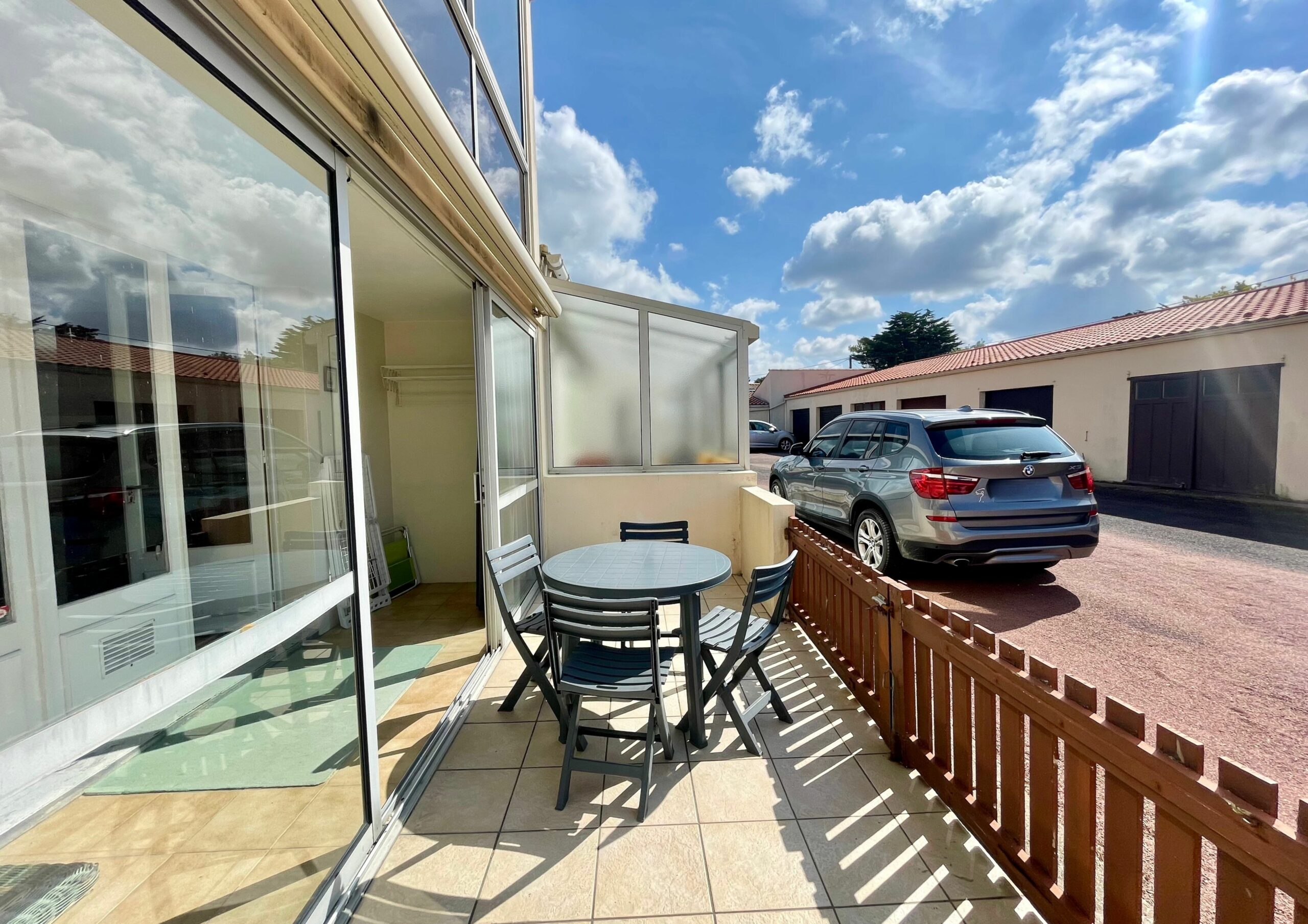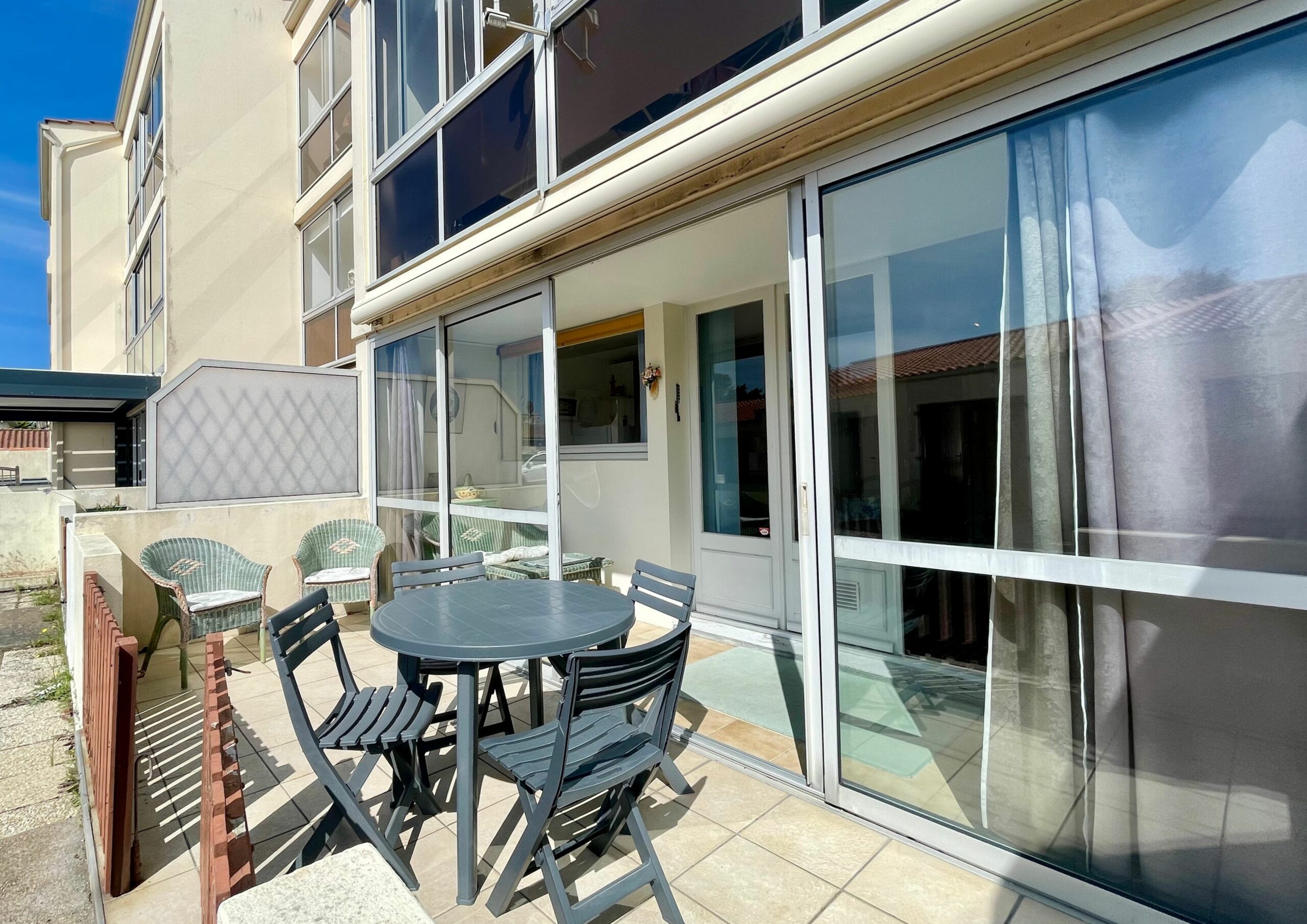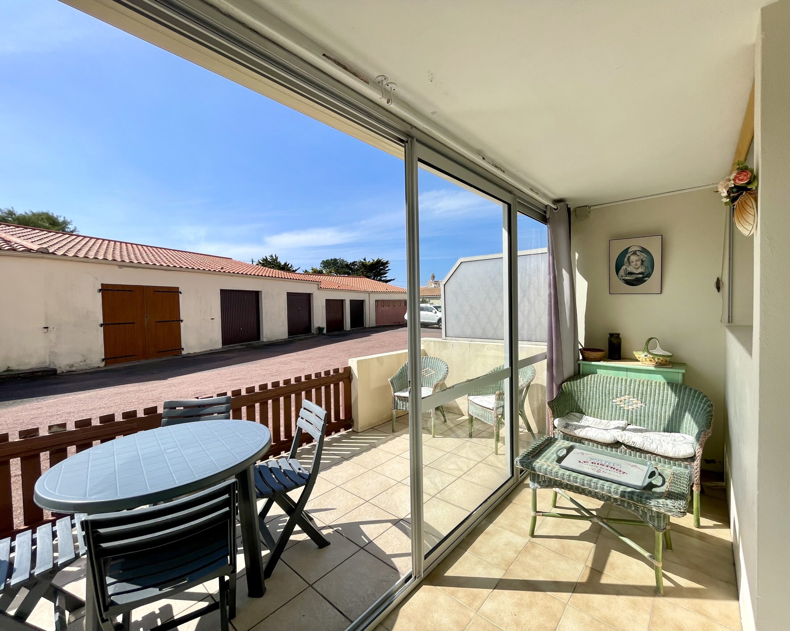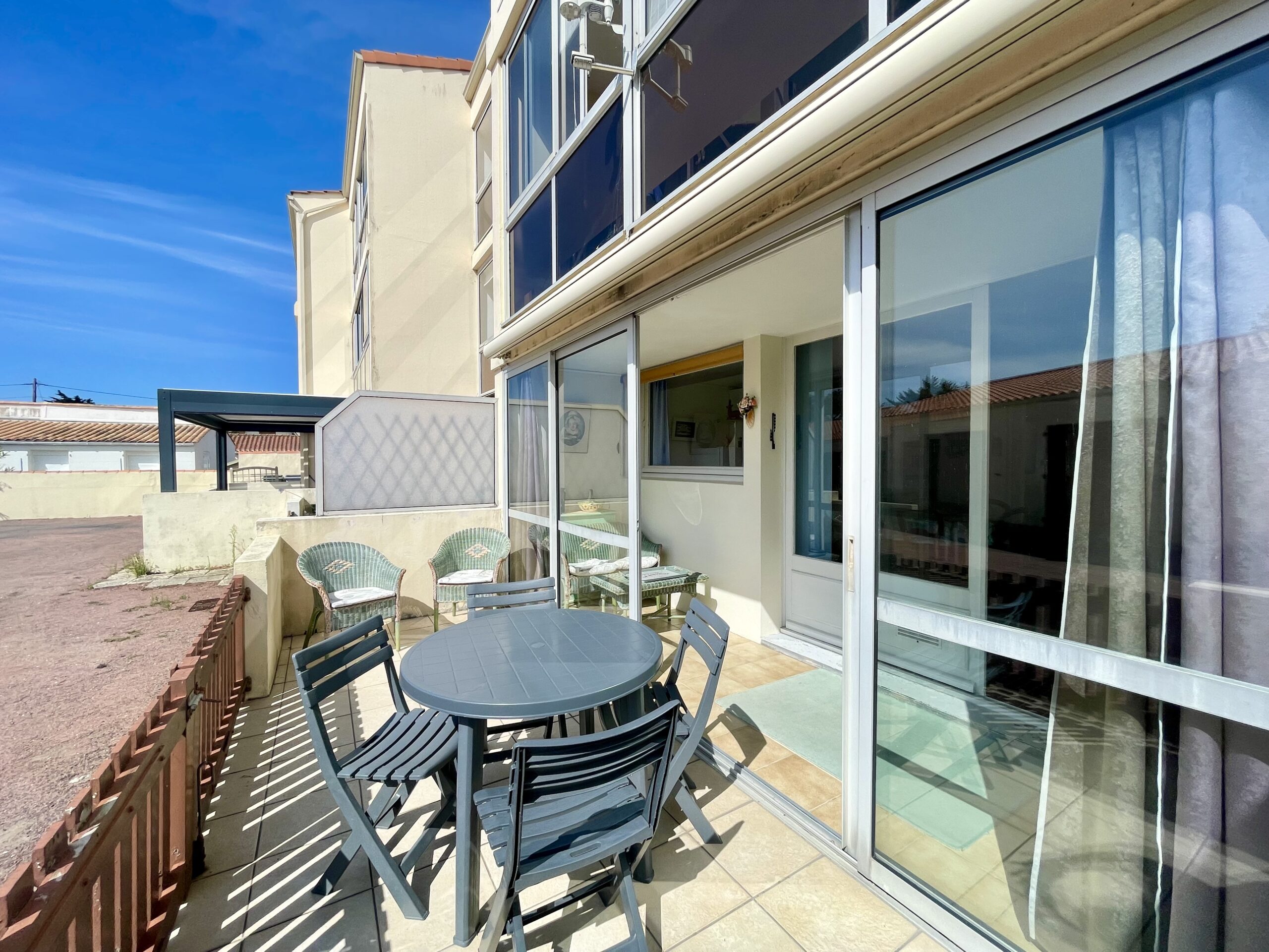 La pièce de vie ouvre, sur l’arrière de la résidence, sur une loggia puis une terrasse avec salon de jardin (table, chaises, store banne et salon de détente en rotin).