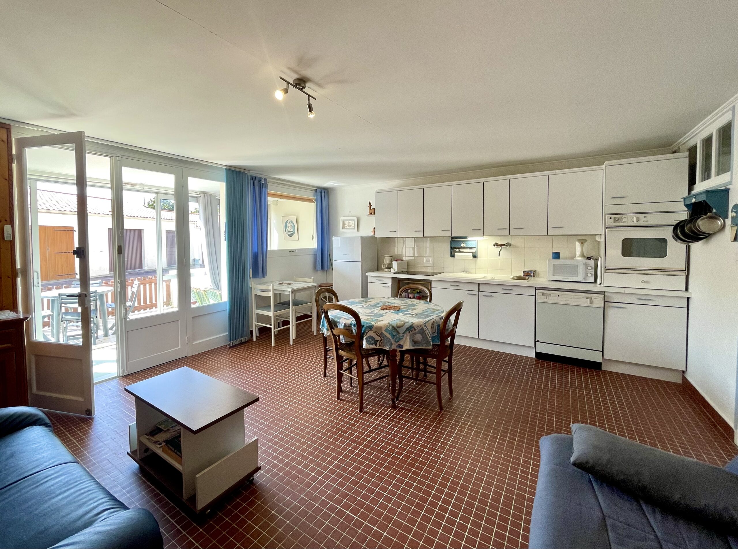 Il comprend une pièce de vie d’env. 22m² avec une cuisine équipée (plaque vitrocéramique, four, micro-ondes, lave-vaisselle), un coin repas (table, chaises) et un salon (2 canapés dont un clic-clac, table basse, TV écran plat).