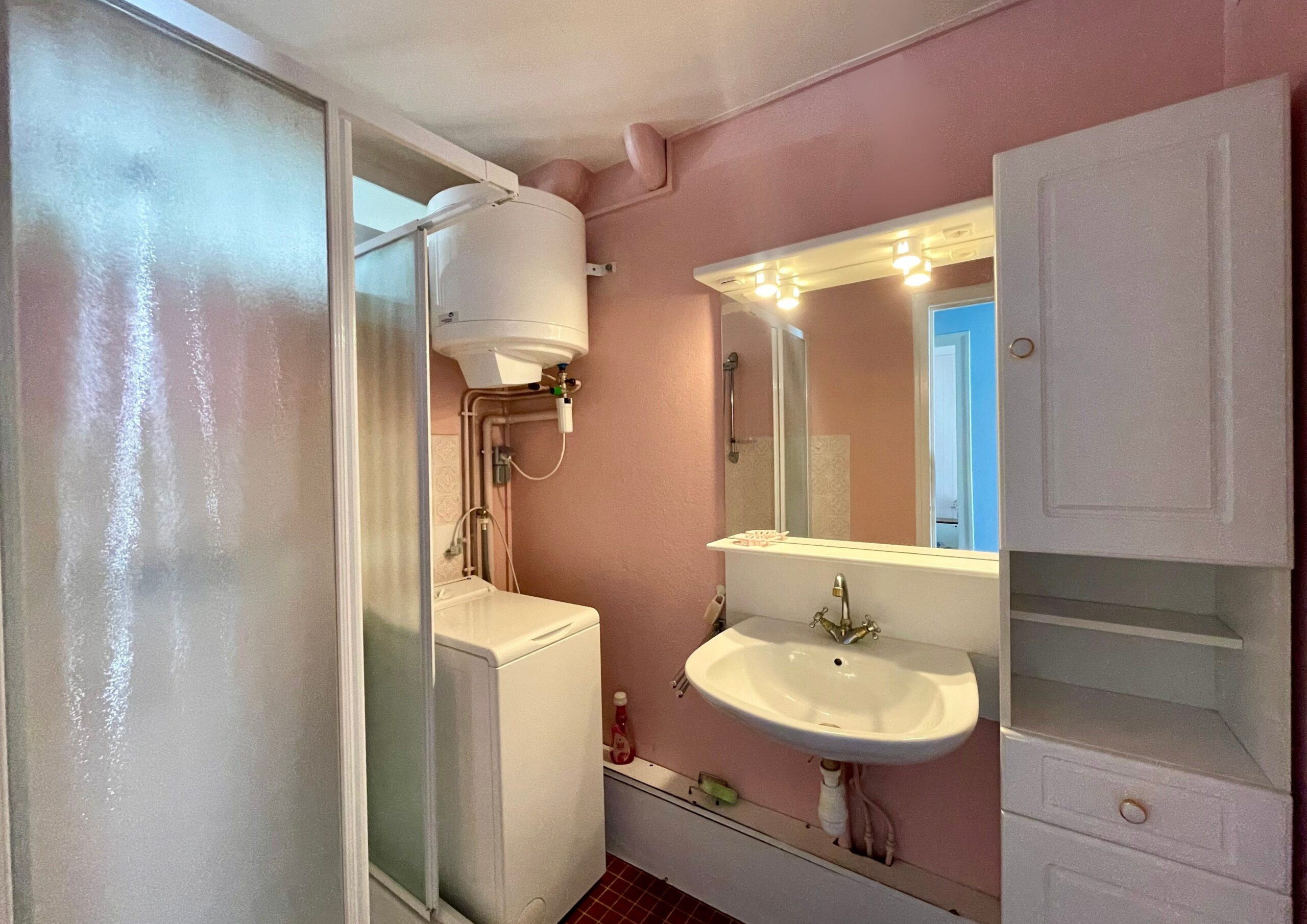 Un dégagement dessert la chambre, un WC séparé et la salle d’eau (vasque, douche et lave-linge).