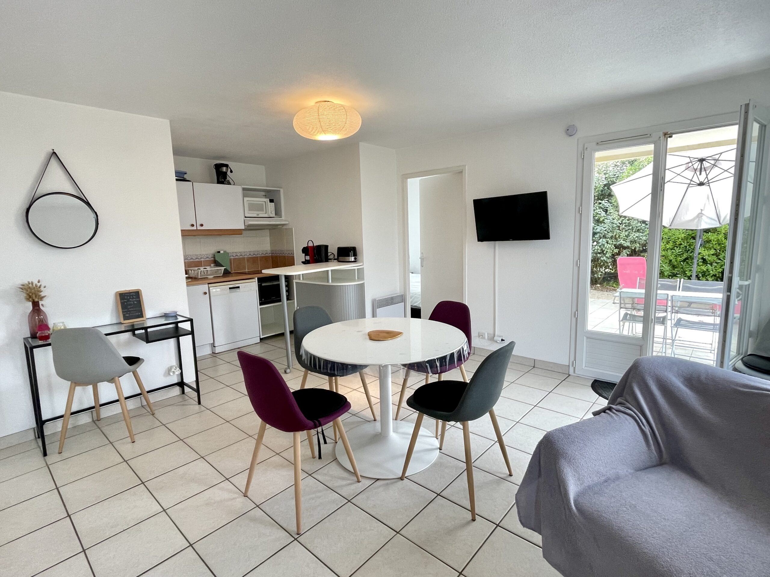 L’appartement se situe au rez-de-chaussée et comprend : une entrée, toilette indépendant, une pièce de vie avec un coin salon (canapé, fauteuil, table basse, Tv écran plat), un coin repas (table et chaises ) un coin cuisine (réfrigérateur avec partie congélateur, lave-vaisselle, micro-ondes, minifour, plaques induction).