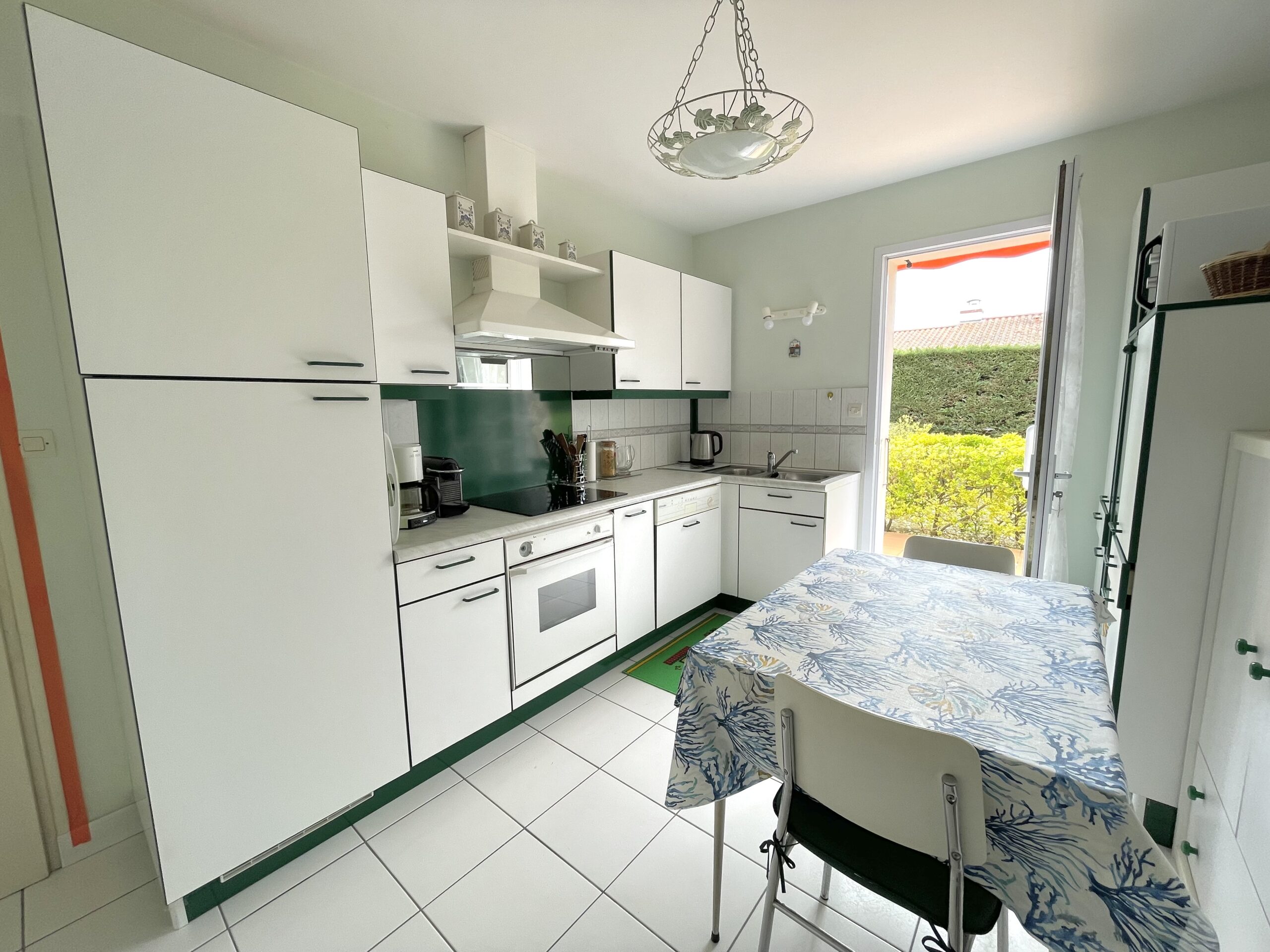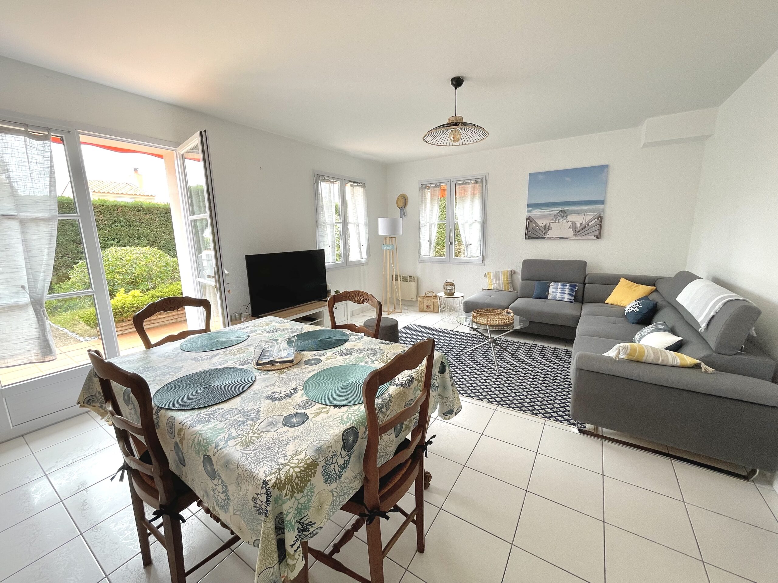 La pièce de vie ouvre sur une terrasse carrelée (table, chaises, bain de soleil, store banne et barbecue) et jardin entièrement clos.