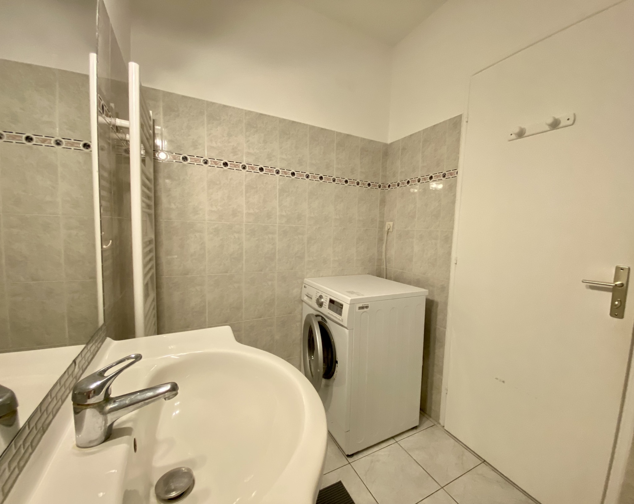 Un dégagement avec placard, WC séparés, salle de bain (meuble vasque, sèche-serviette et lave-linge).