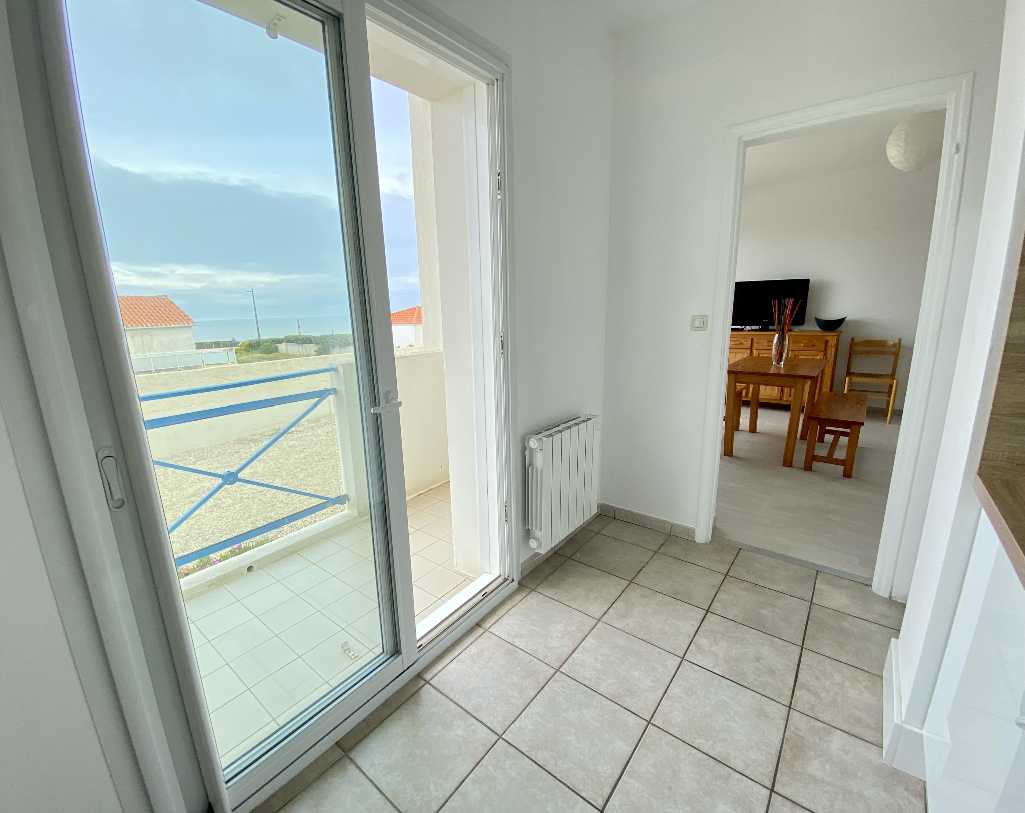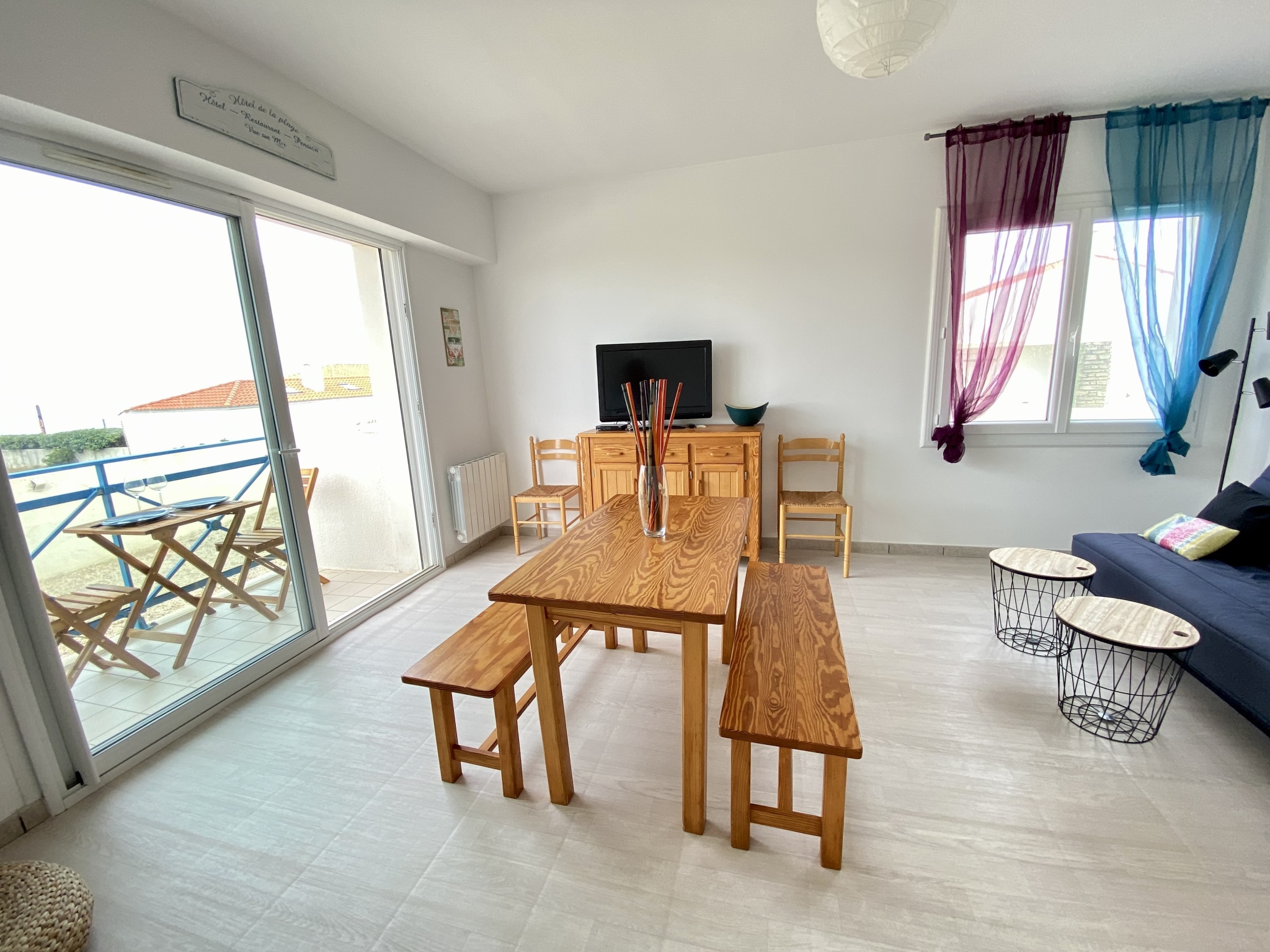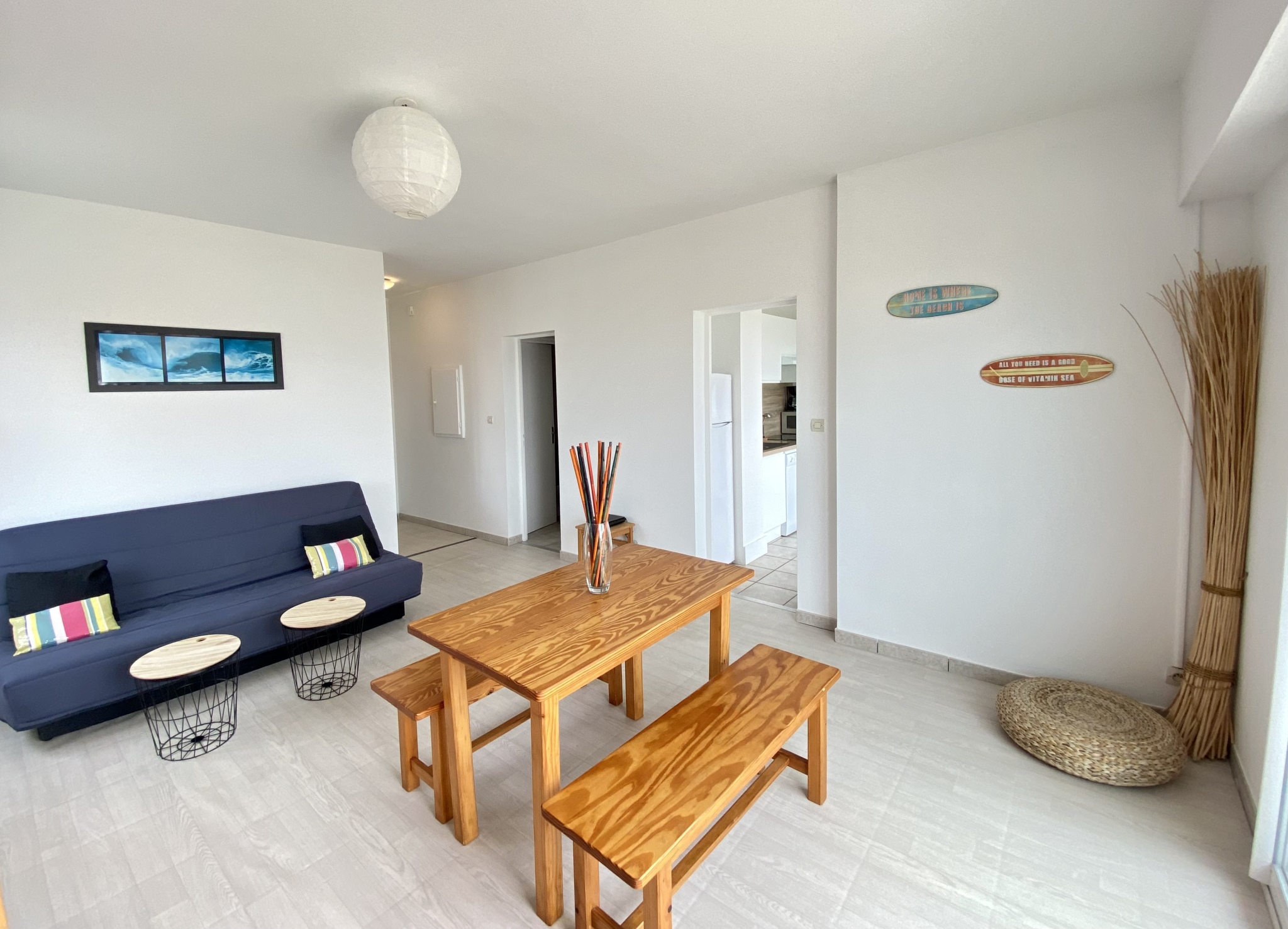 Idéalement situé face au spot de surf de La Sauzaie, appartement rénové VUE MER (2ème ligne) au rez-de-chaussée (accès par quelques marches) d’une petite résidence comprenant: une entrée dans pièce de vie avec coin repas (table, bancs) et coin salon (canapé lit type clic-clac + TV).