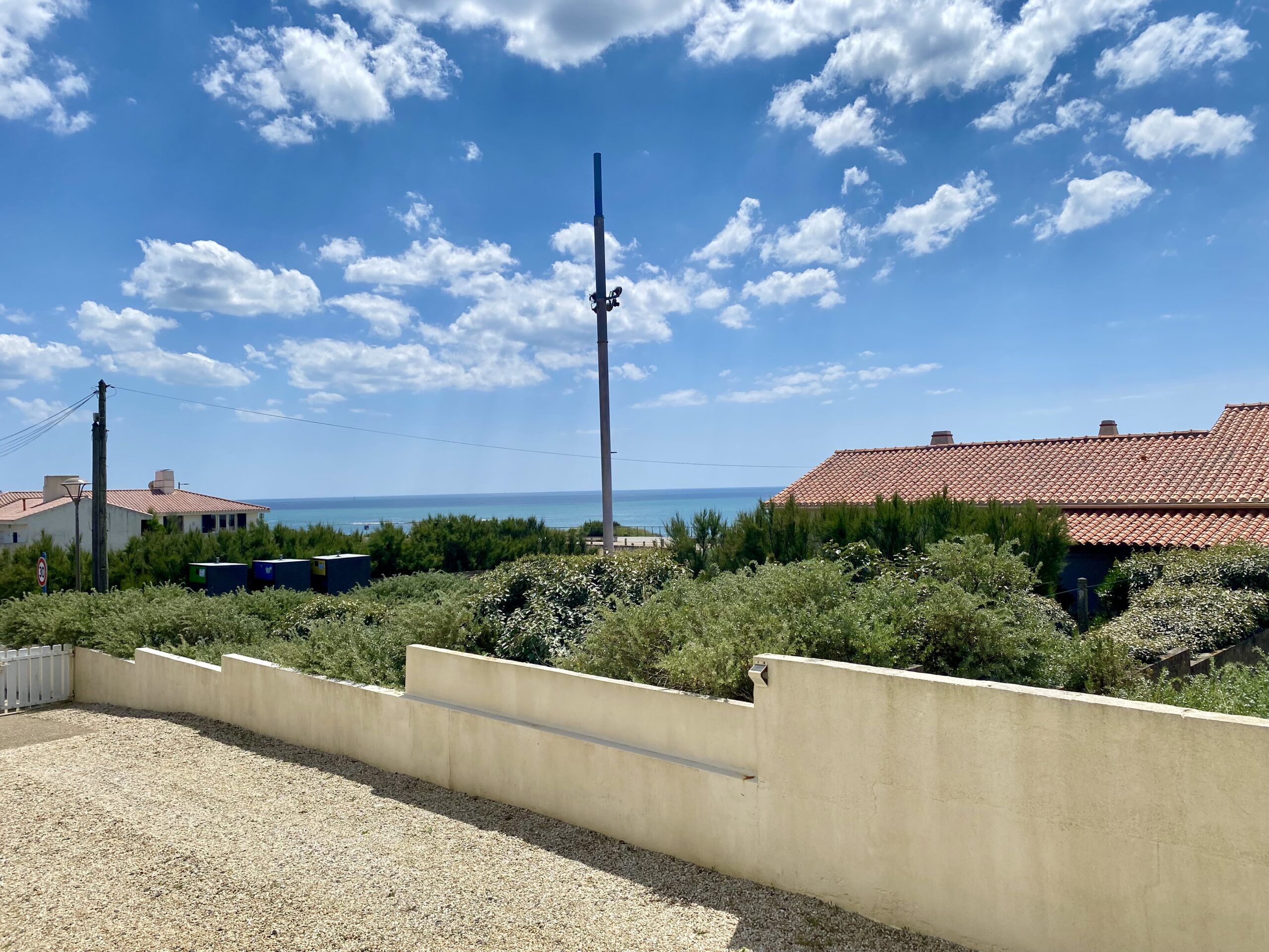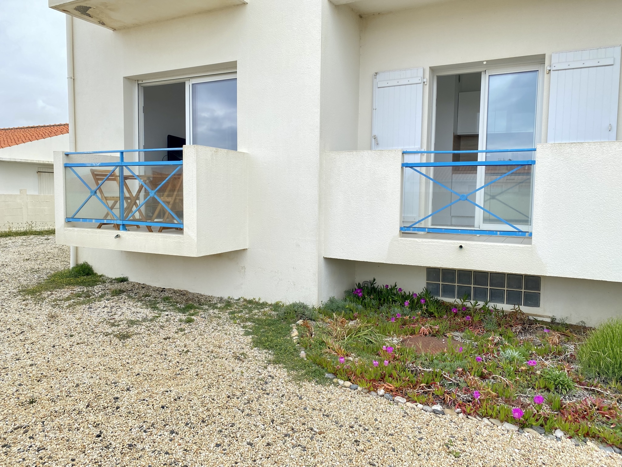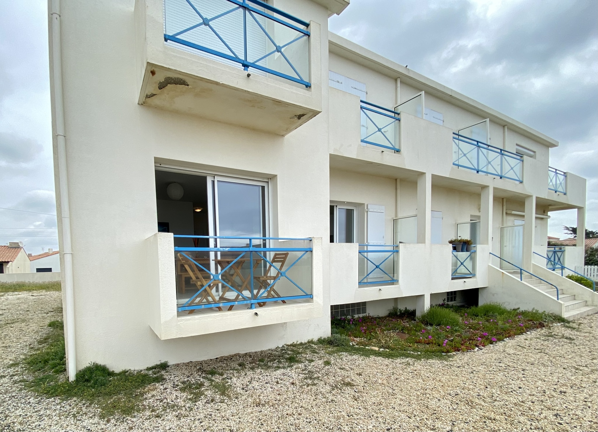 Idéalement situé face au spot de surf de La Sauzaie, appartement rénové VUE MER (2ème ligne) au rez-de-chaussée (accès par quelques marches) d’une petite résidence comprenant: une entrée dans pièce de vie avec coin repas (table, bancs) et coin salon (canapé lit type clic-clac + TV).