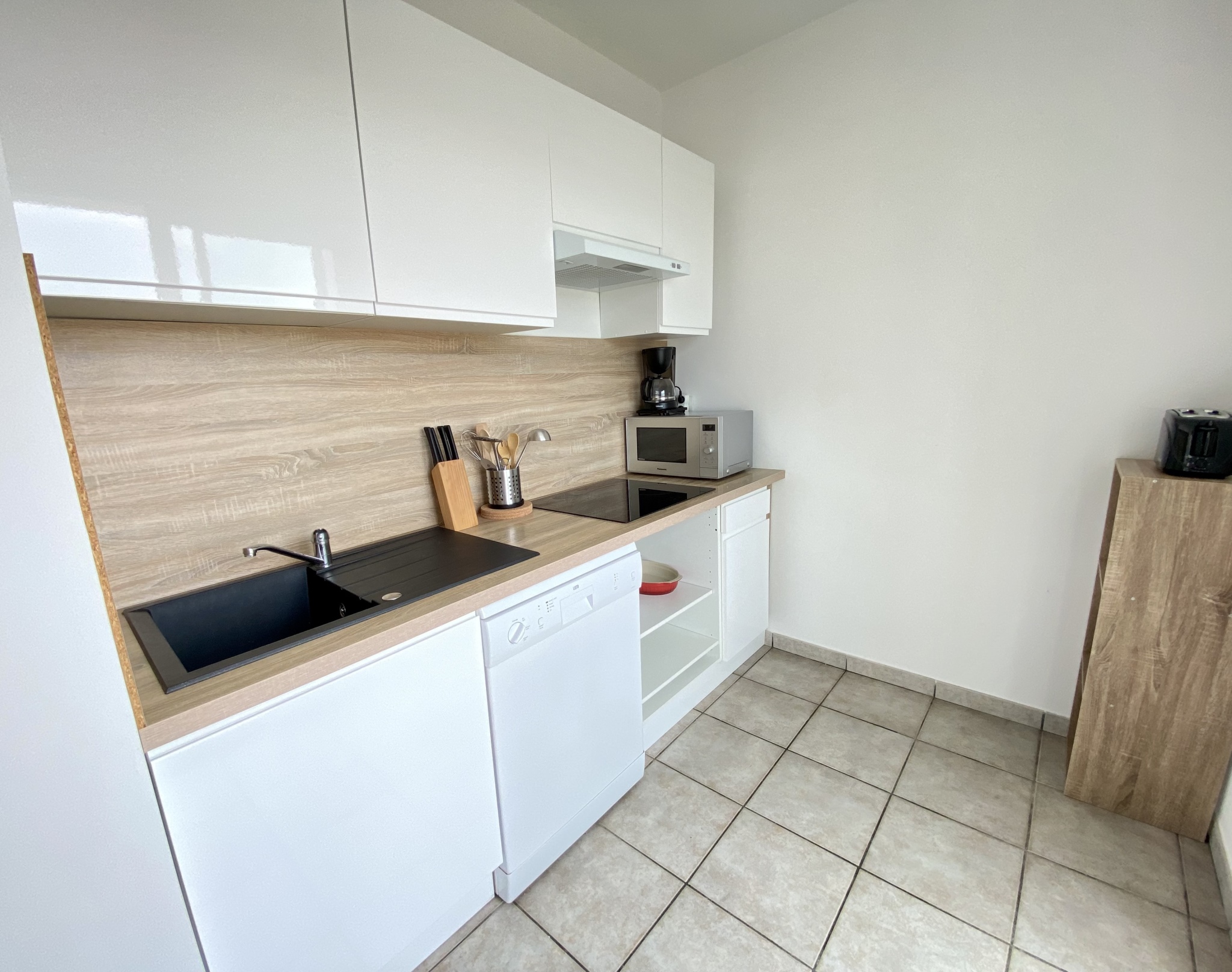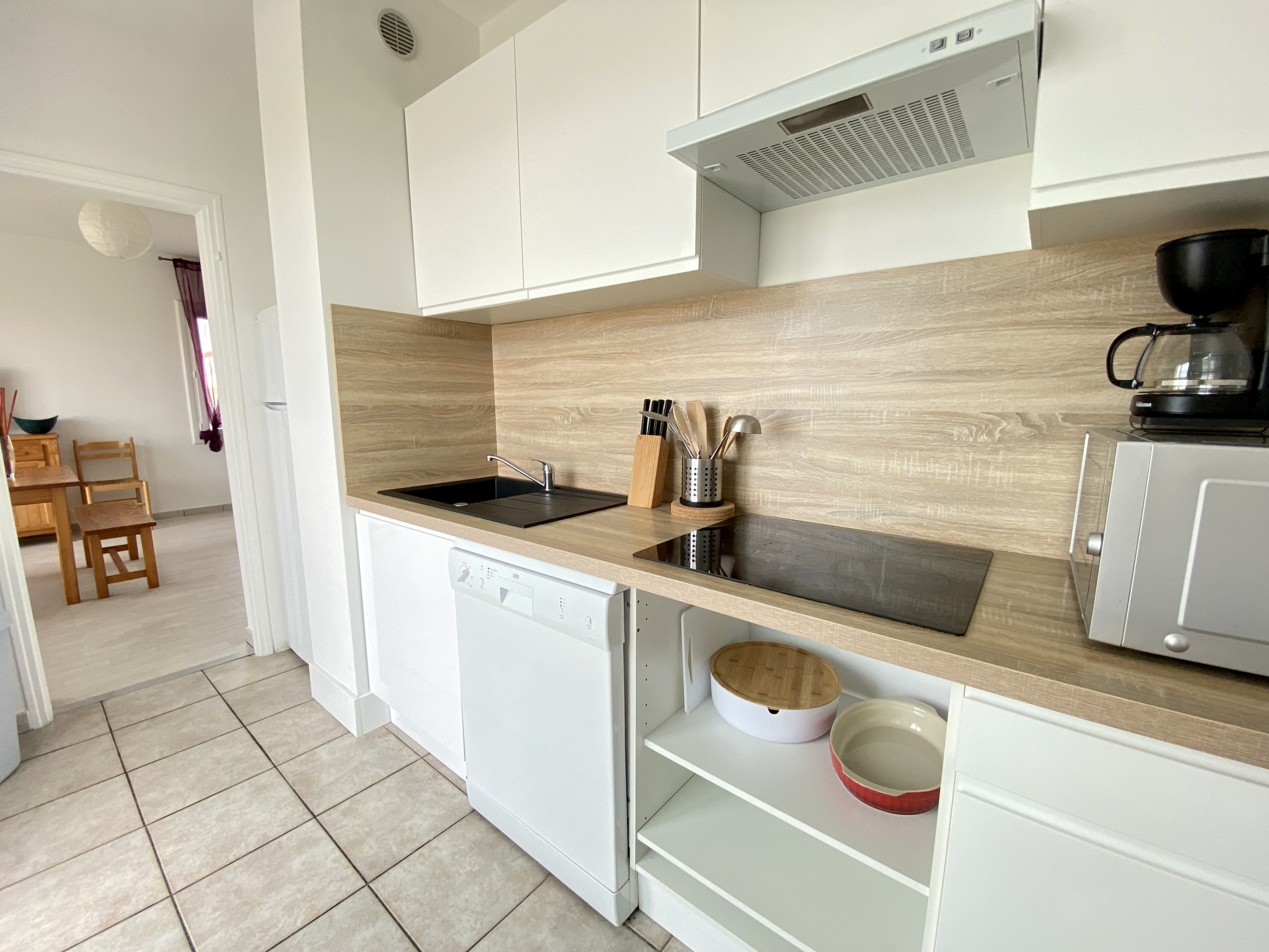 Une cuisine équipée (plaque induction, hotte, micro-ondes, lave-vaisselle et réfrigérateur avec partie congélateur) ouvre également sur un deuxième balcon VUE MER.