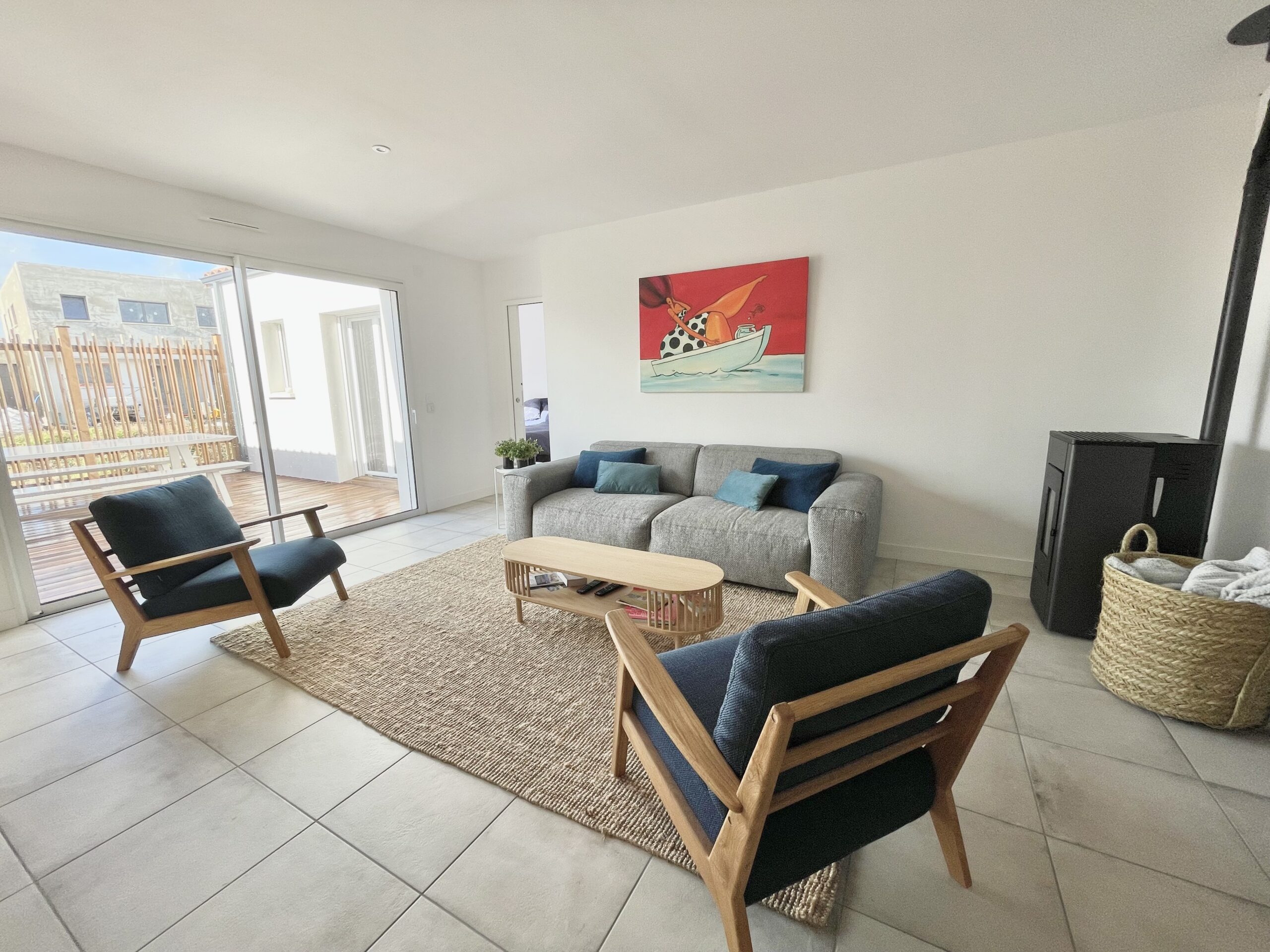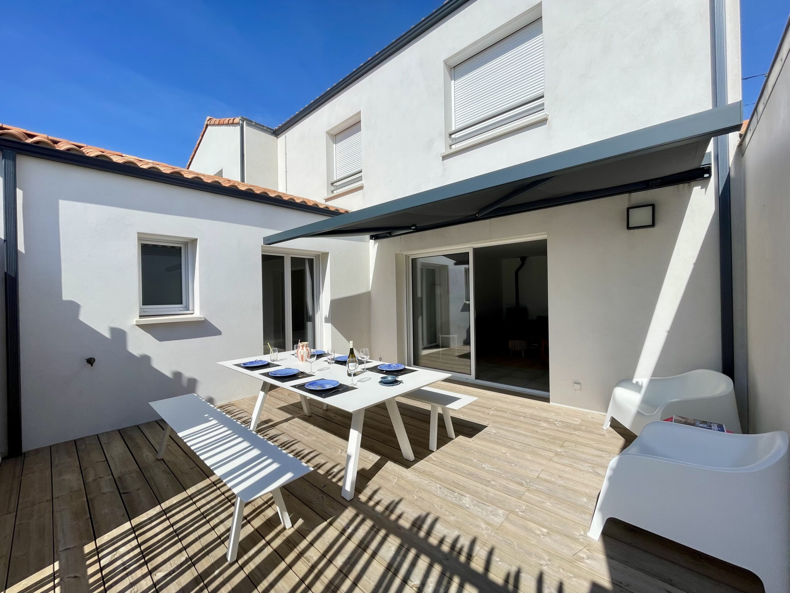 La pièce de vie ouvre sur une agréable terrasse en bois exposée ouest avec salon de jardin (table, bancs, 2 fauteuils), barbecue à gaz et store banne électrique.