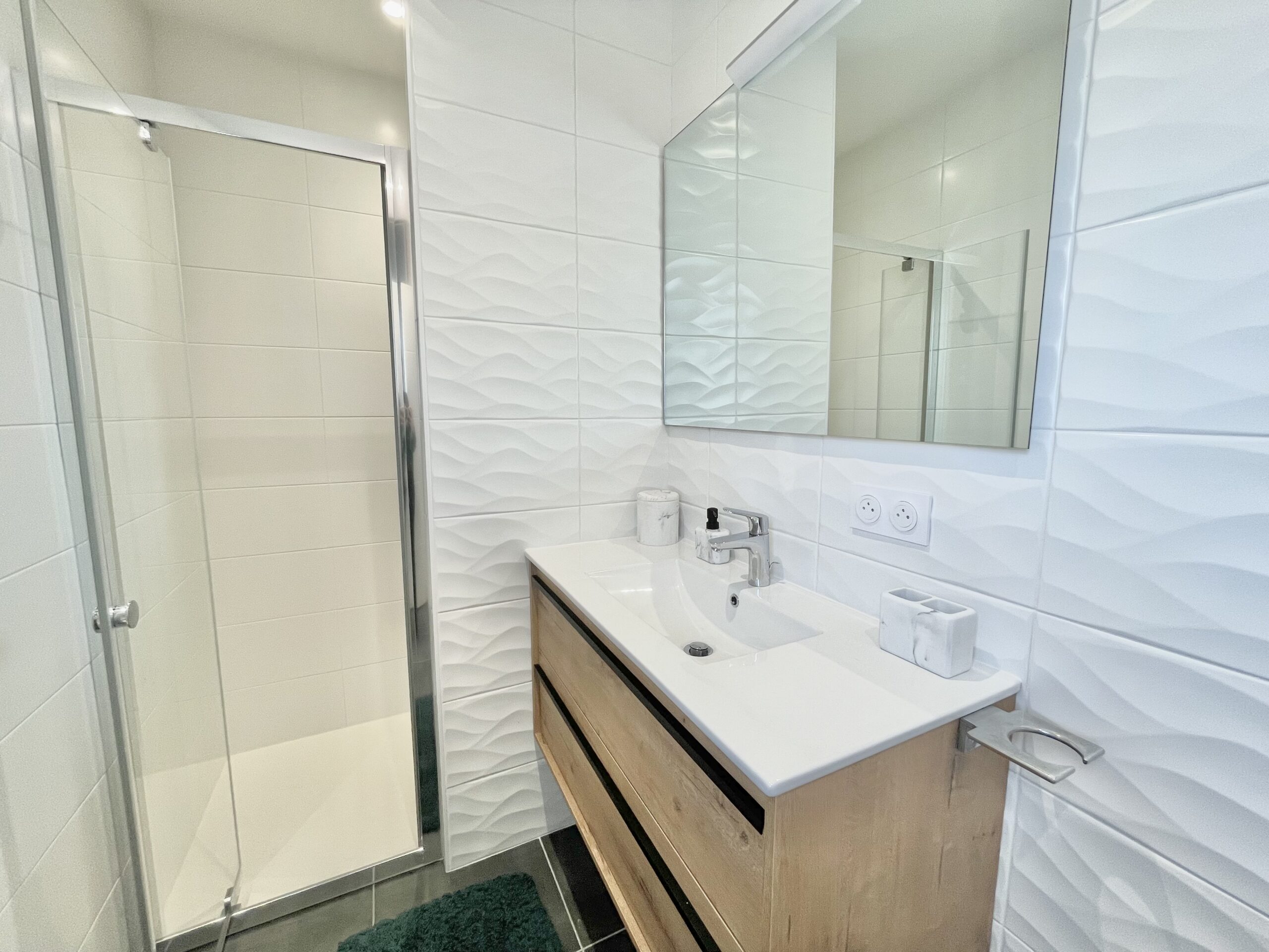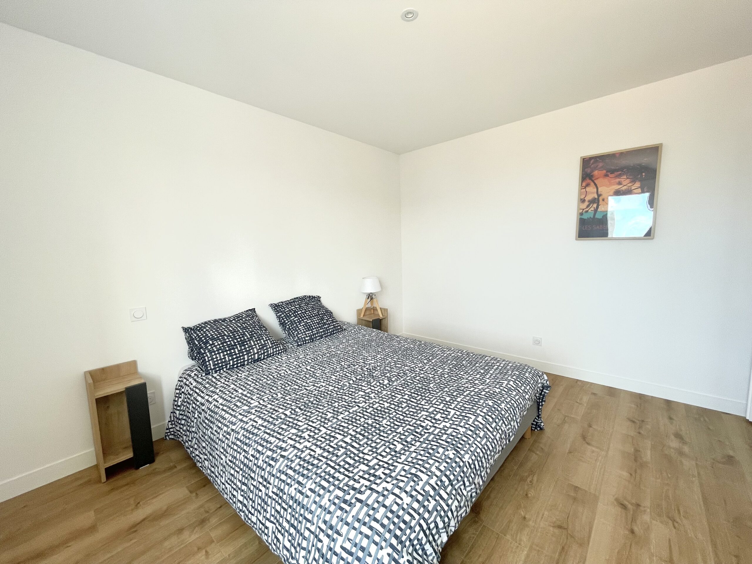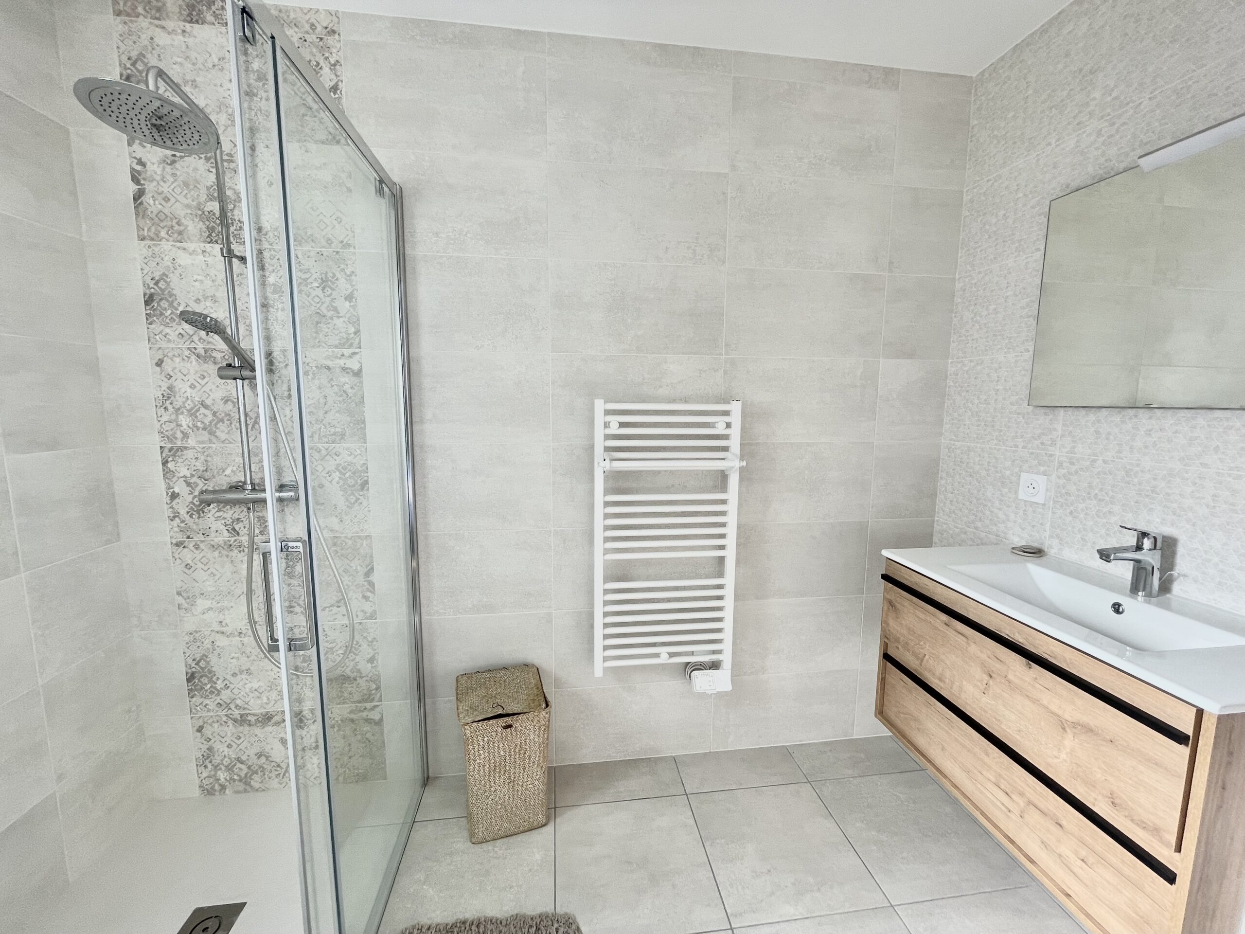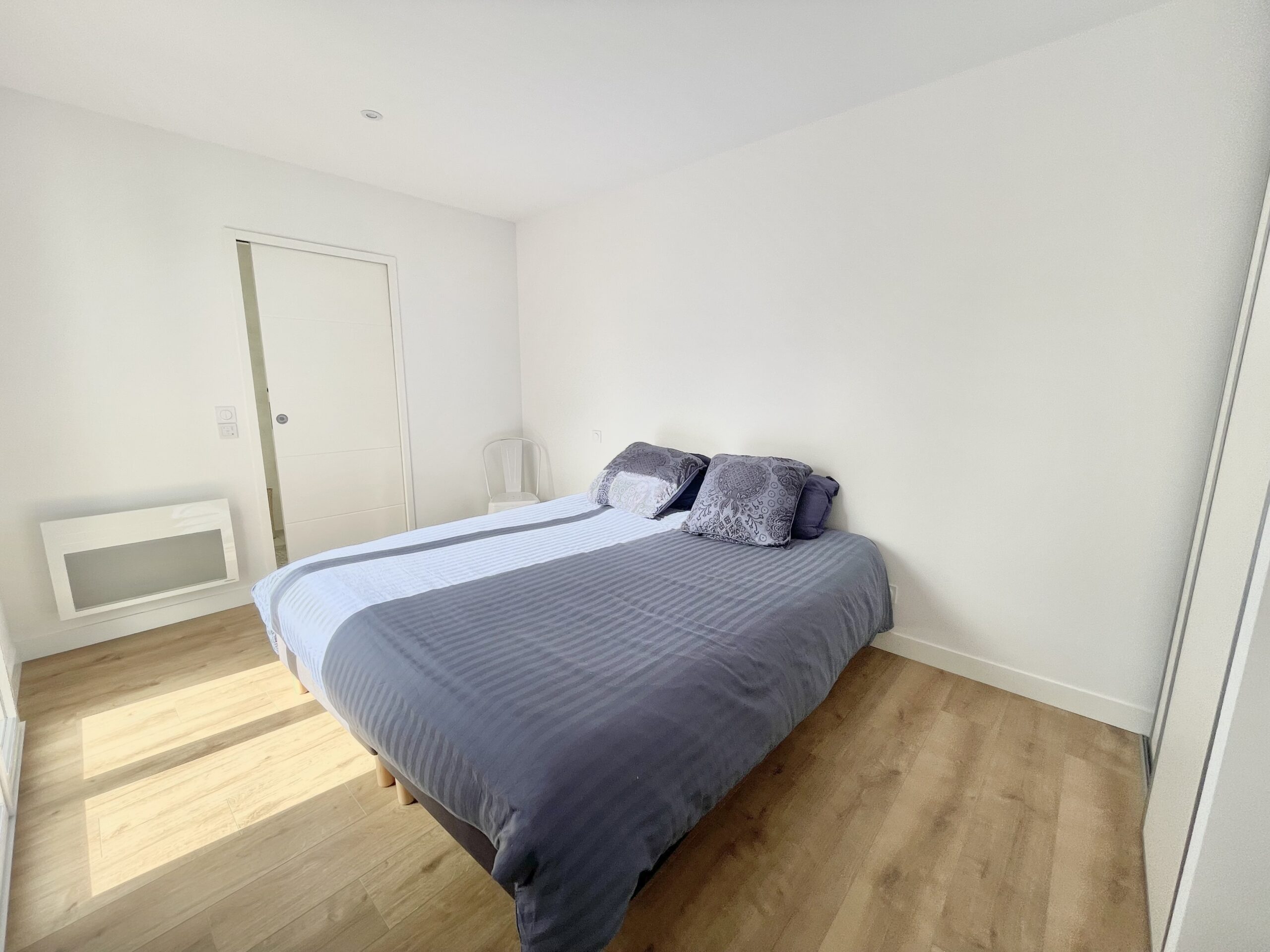 Au rez-de-chaussée, une chambre parentale avec un lit double (180 x 200) + placard et salle d’eau attenante (douche italienne, meuble vasque, sèche-serviette). Cette chambre ouvre sur la terrasse.