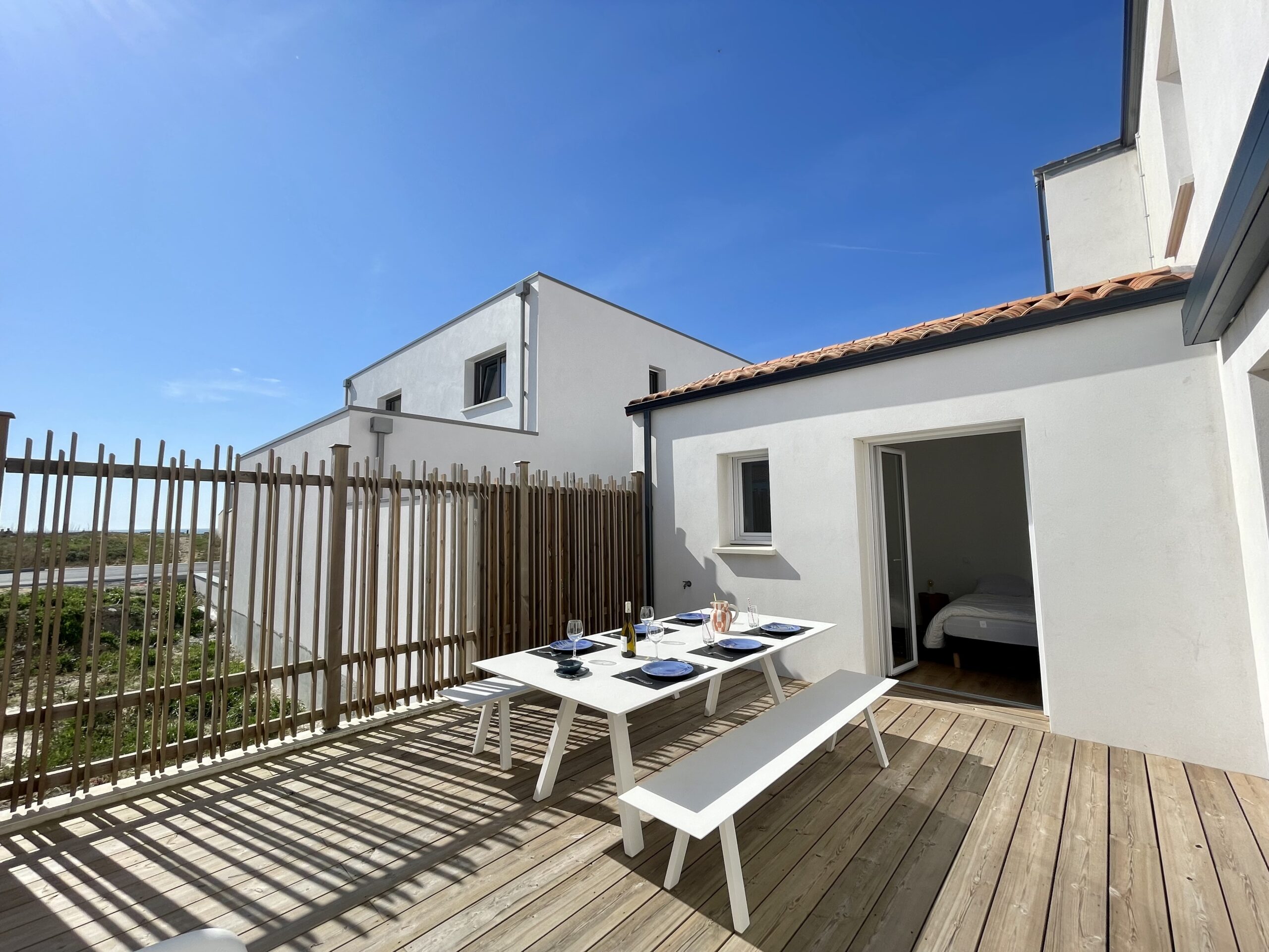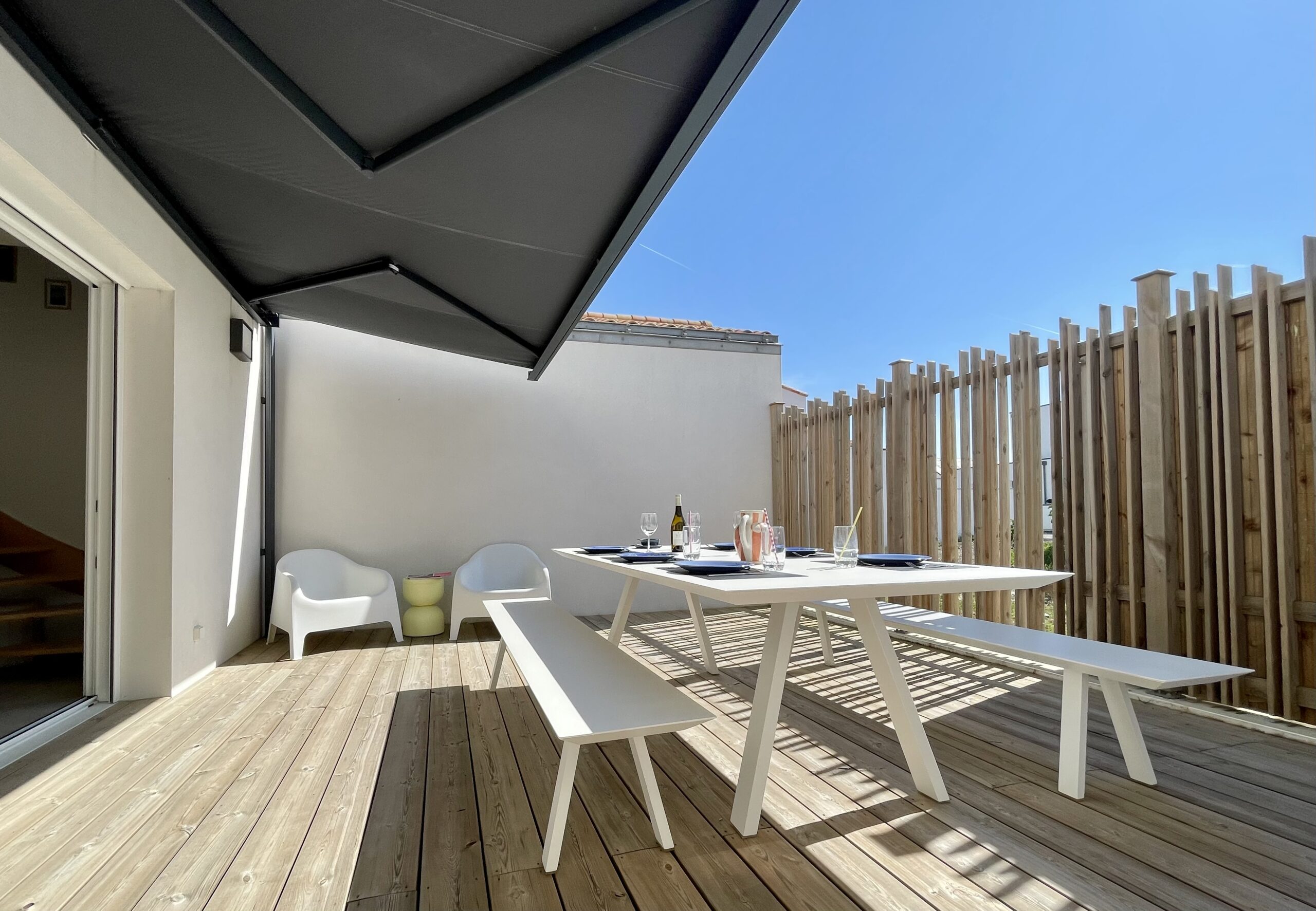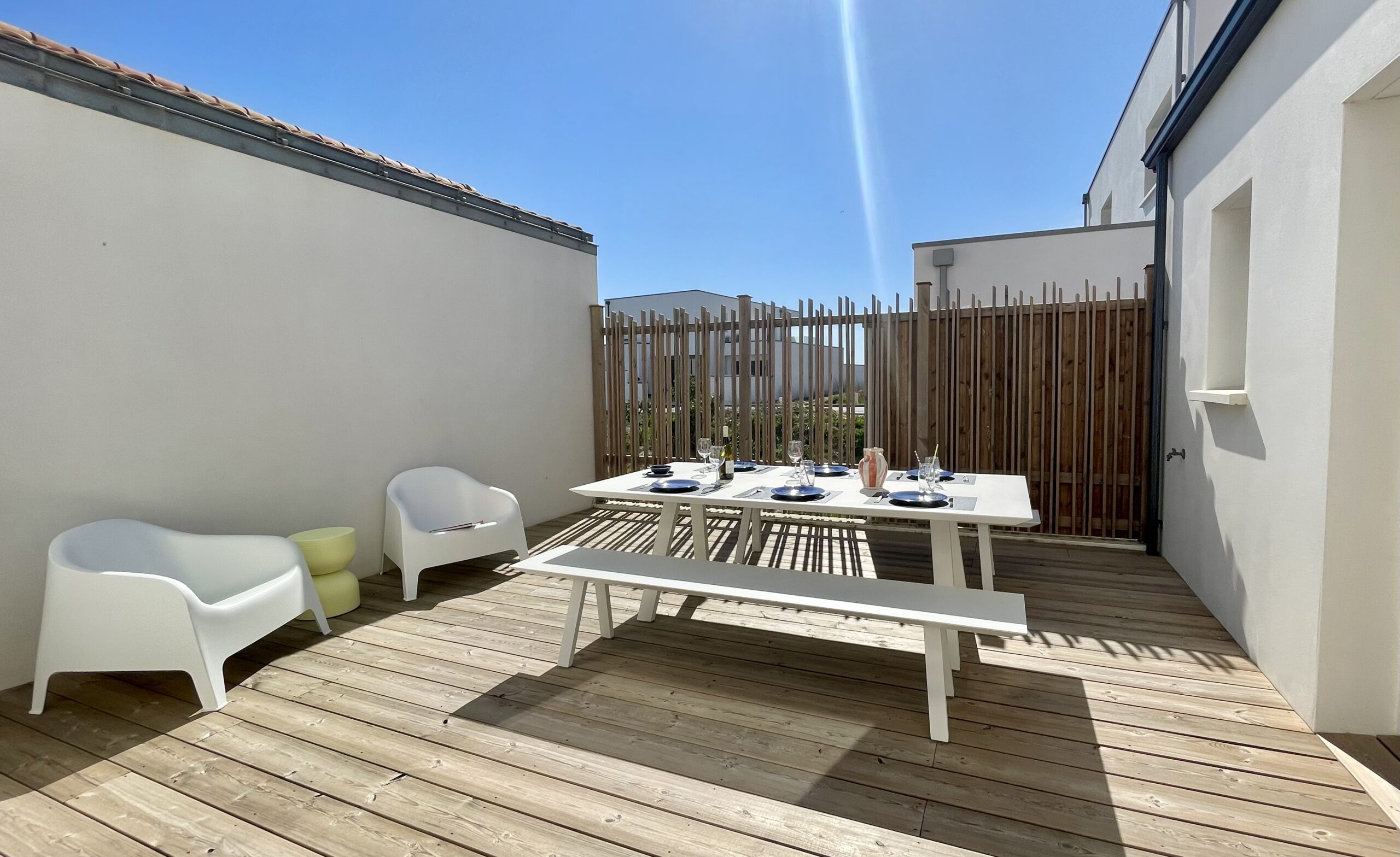 – la terrasse en bois pour y prendre vos repas et qui offrira également un espace de jeux sécurisé pour les enfants.