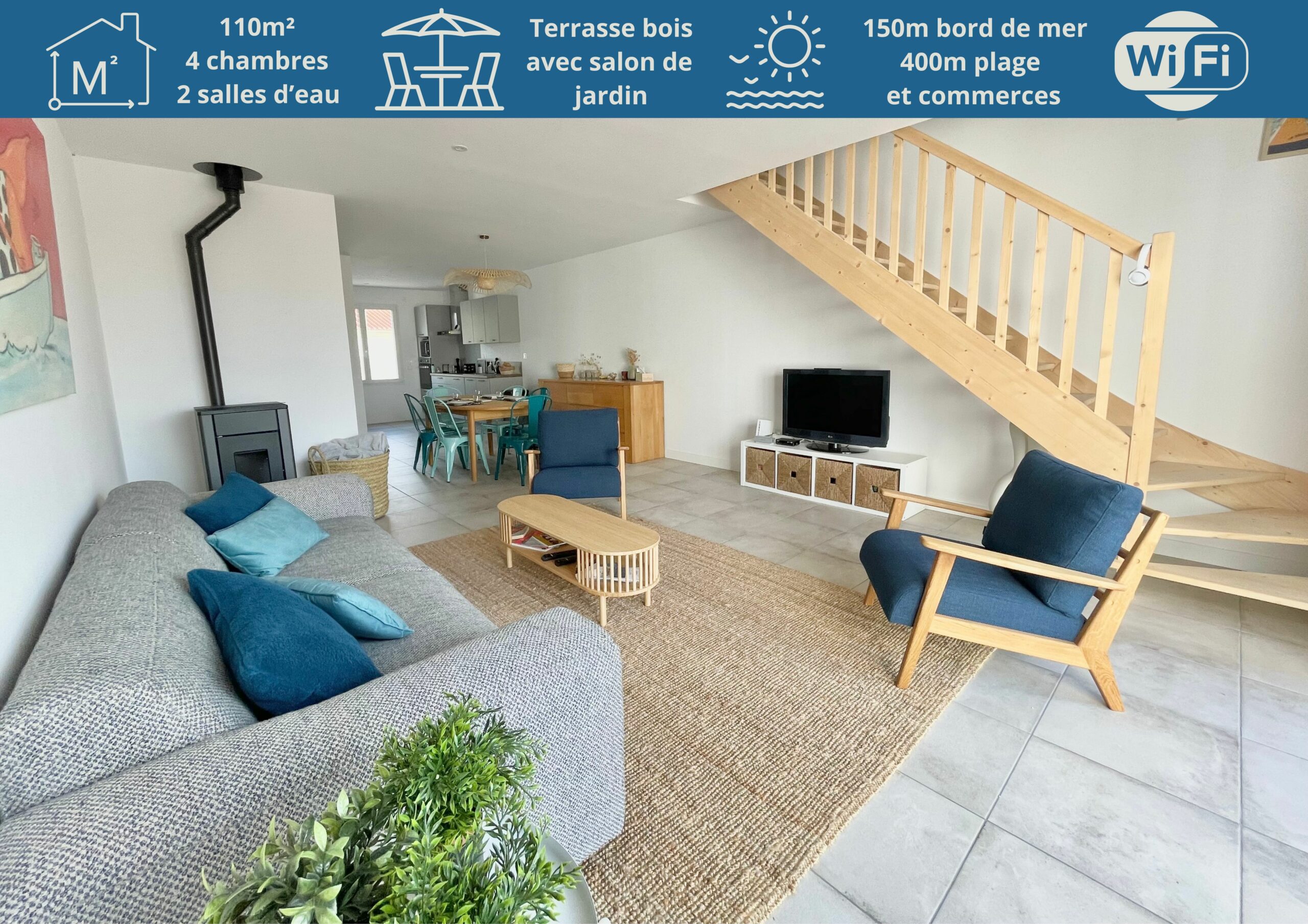 – la situation de la maison: à seulement 150 m du bord de mer, 400m de la plage et quartier de la Parée avec ces commerces, restaurants et animations estivales.