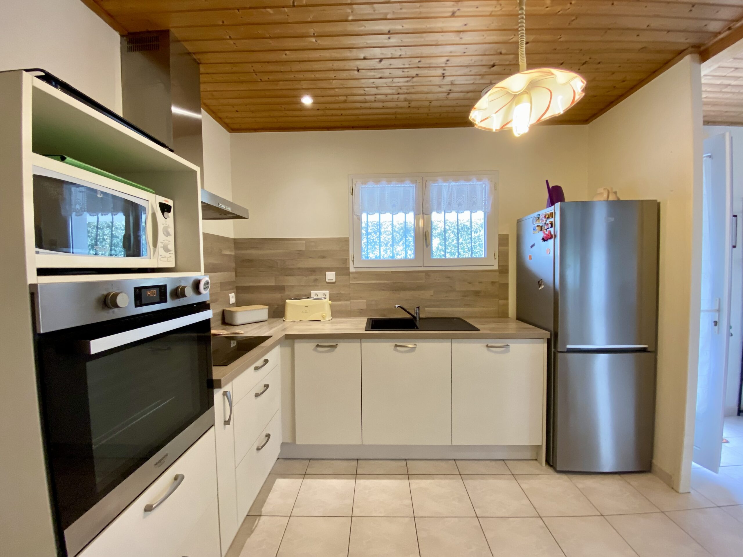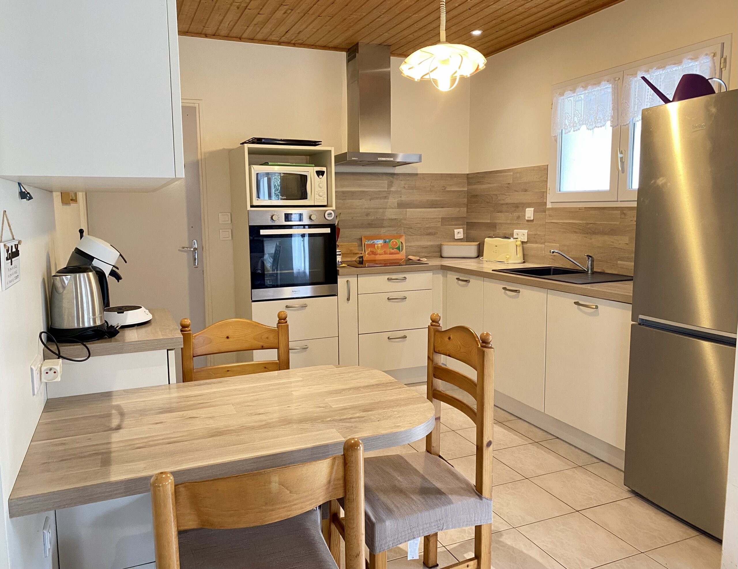 Elle comprend une pièce de vie avec une cuisine aménagée et équipée (plaque induction, hotte, four, micro-ondes, réfrigérateur avec partie congélateur, lave-vaisselle), un coin repas (table, chaises) et un coin détente (canapé et TV écran plat).