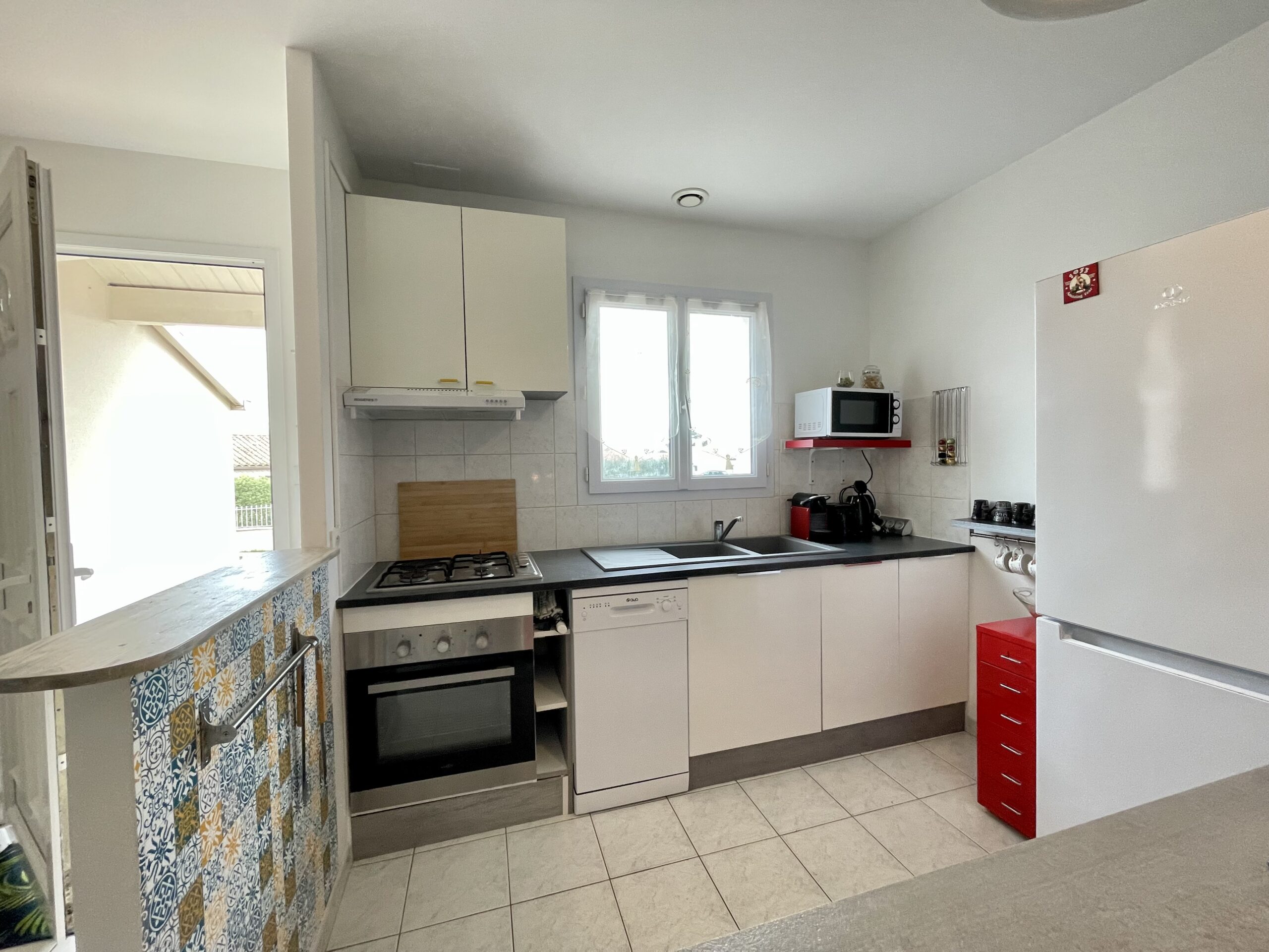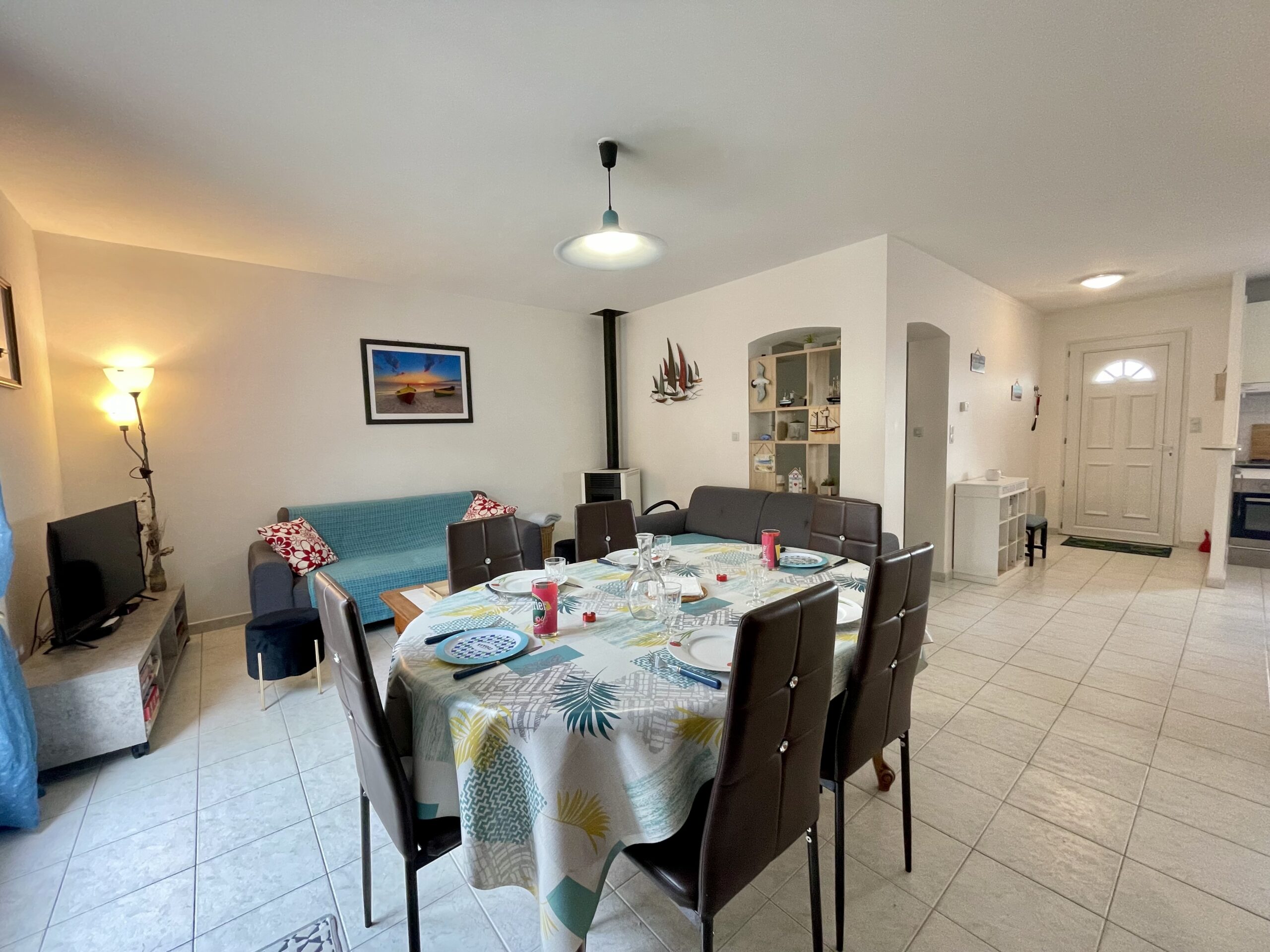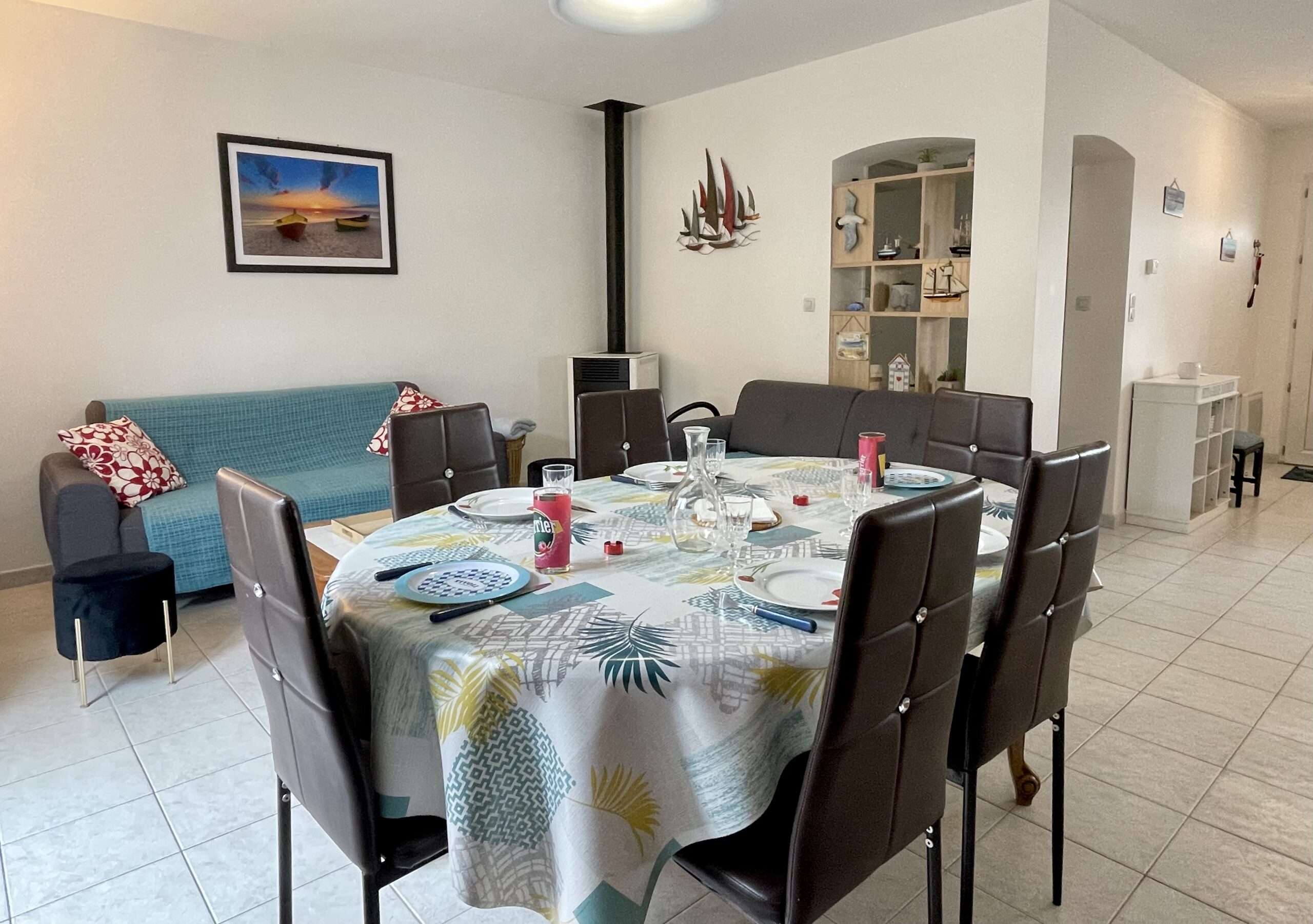 Elle comprend une entrée directe dans la pièce de vie avec une cuisine équipée (four, plaque gaz 4 feux, hotte, lave-vaisselle, micro-ondes, réfrigérateur avec partie congélateur) et ouverte sur le séjour avec coin repas (table, chaises, buffet) et un coin détente (2 canapés, table basse, TV écran plat). Accès WIFI.