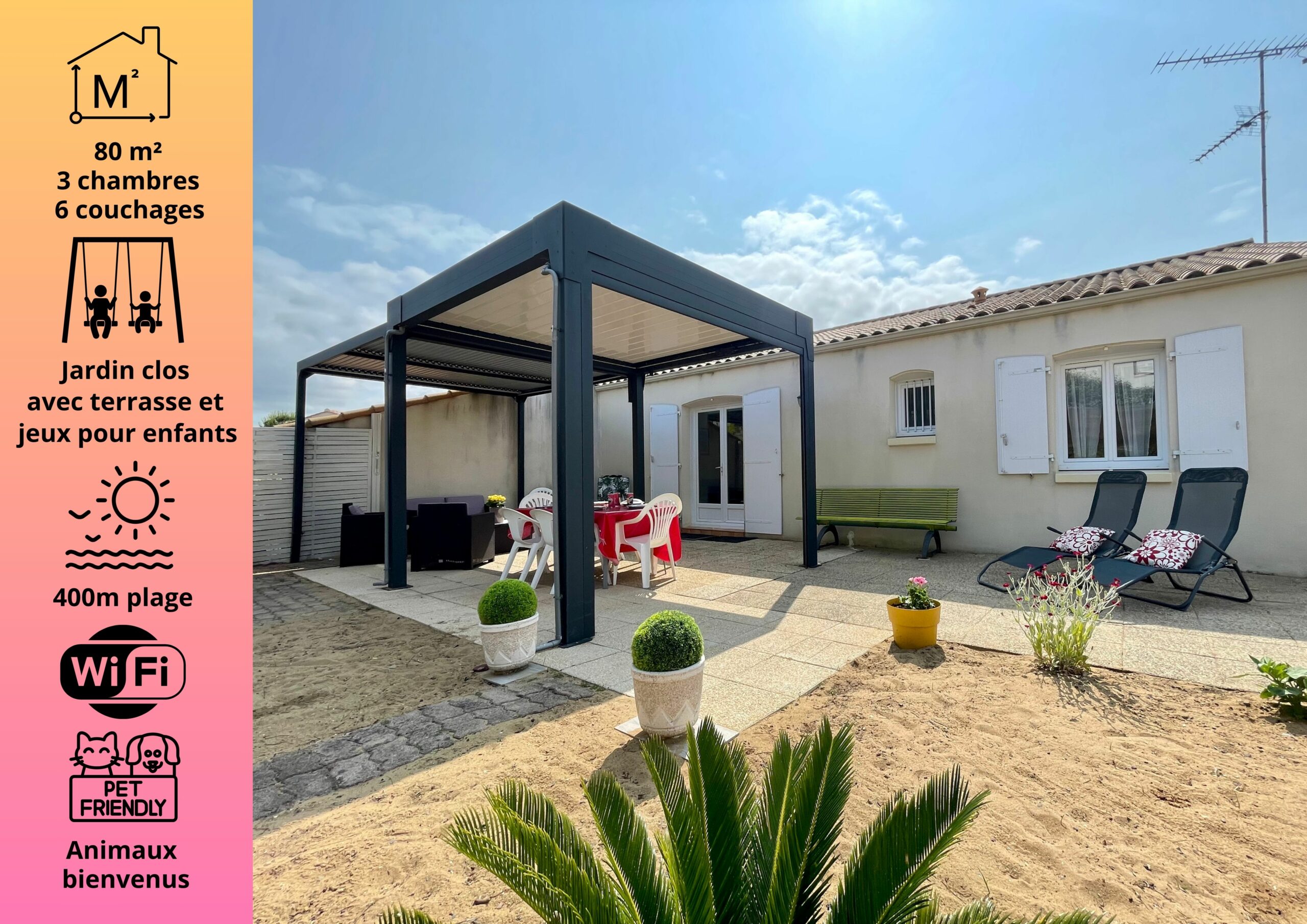 Idéalement située à 400m du quartier de la Parée (plage et commerces) et 1.5km du centre bourg, agréable maison familiale avec jardin clos.
