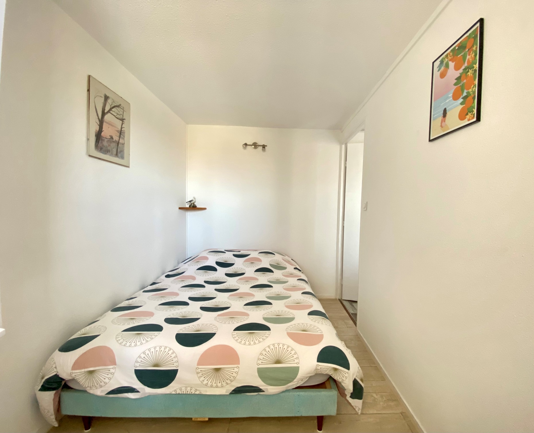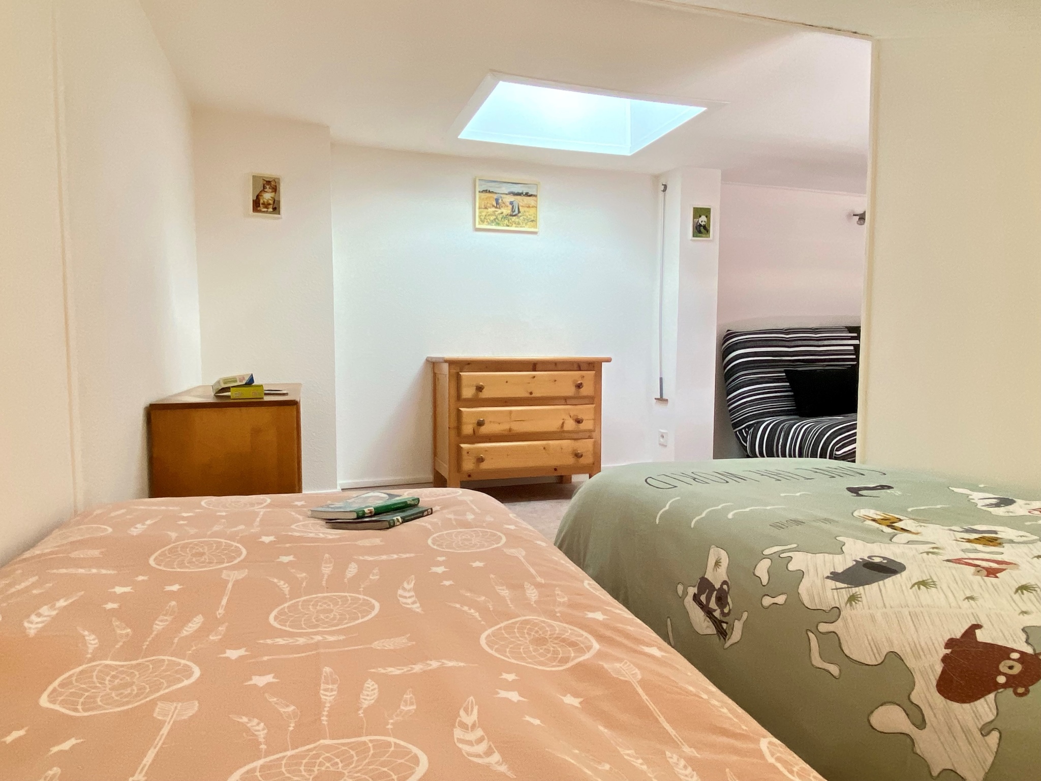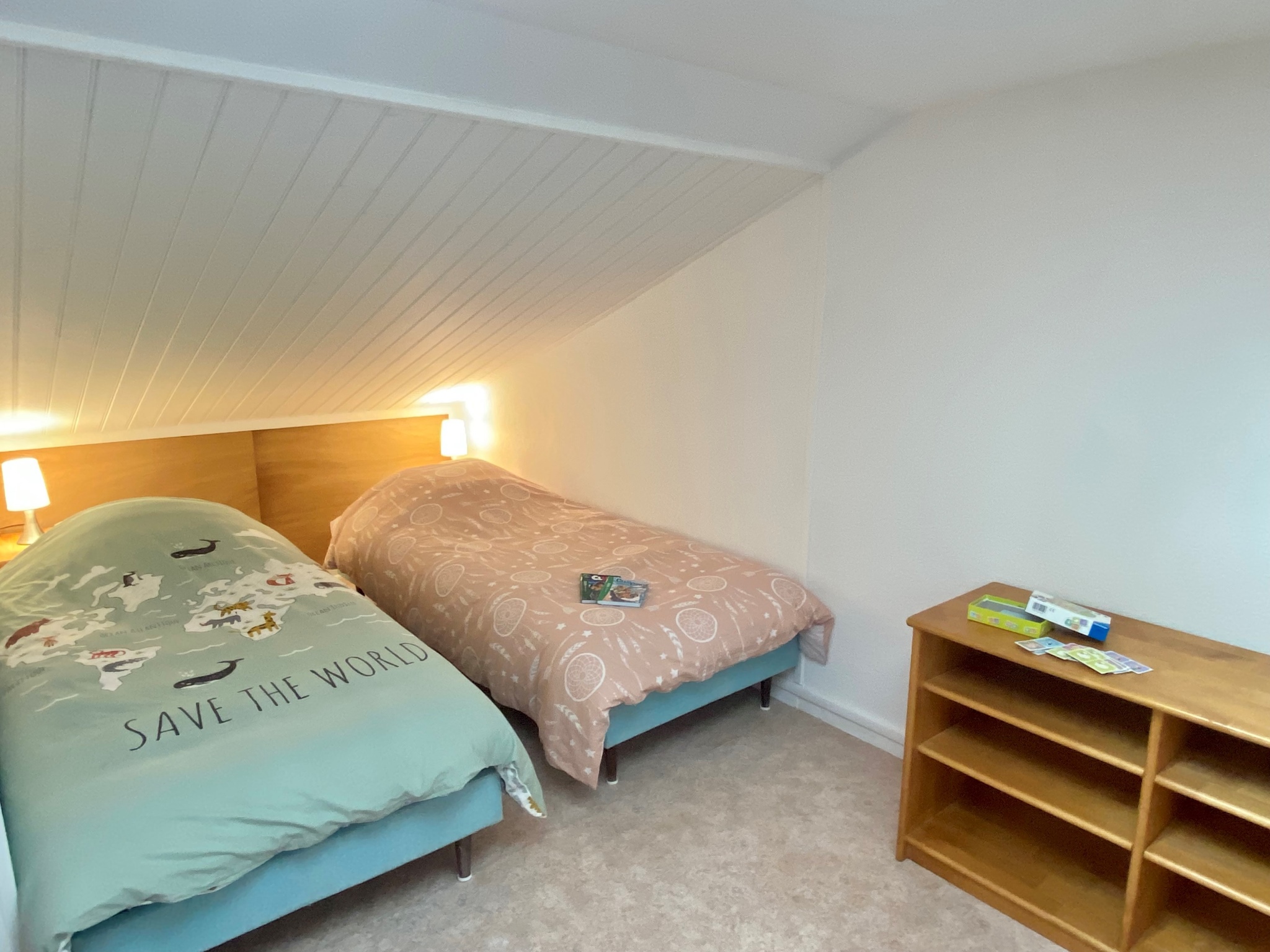 Une mezzanine (hauteur 1.70m, avec velux) avec 2 lits 90 sous rampant et un canapé lit type clic-clac + rangement.