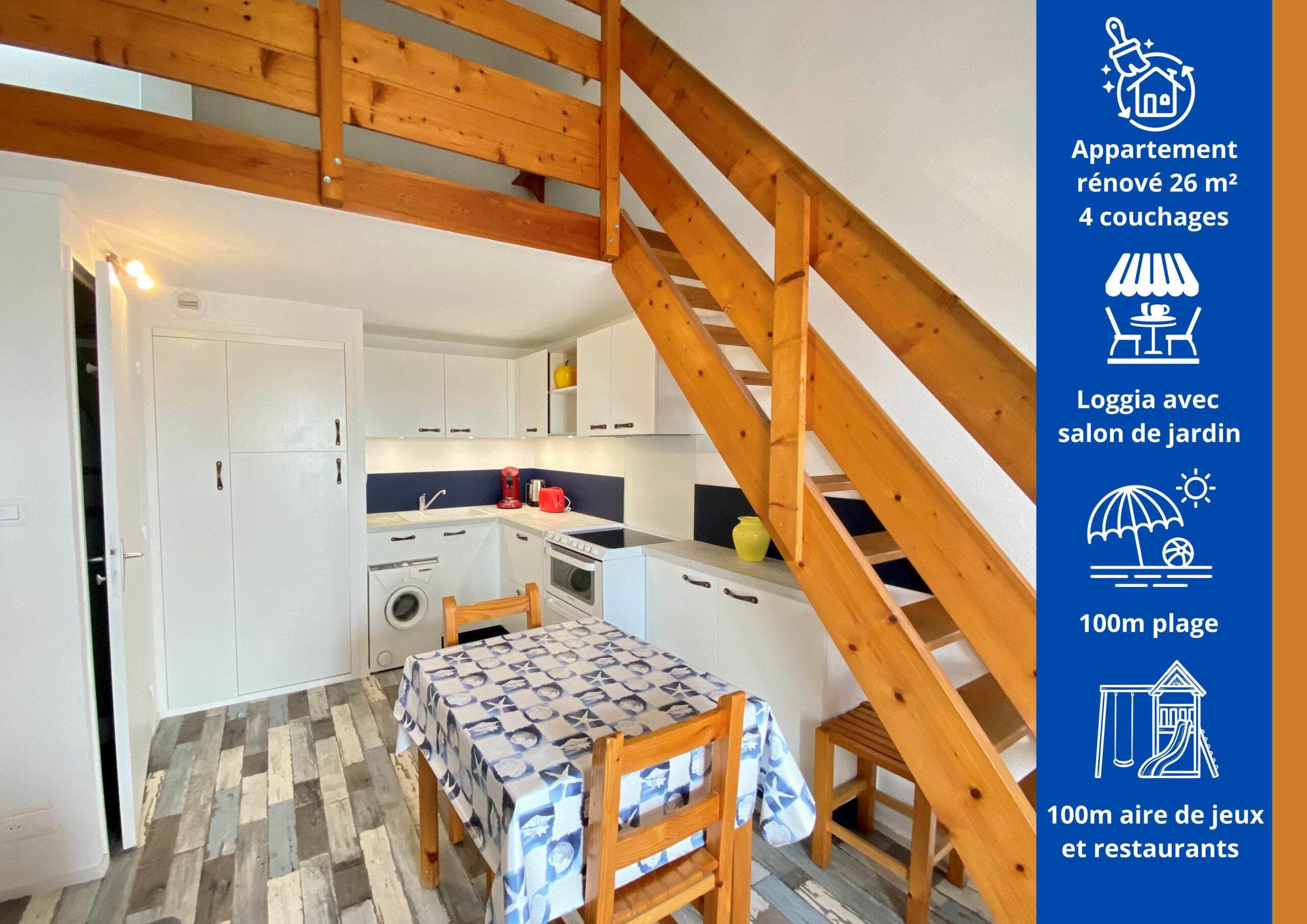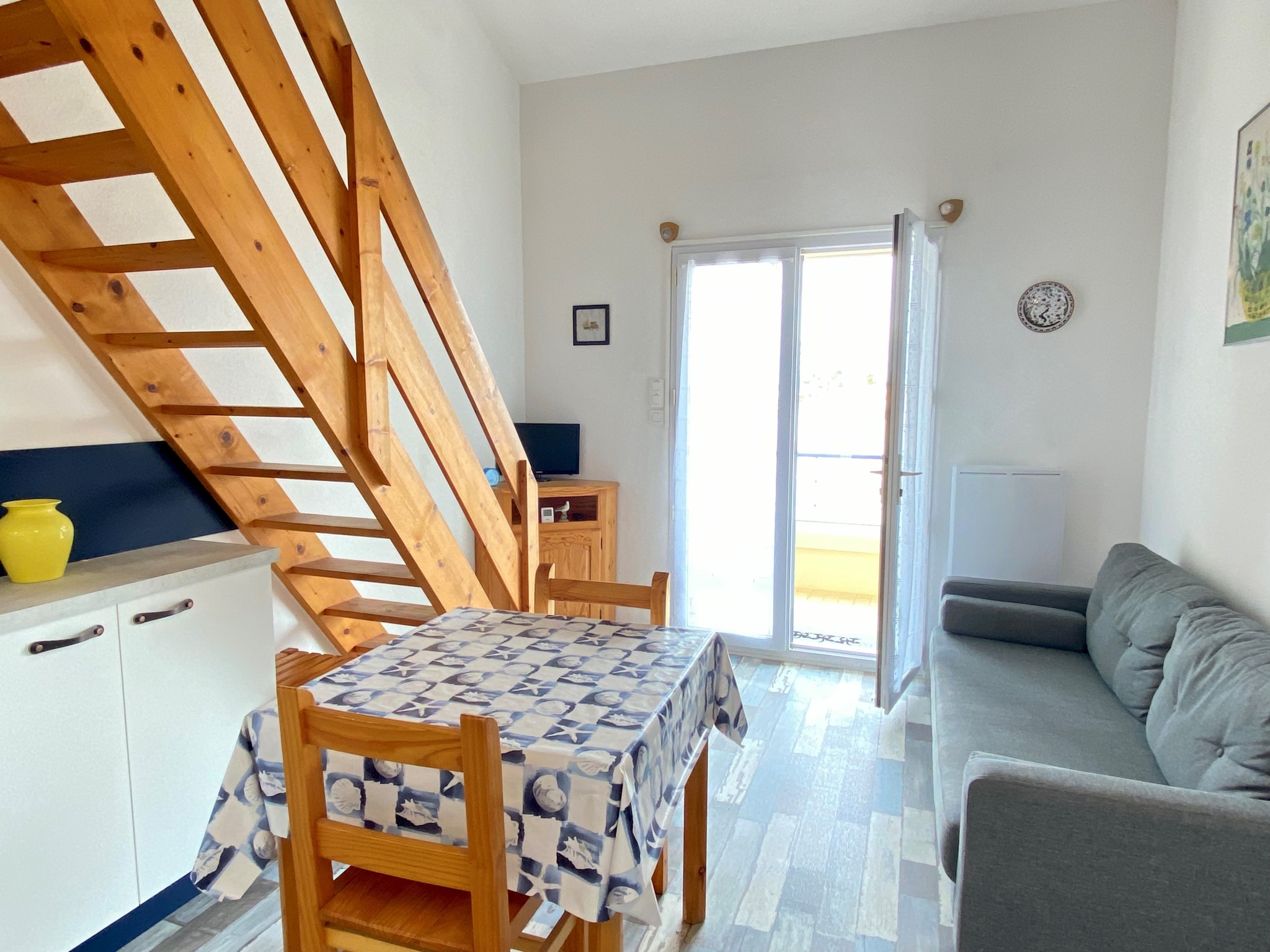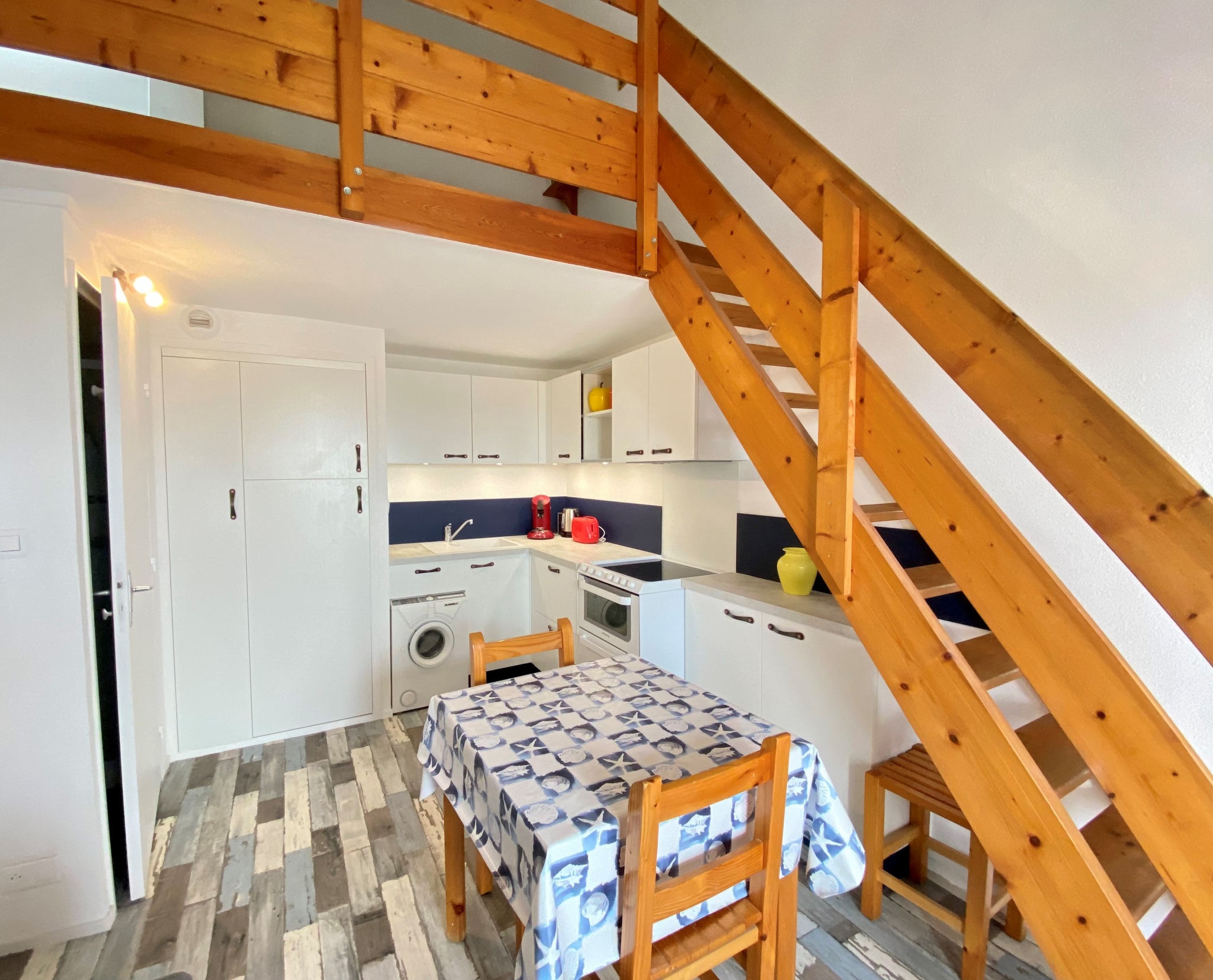 Idéalement situé dans une résidence en 1ère ligne (100m de la mer), appartement au 1er (et dernier) étage comprenant: une entrée par la loggia avec coin repas (table, chaises et plancha de table), pièce de vie avec coin repas (table + chaises), coin détente (canapé, TV) et cuisine équipée (grand réfrigérateur avec partie freezer, micro-ondes, lave-linge 2.5kg, lave-vaisselle 6 couverts, four, plaque vitro et hotte).