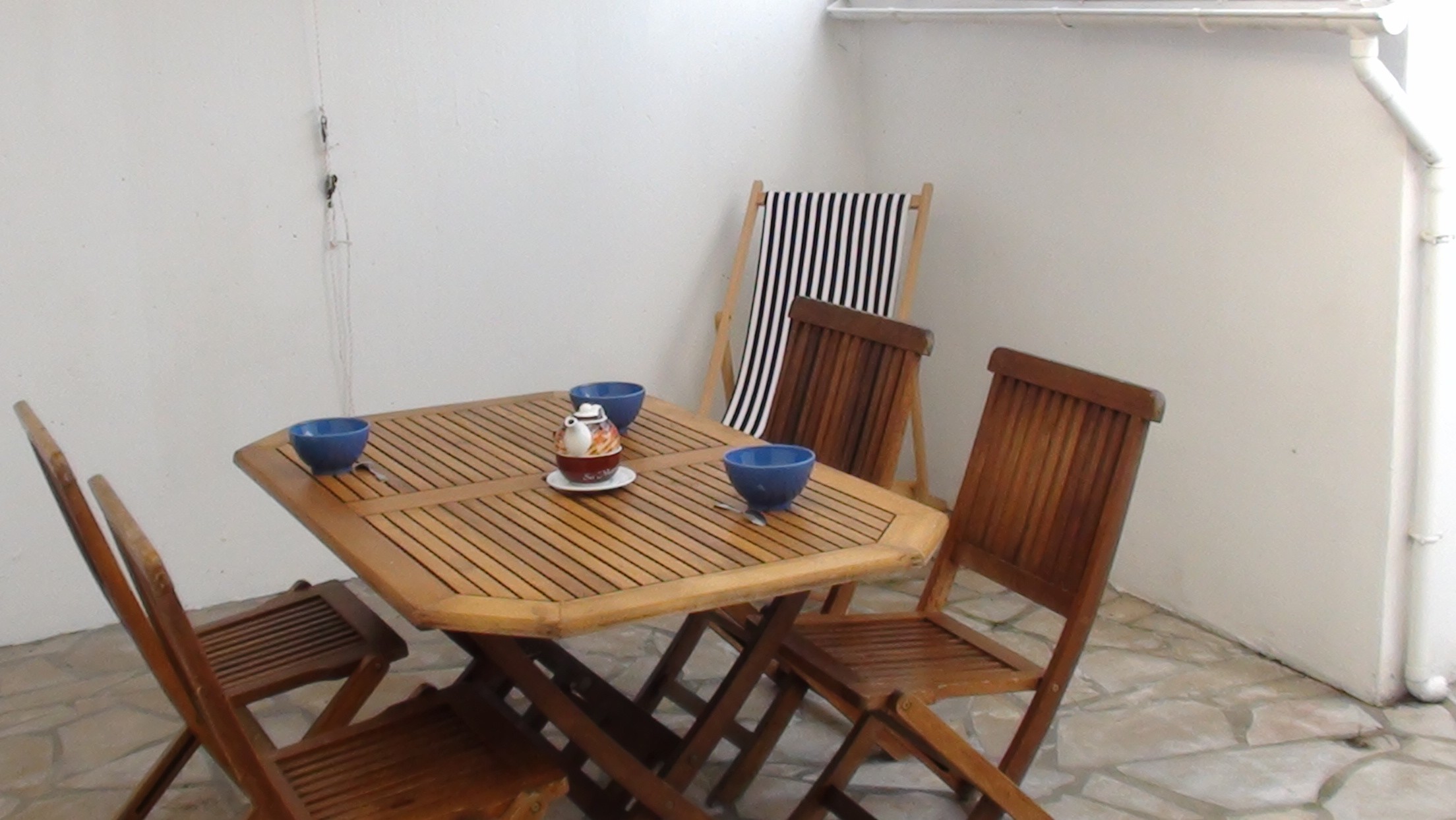 Patio carrelé avec auvent (ouvrant sur espaces verts) avec salon de jardin (table, chaises, barbecue à charbon).