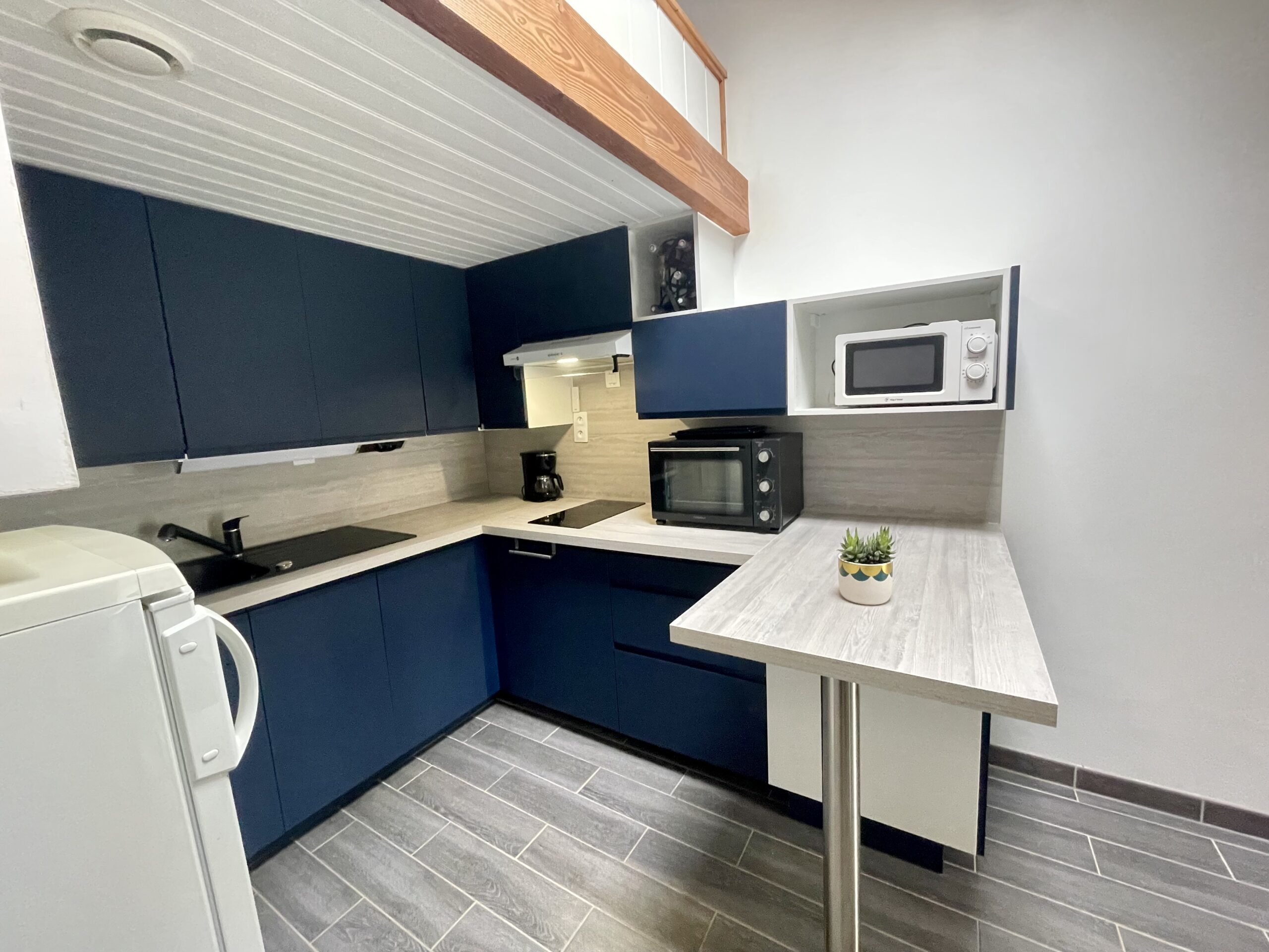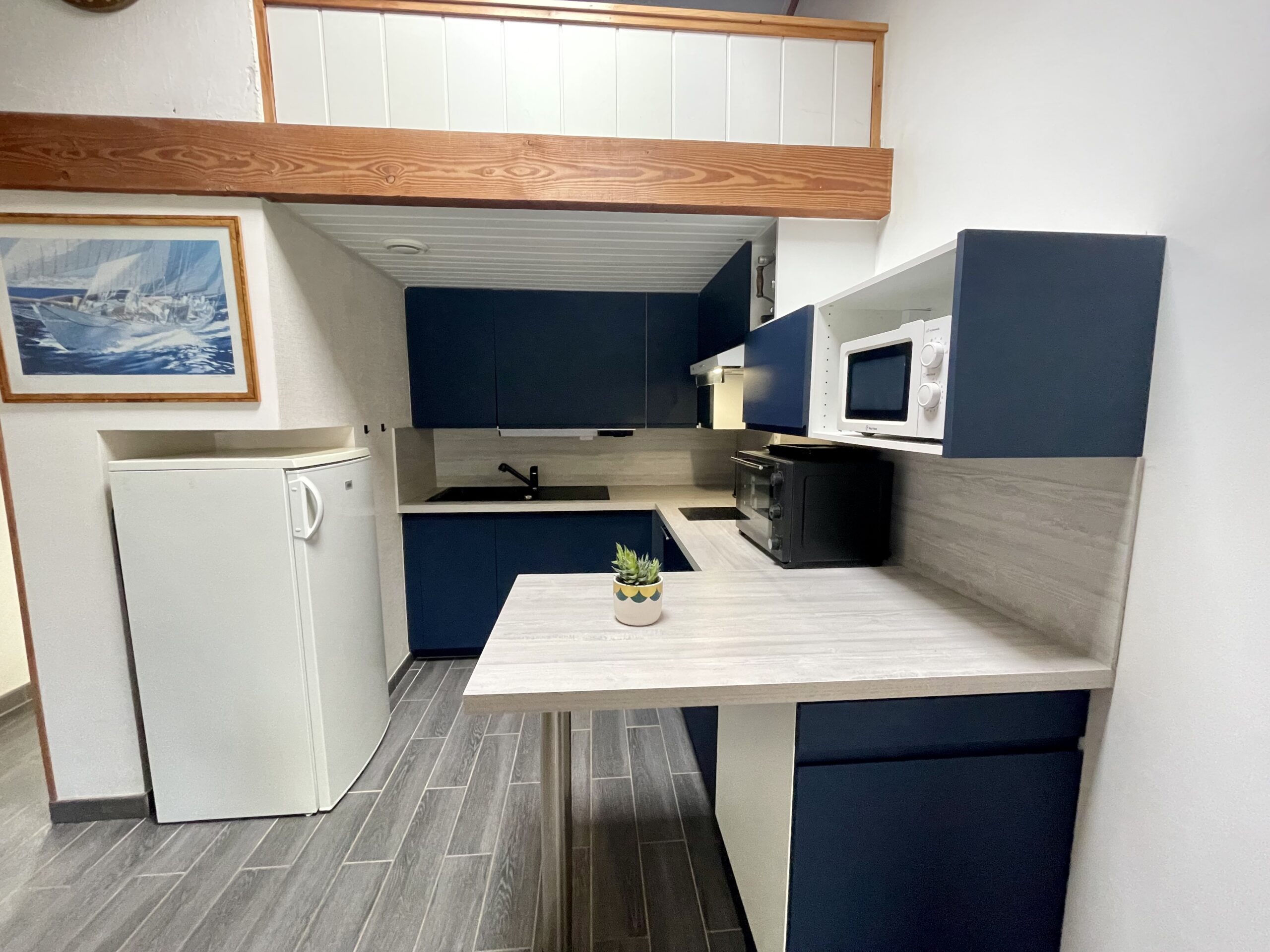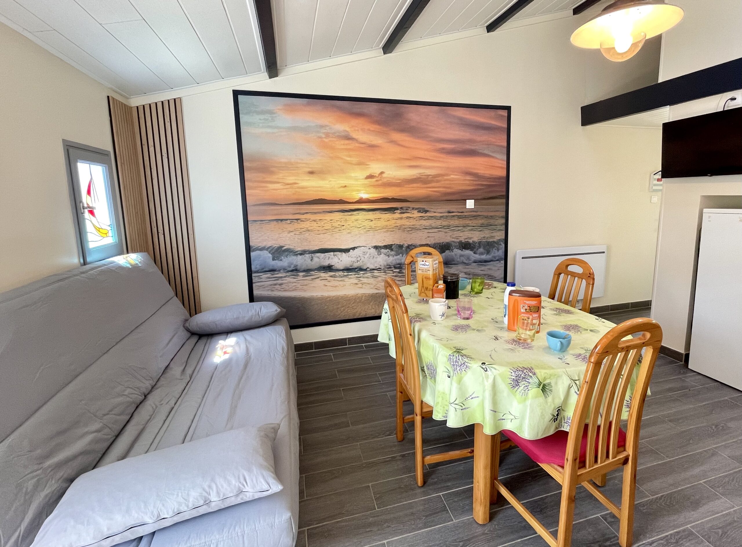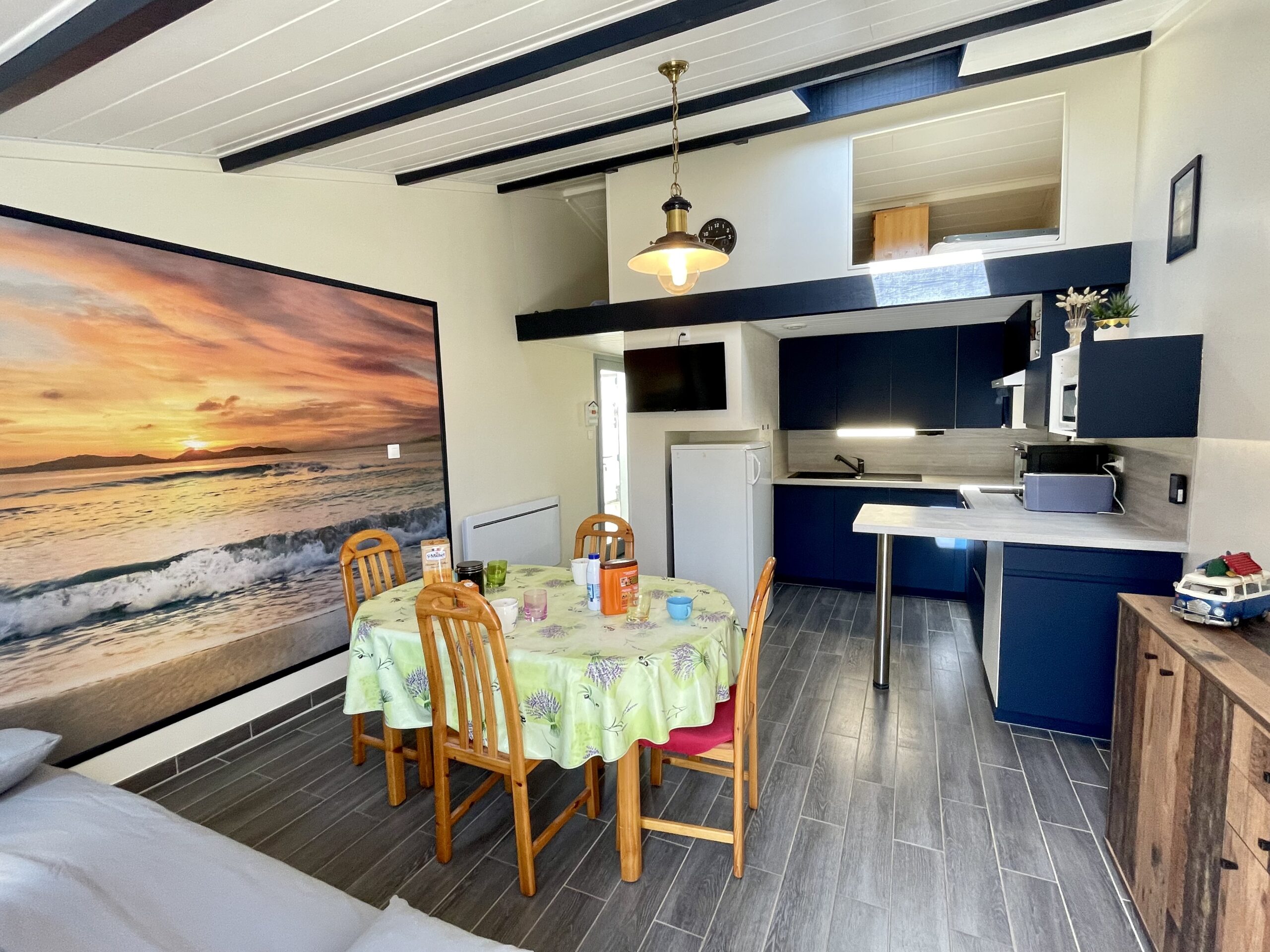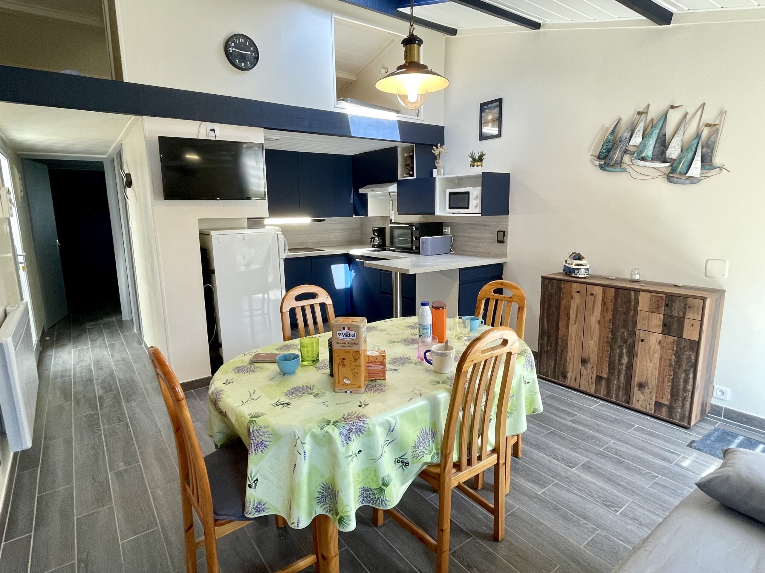 Dans une résidence de vacances avec piscine collective chauffée (ouverte entre mi-juin et mi-septembre), tennis, aire de jeux, terrain de pétanque et espaces verts communs, agréable Ferme Marine récemment rénovée de type 2 comprenant un séjour avec coin repas (table, chaises, buffet), coin repos (canapé lit type « clic-clac », TV écran plat) et une cuisine aménagée et équipée (plaque induction, hotte, four, lave-vaisselle, micro-ondes, réfrigérateur avec partie freezer).
