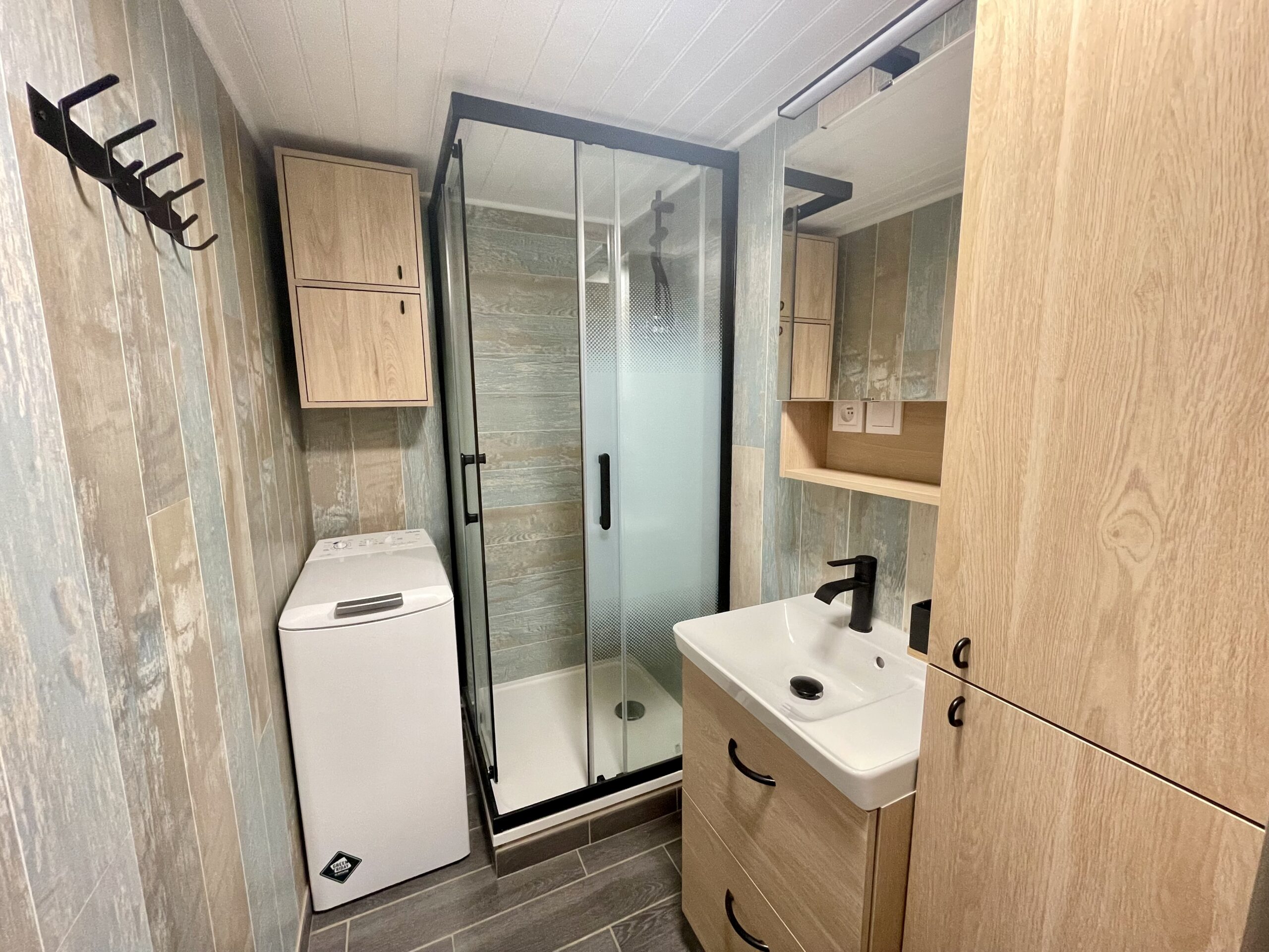Un dégagement dessert une chambre (lit double 140, placard, TV écran plat), une salle d’eau avec (douche, meuble vasque, lave-linge, rangement) et toilettes séparés.