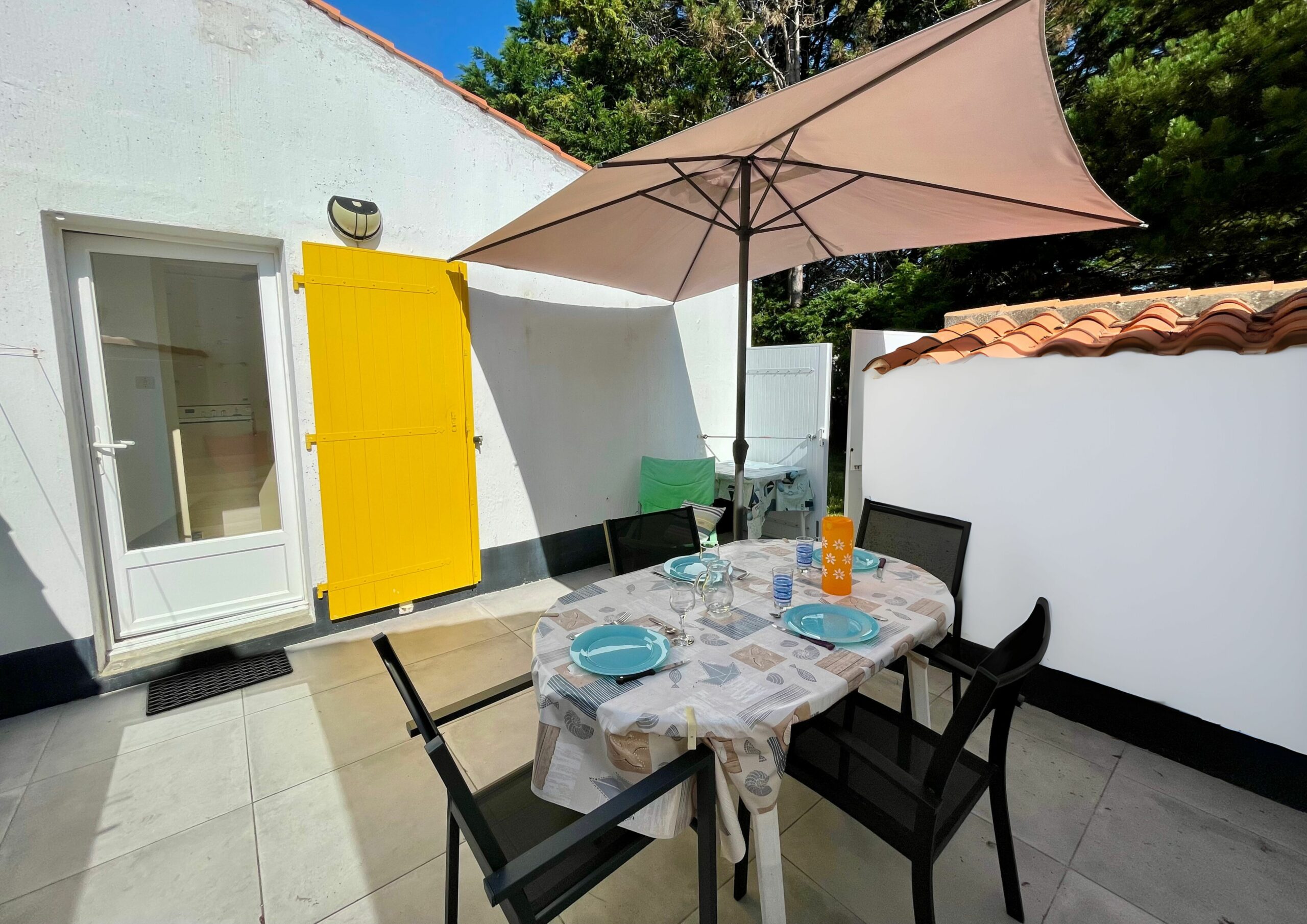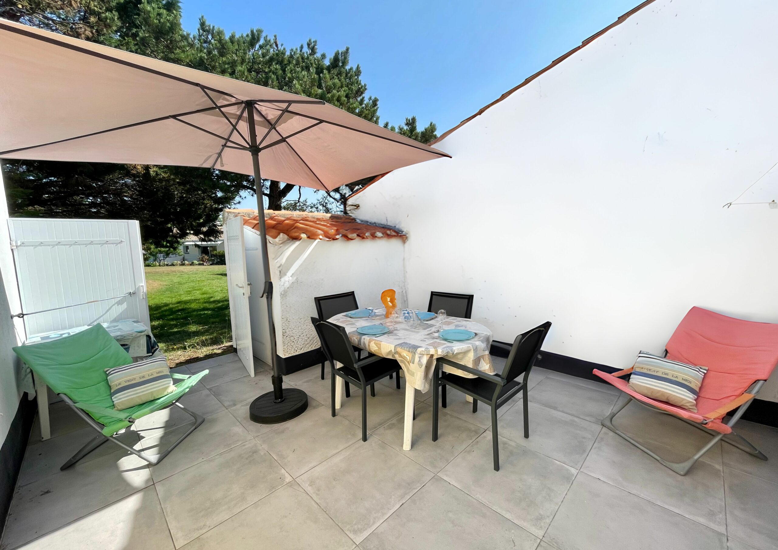 Patio fermé et dallé avec salon de jardin (table, chaises, barbecue électrique, 2 transats, parasol). Parking privatif.