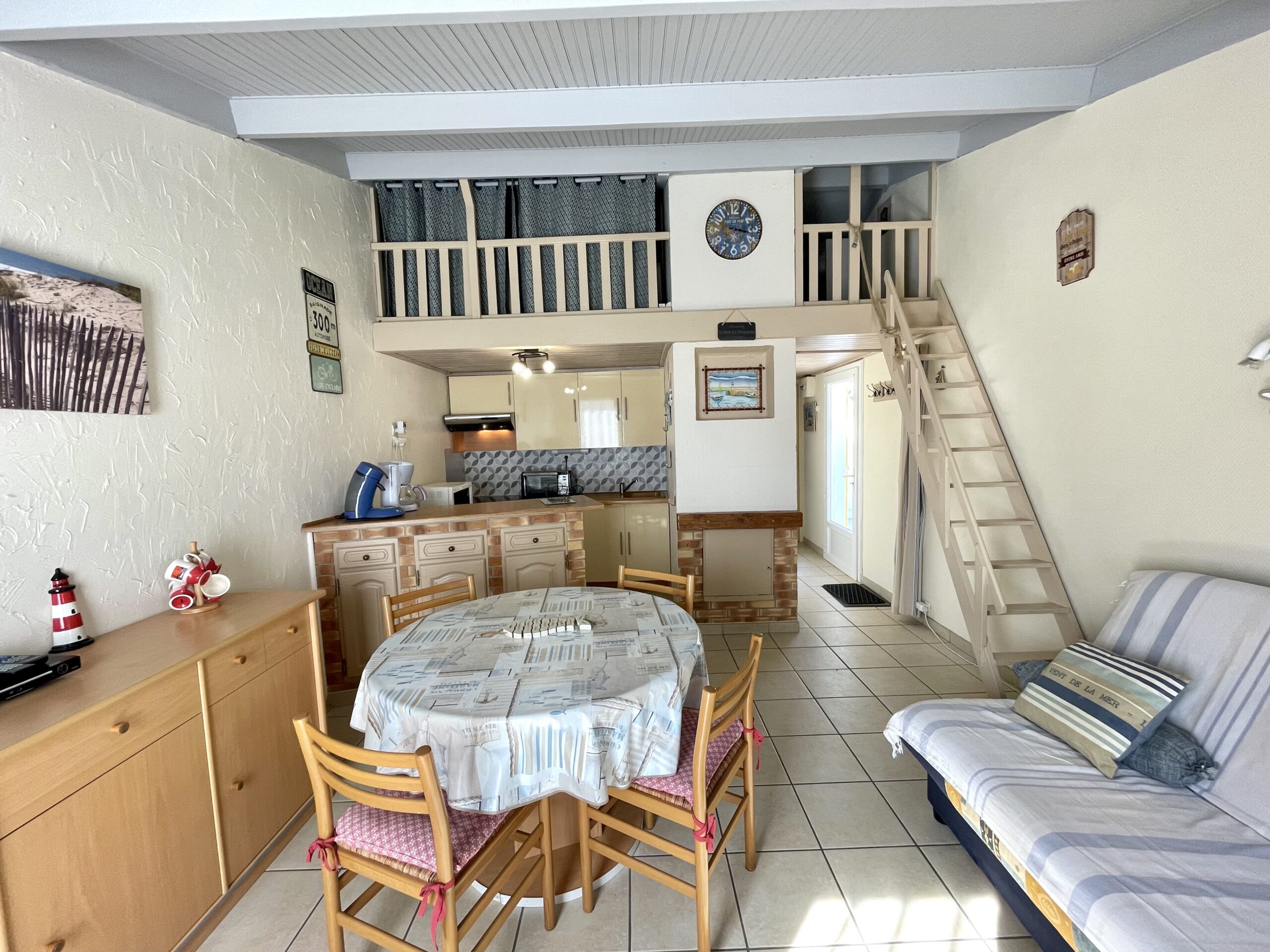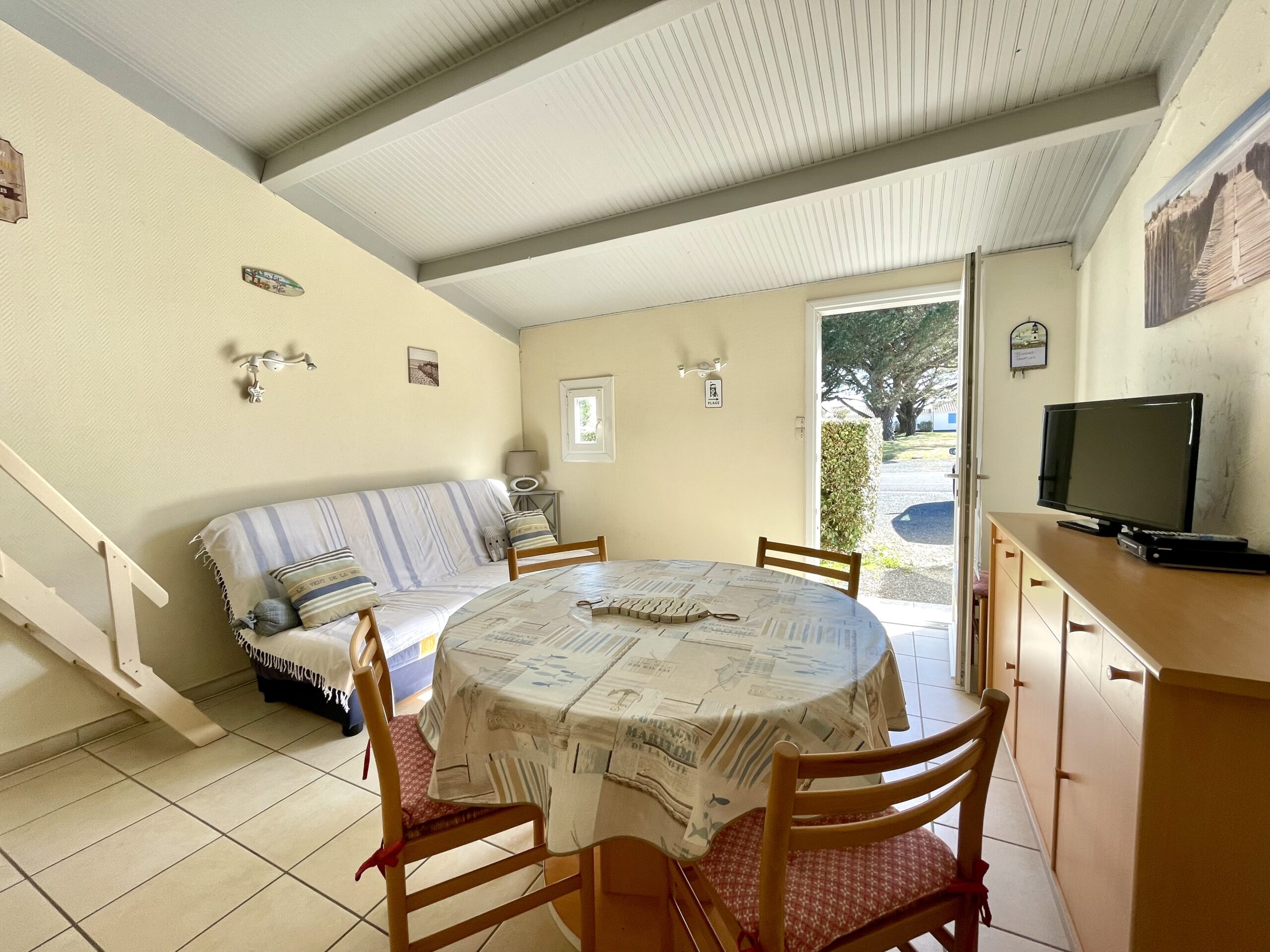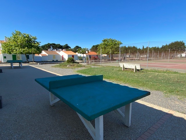 Dans résidence de vacances avec piscine collective chauffée (ouverte entre mi-juin et mi-septembre), terrains de tennis, aire de jeux, grands espaces verts et petits commerces, maison de type 2 de plain-pied comprenant une entrée dans pièce de vie (canapé clic-clac, table, chaises, TV écran plat, buffet), une cuisine aménagée et équipée ouverte sur séjour (réfrigérateur TOP, petit congélateur, lave-vaisselle, plaques induction, mini -four, micro-ondes), un dégagement dessert les WC, la salle d’eau (douche, lavabo, porte serviettes, rangements, lave-linge) et la chambre (1 x 140 cm + placards).