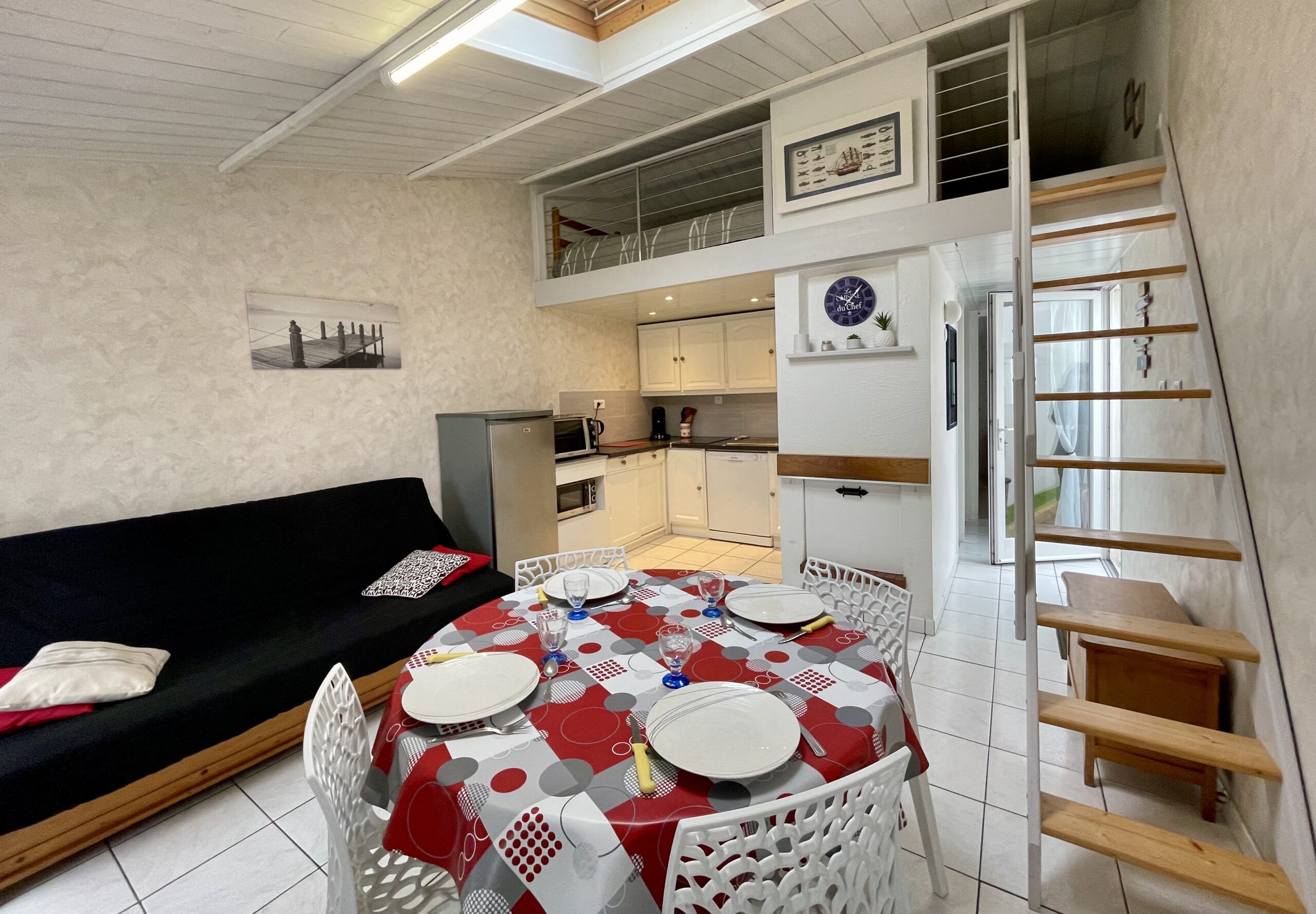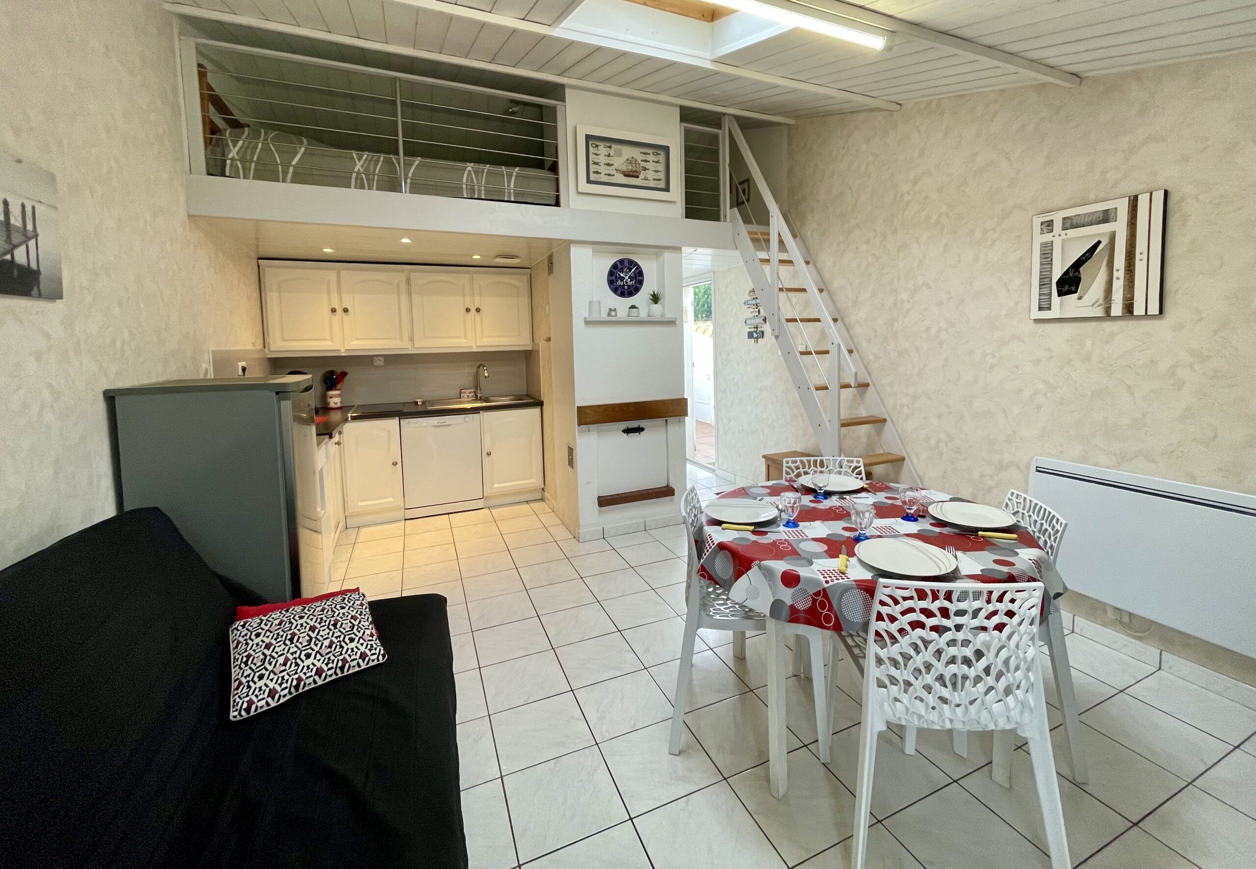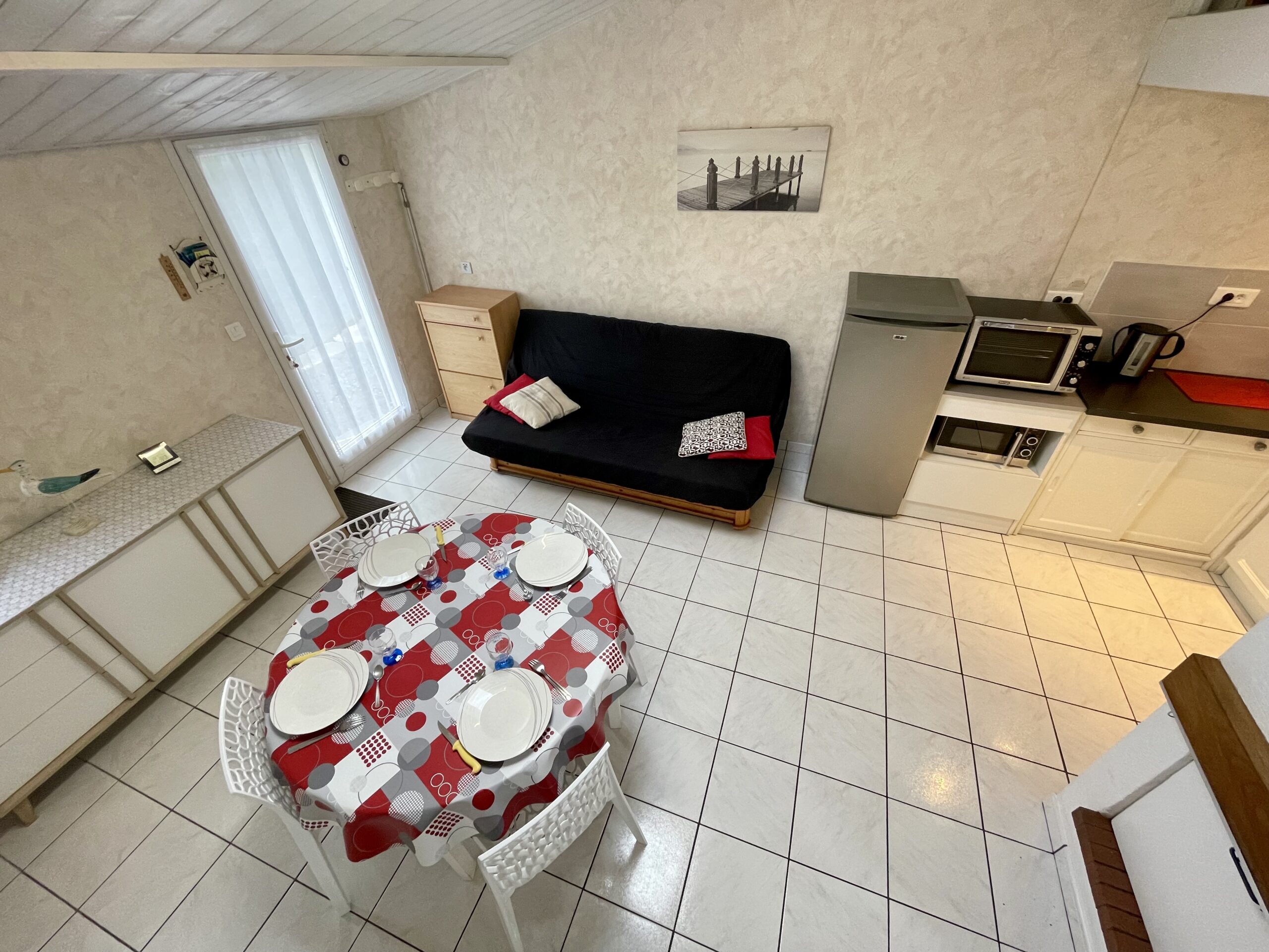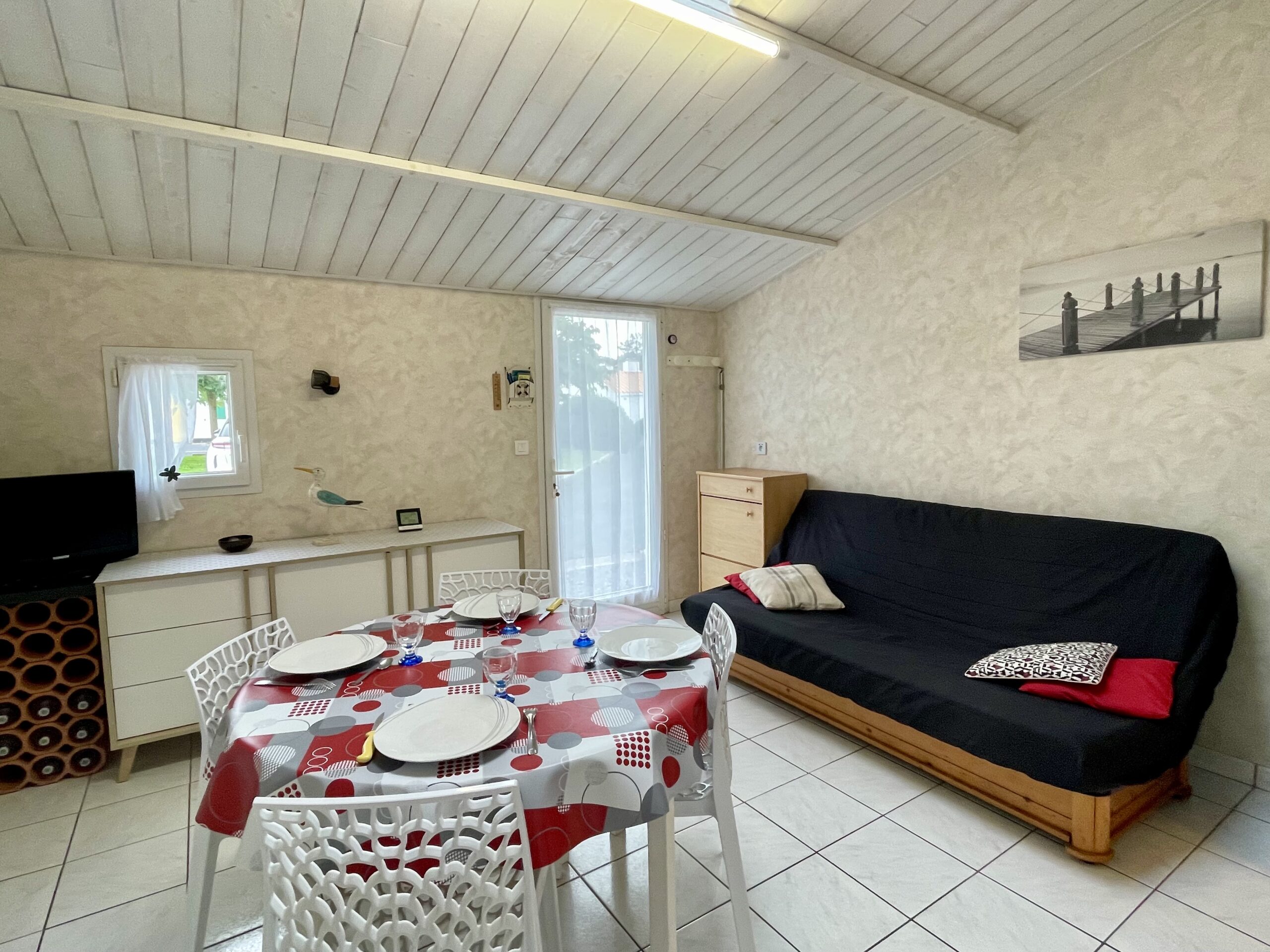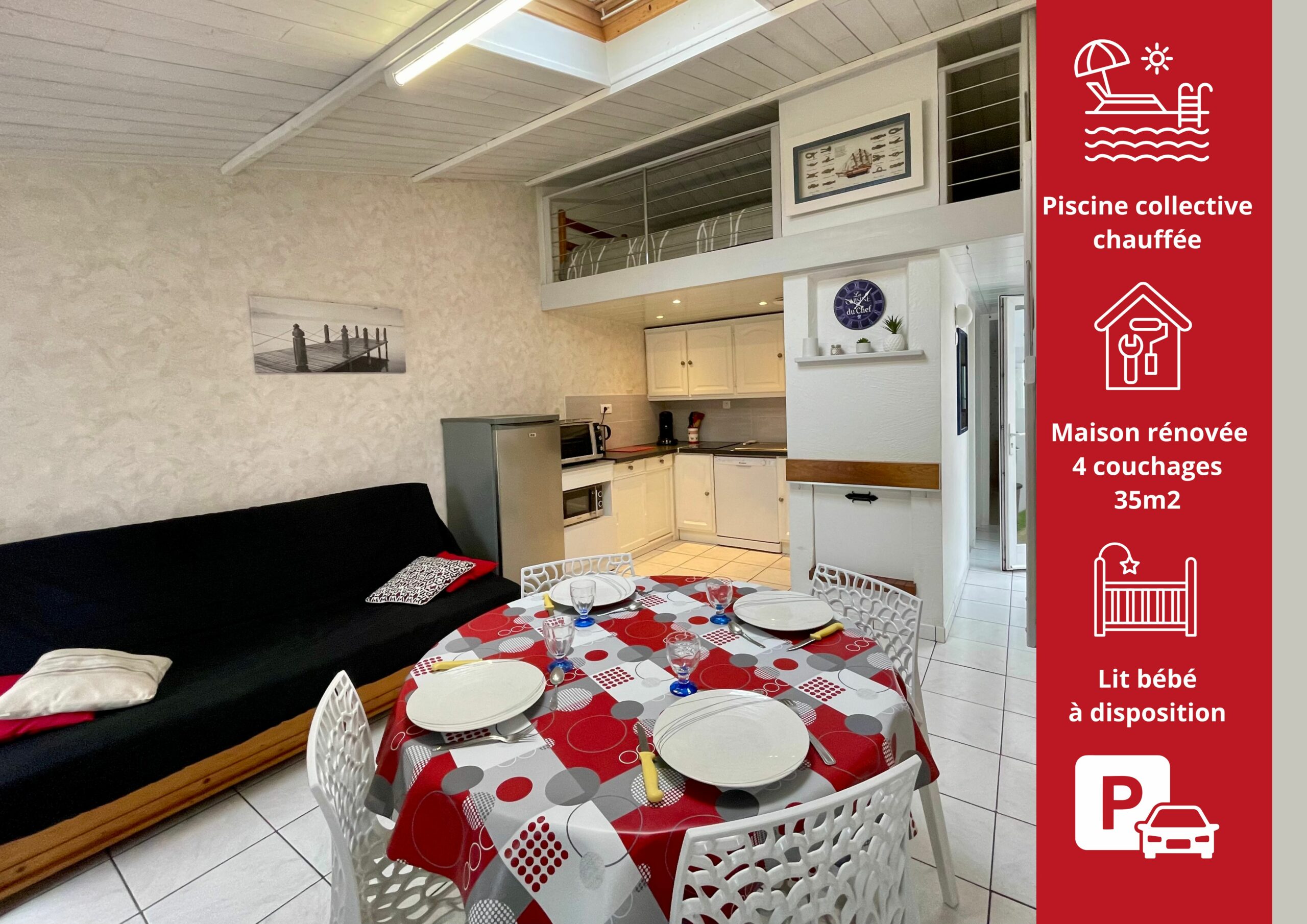 Dans une résidence de vacances avec piscine collective chauffée (ouverte entre mi-juin et mi-septembre), tennis, aire de jeux, terrain de pétanque et espaces verts communs, agréable Ferme Marine rénovée de type 2 comprenant un séjour avec coin repas (table, chaises, buffet bas), coin repos (canapé clic-clac, TV écran plat) et cuisine aménagée et équipée (plaque induction, four, micro-ondes, lave-vaisselle, réfrigérateur avec partie congélateur).