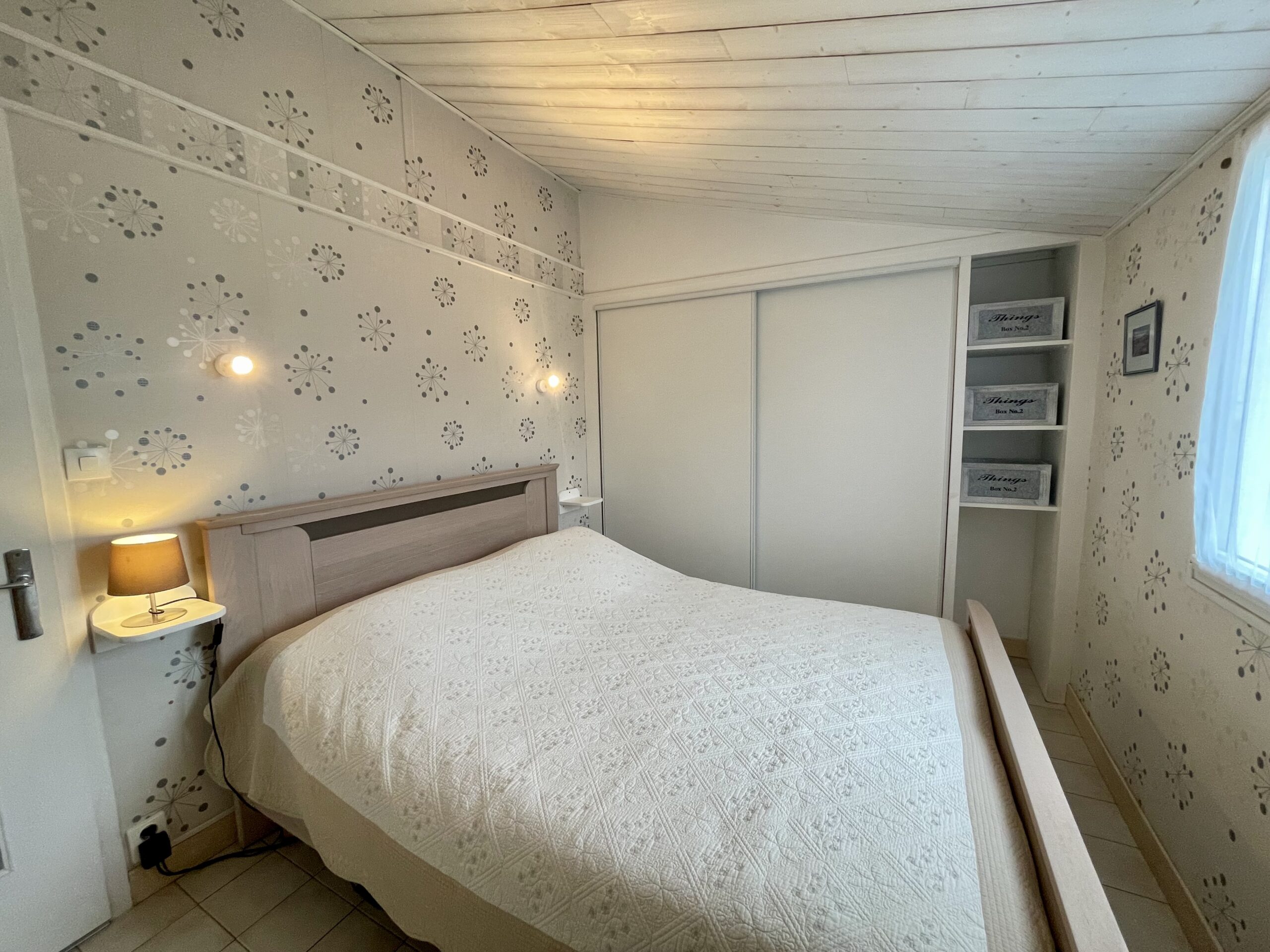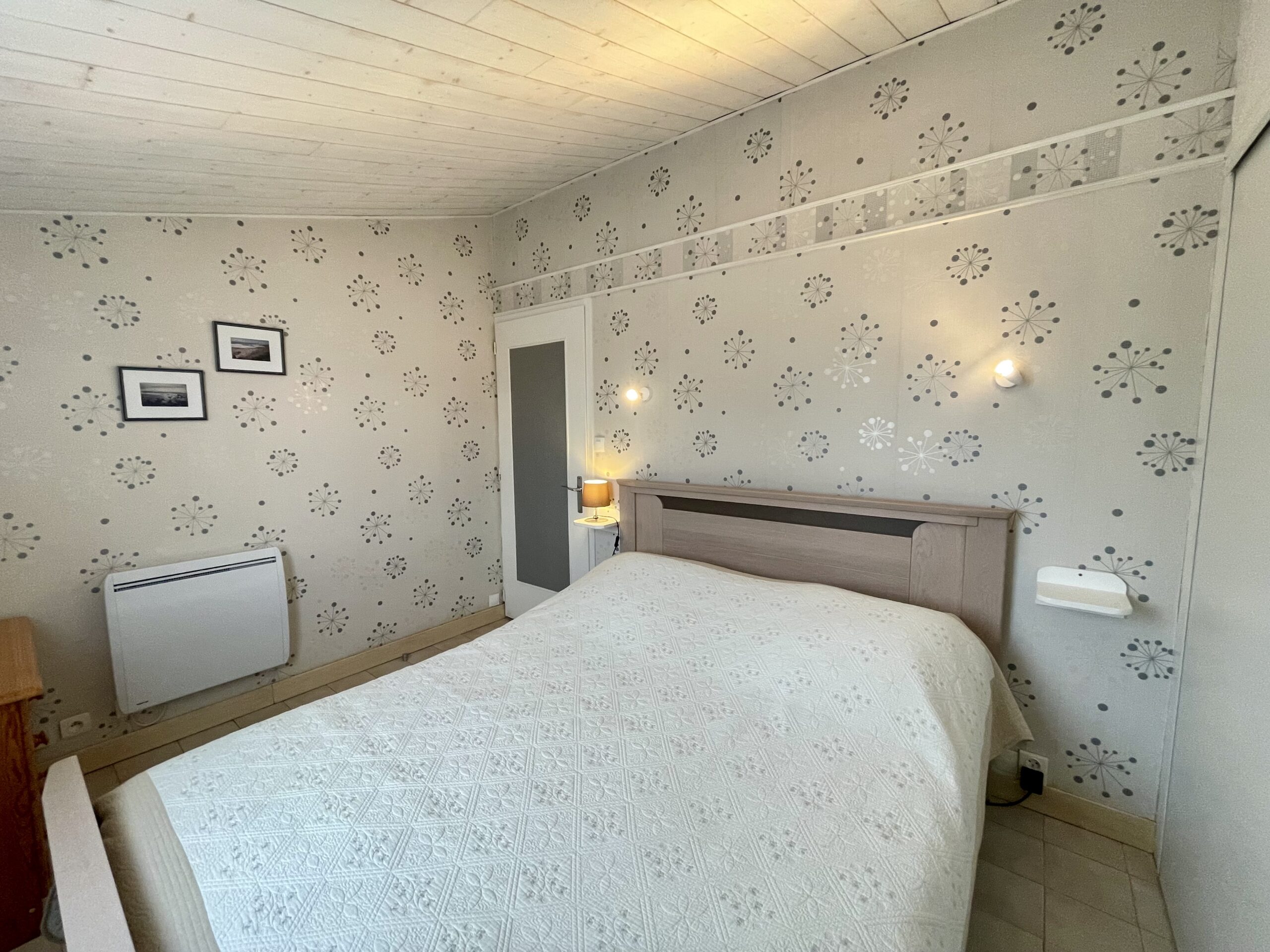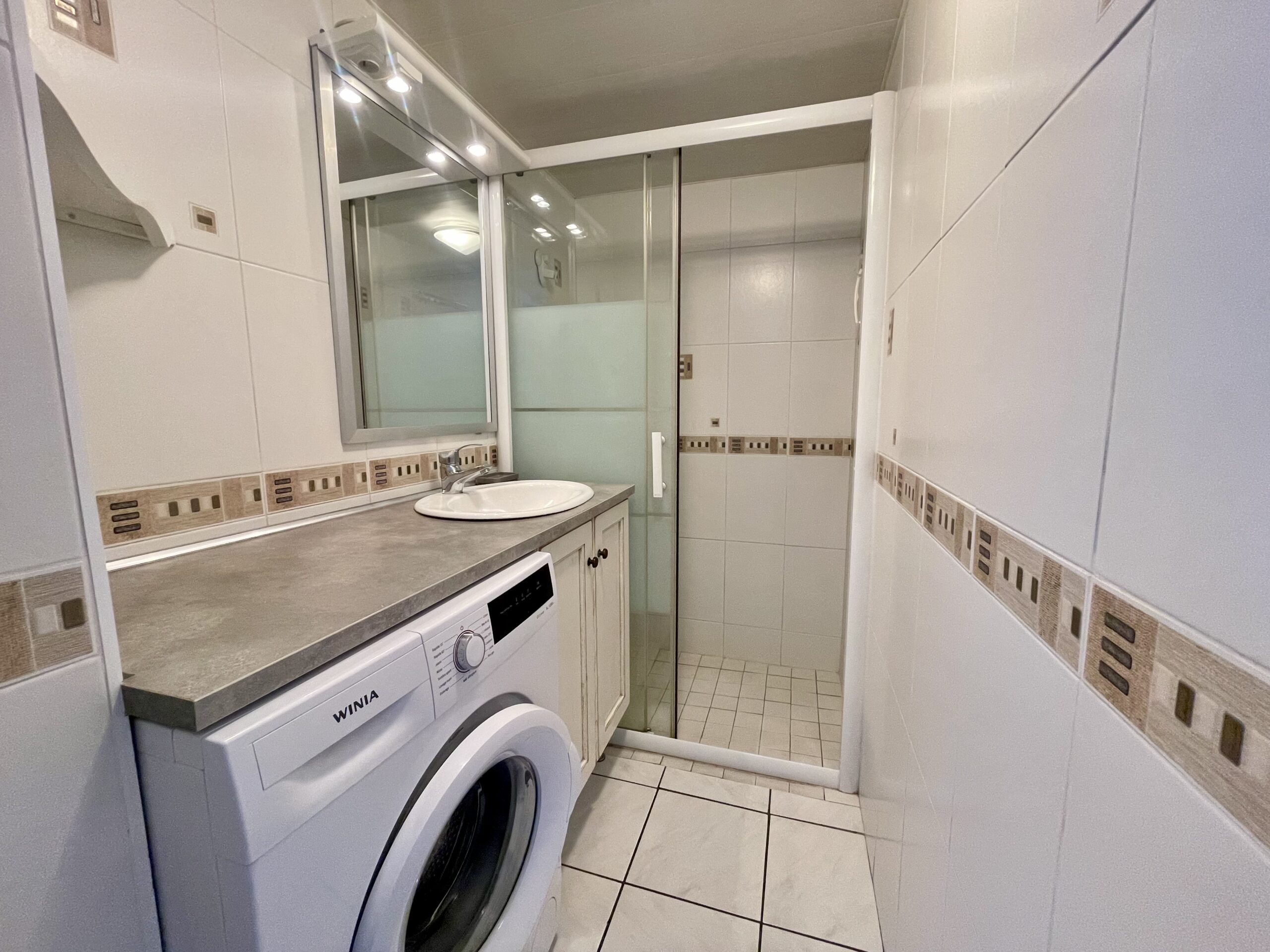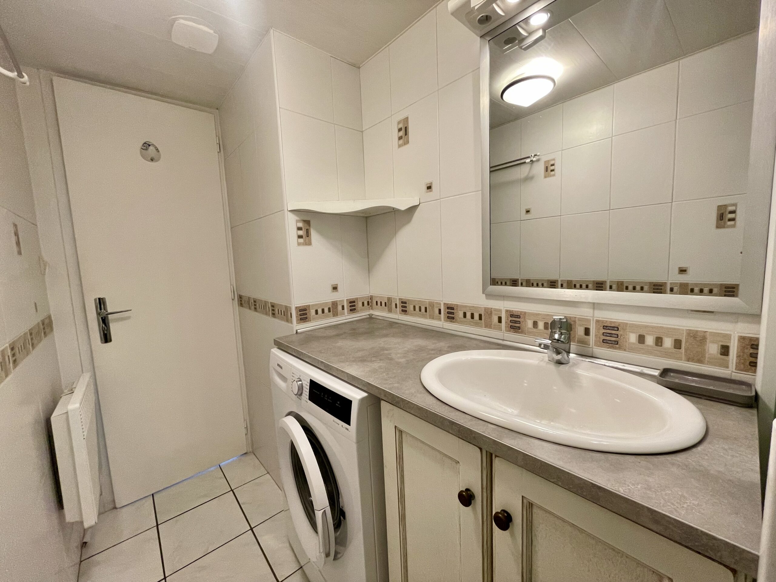 Un dégagement dessert une chambre (1 x 160 cm + placard), une salle d’eau avec lave-linge (douche, meuble vasque et rangement) et toilettes séparés.