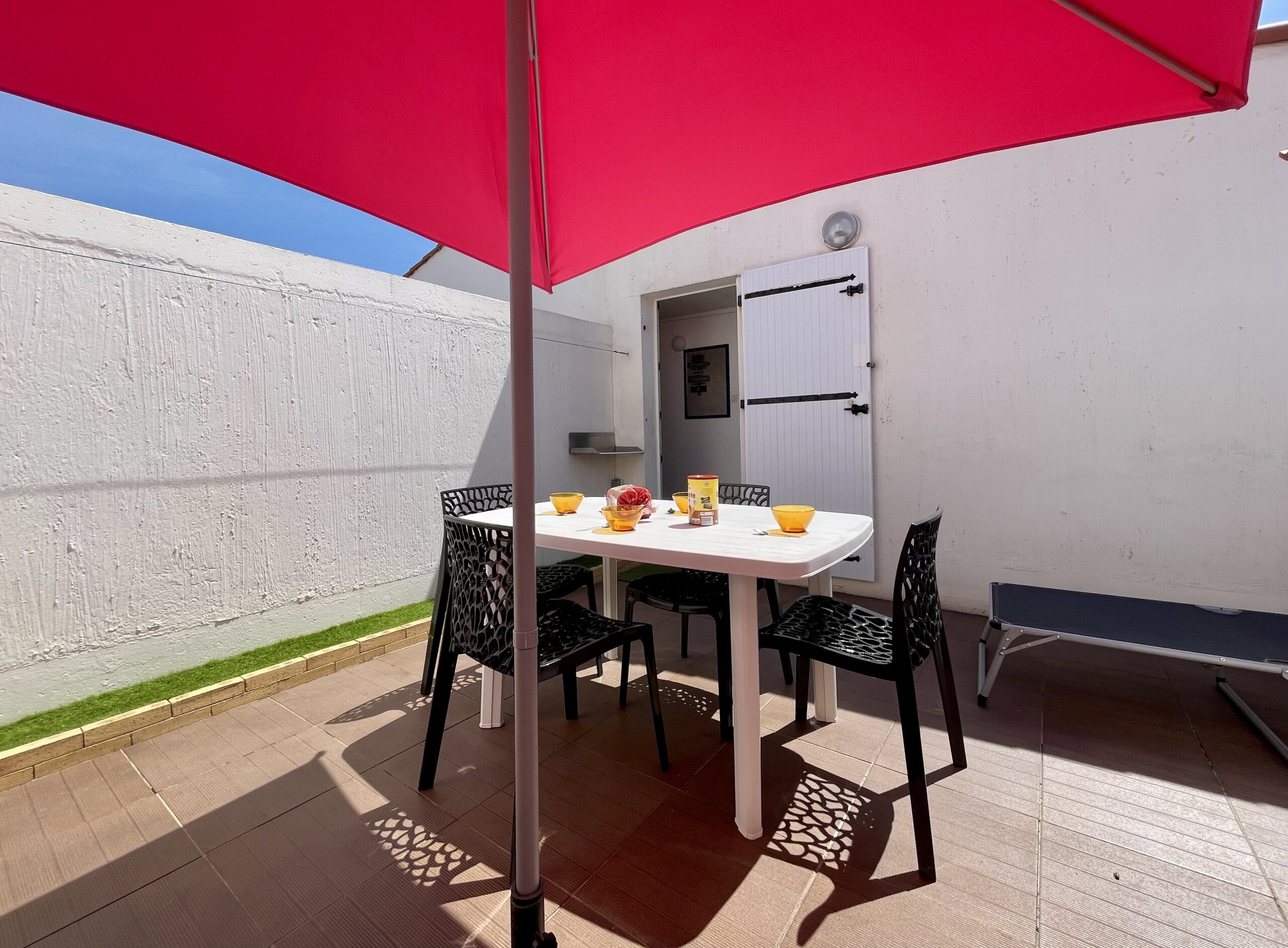 Patio carrelé avec salon de jardin (table, chaises, parasol, barbecue électrique, un bain de soleil).