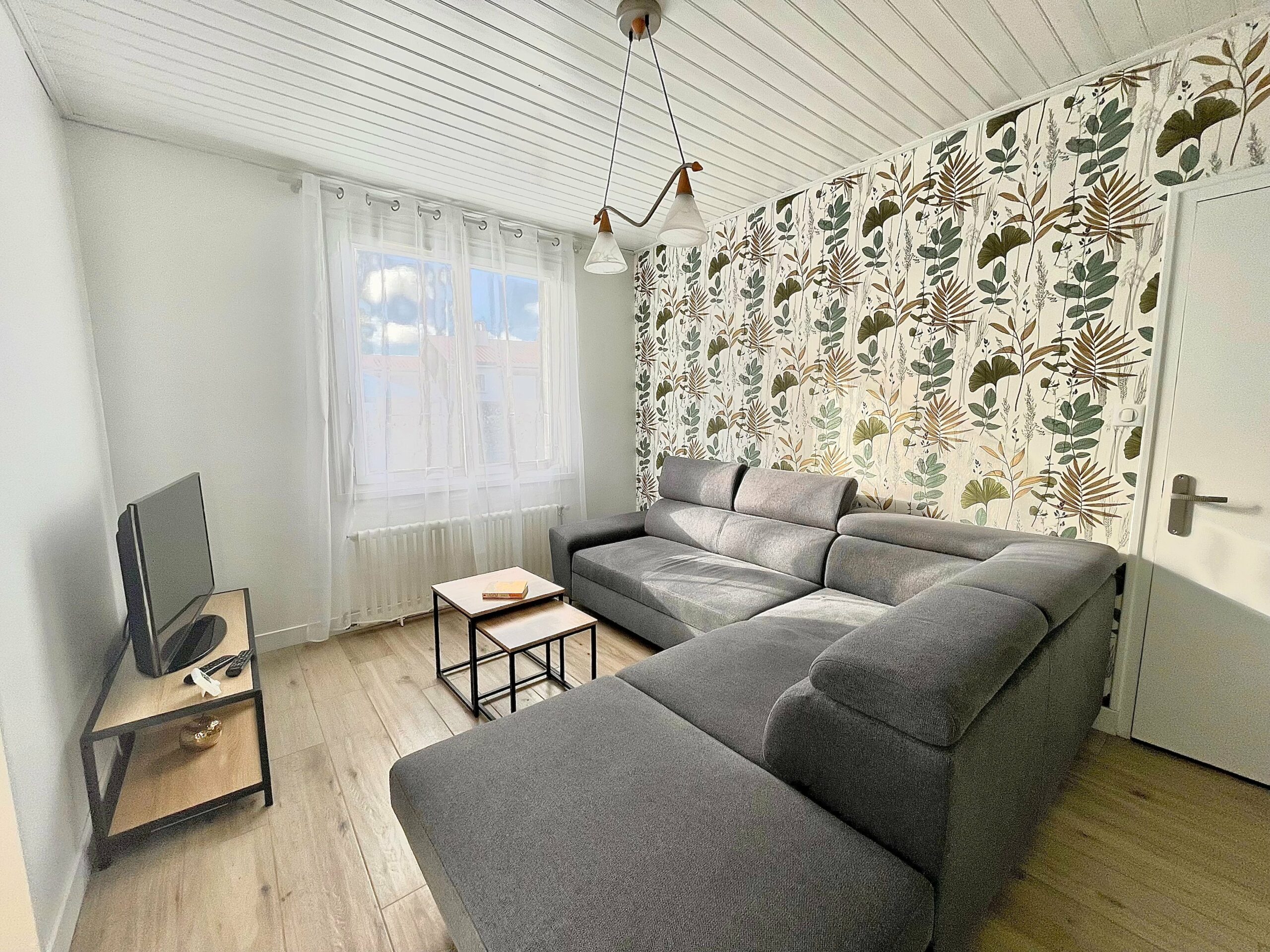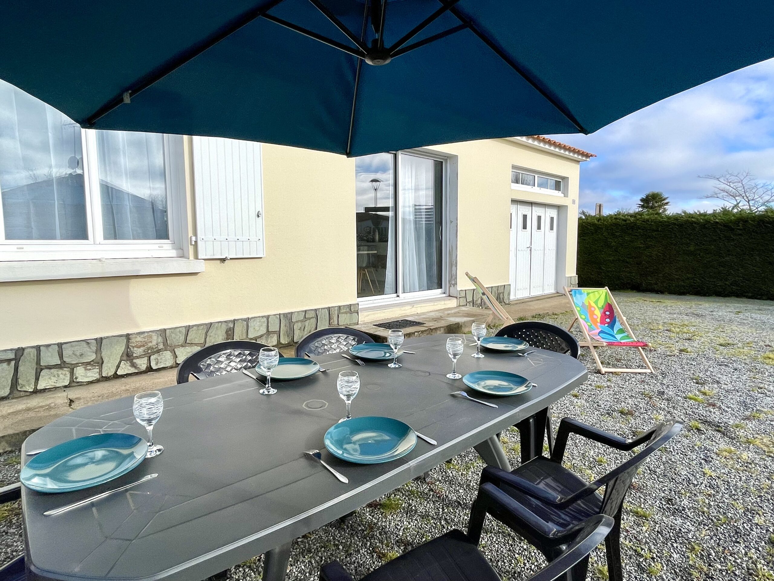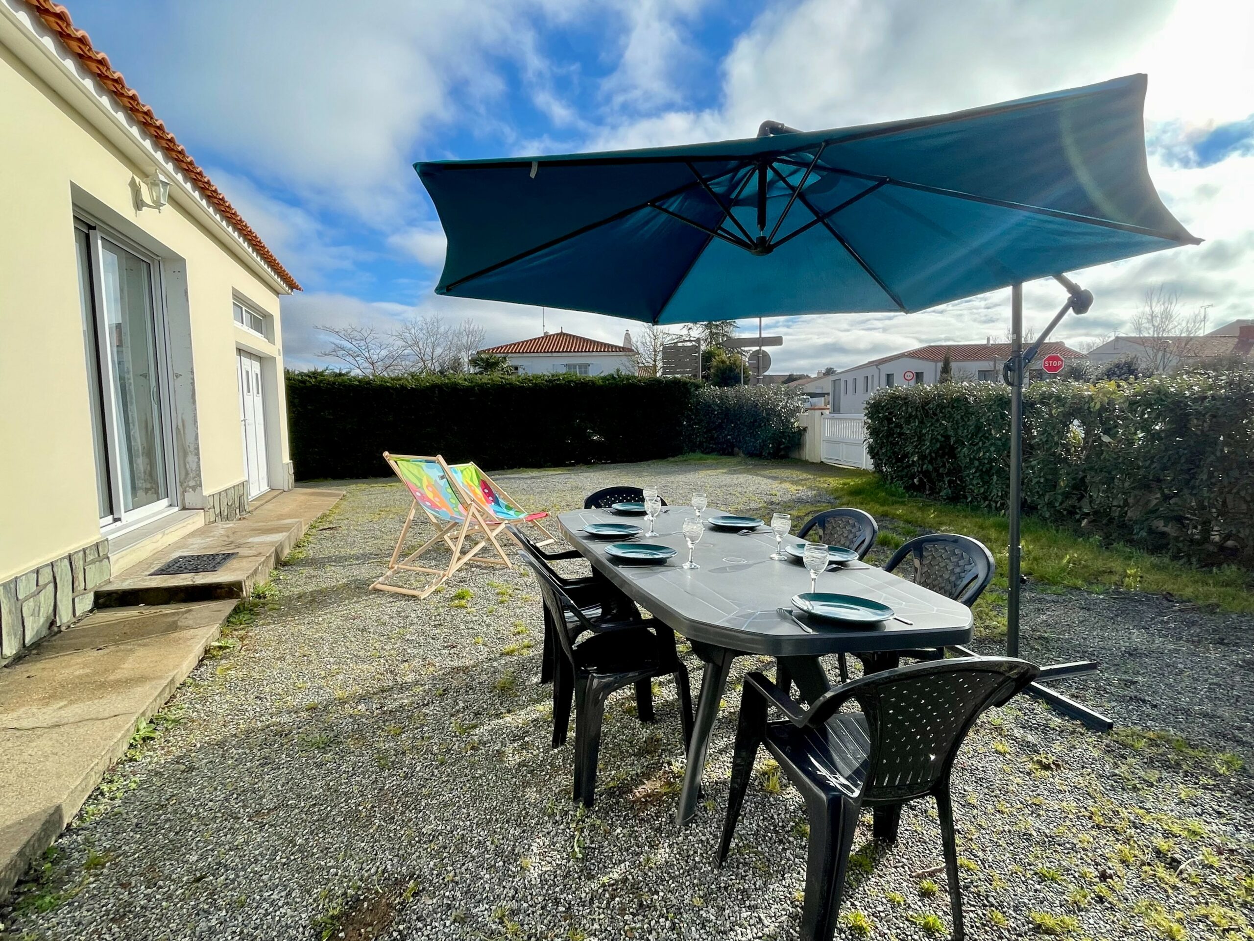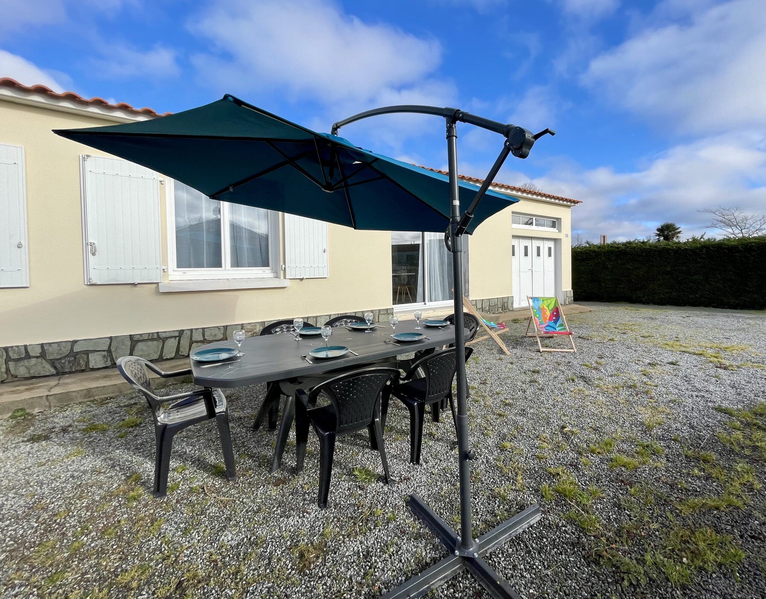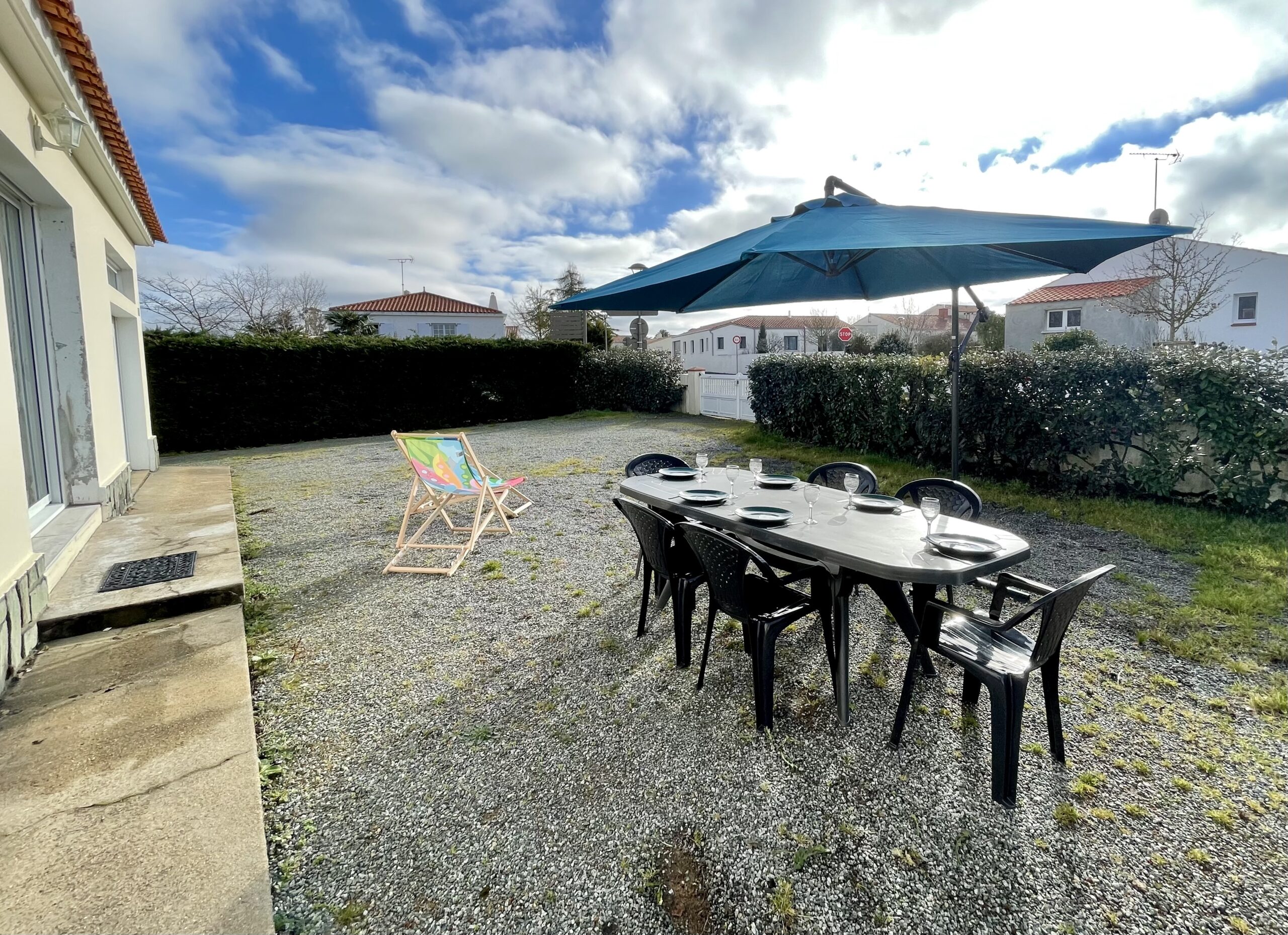 Le séjour ouvre sur le devant de la maison avec un jardin clos exposé sud avec salon de jardin, parasol, 2 bains de soleil et un barbecue à charbon.