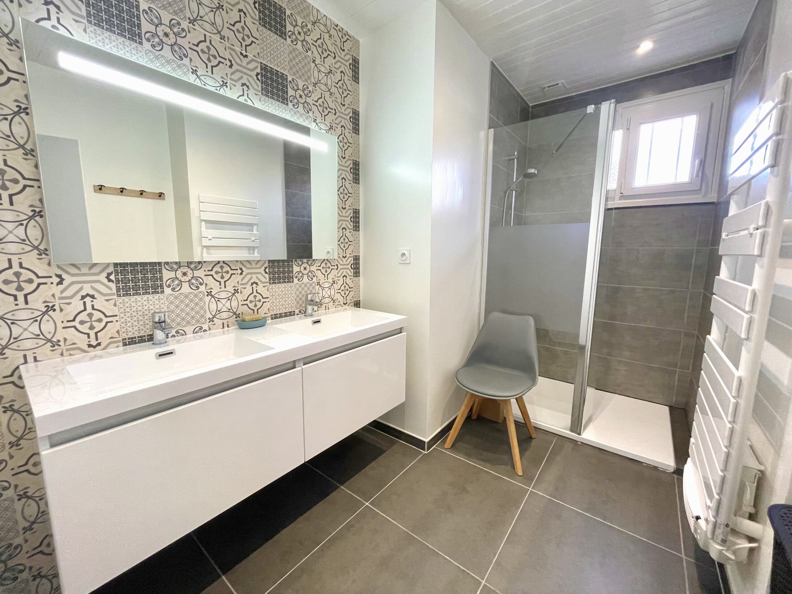 Une salle d’eau (meuble vasque, douche, sèche-serviette) et un WC séparé.