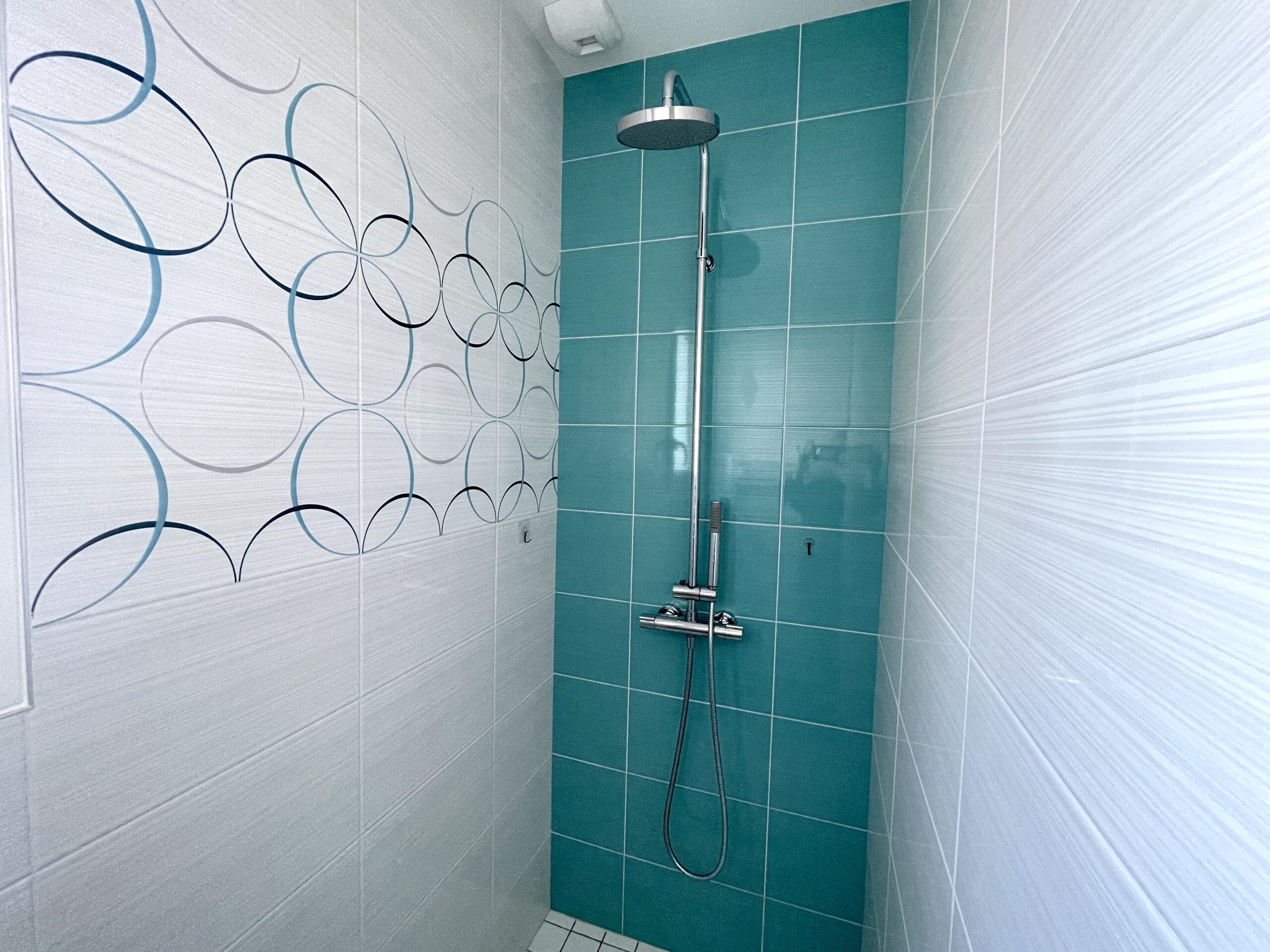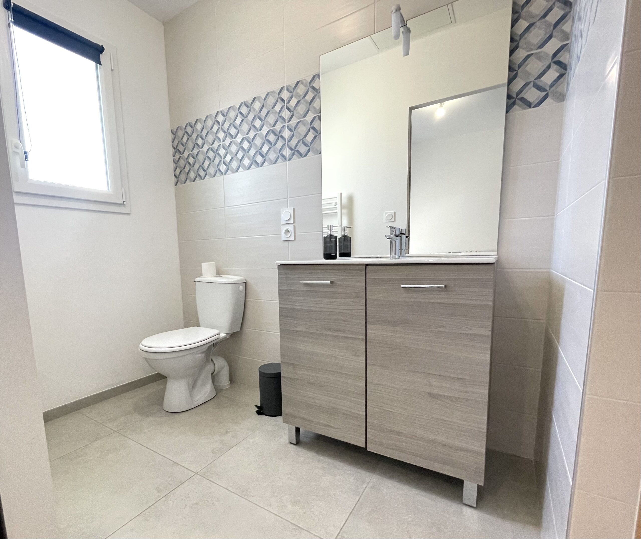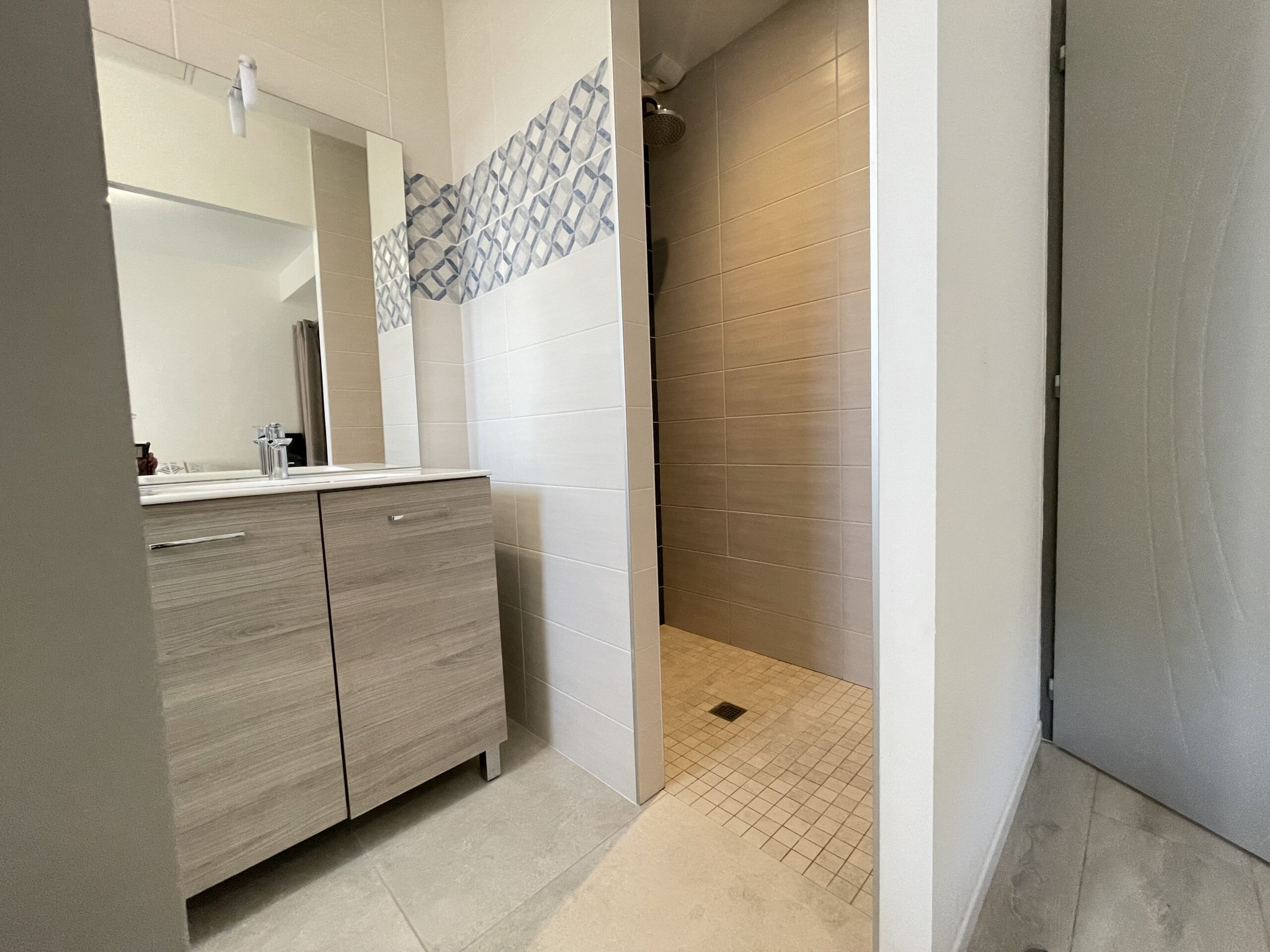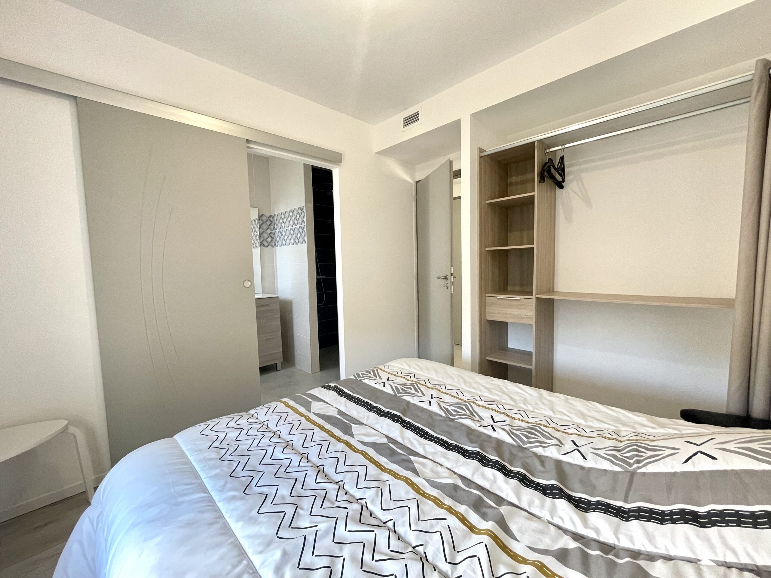 Chambre n° 1 type « parentale »: 1 x 160 avec rangement type dressing ouvert et salle d’eau attenante (douche, meuble vasque et WC).