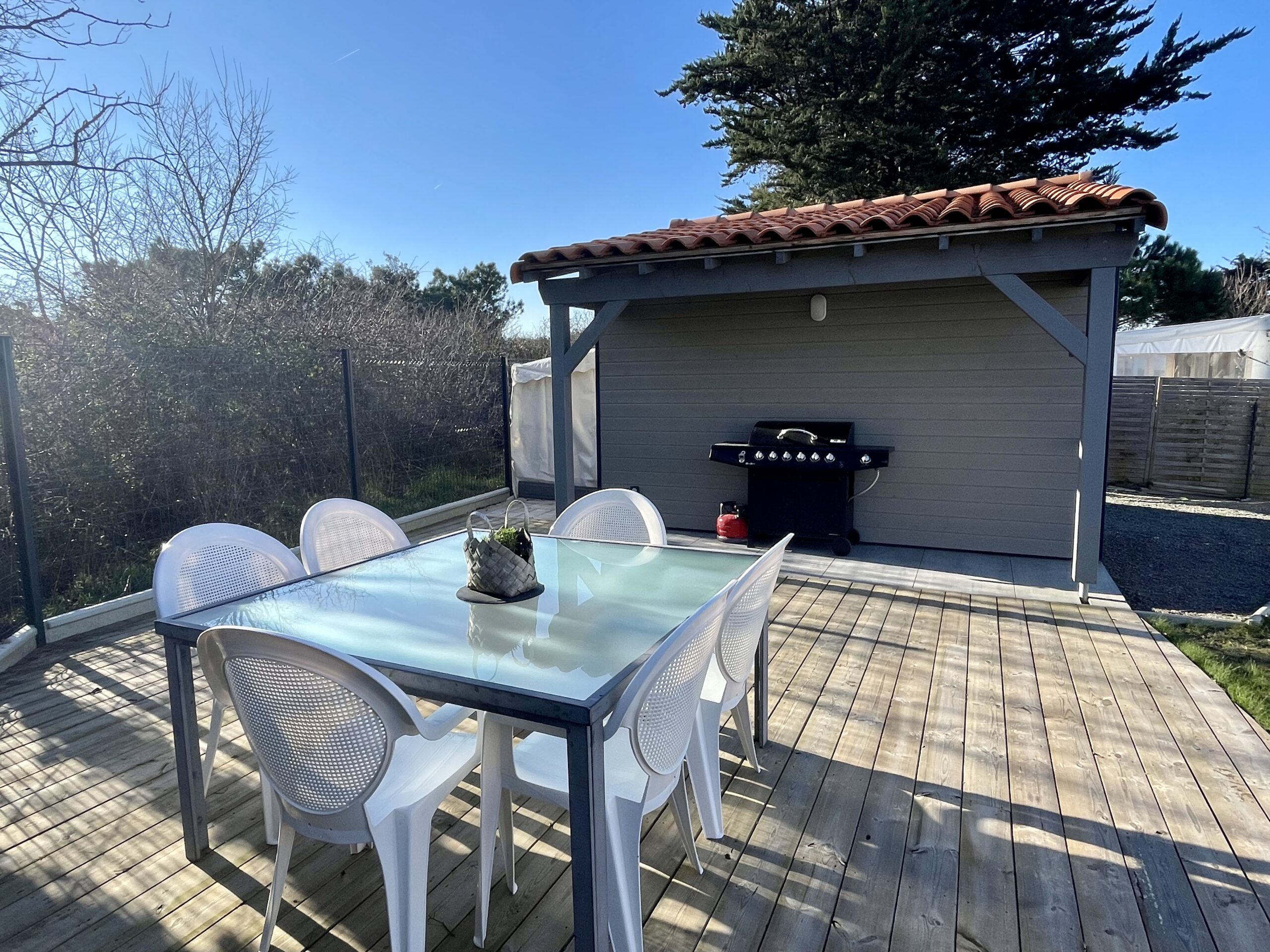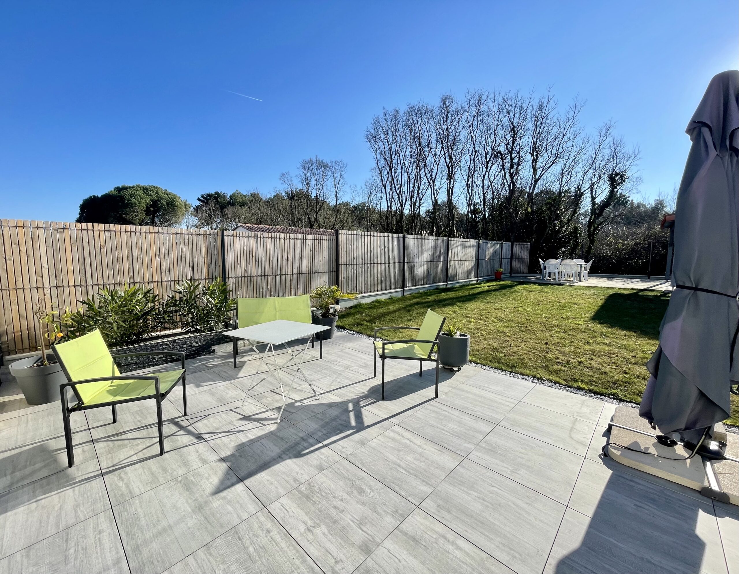 La pièce de vie ouvre sur un agréable jardin exposé sud avec une terrasse (mobilier de détente) et un espace repas (table, chaises, parasol, barbecue à gaz).