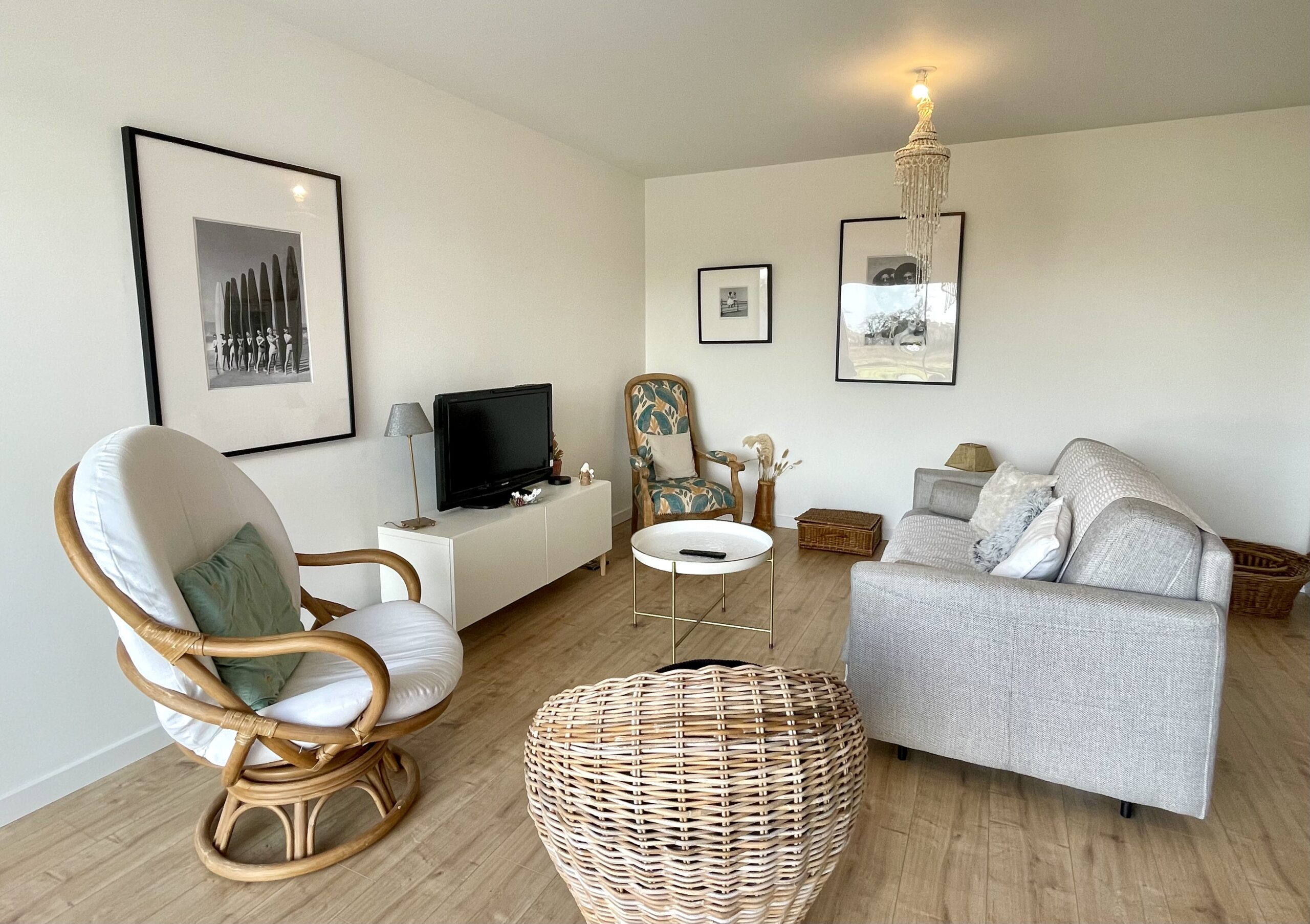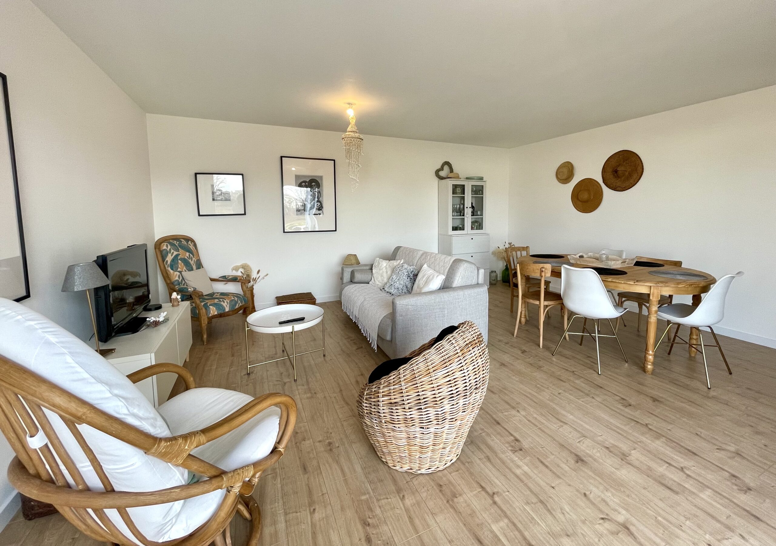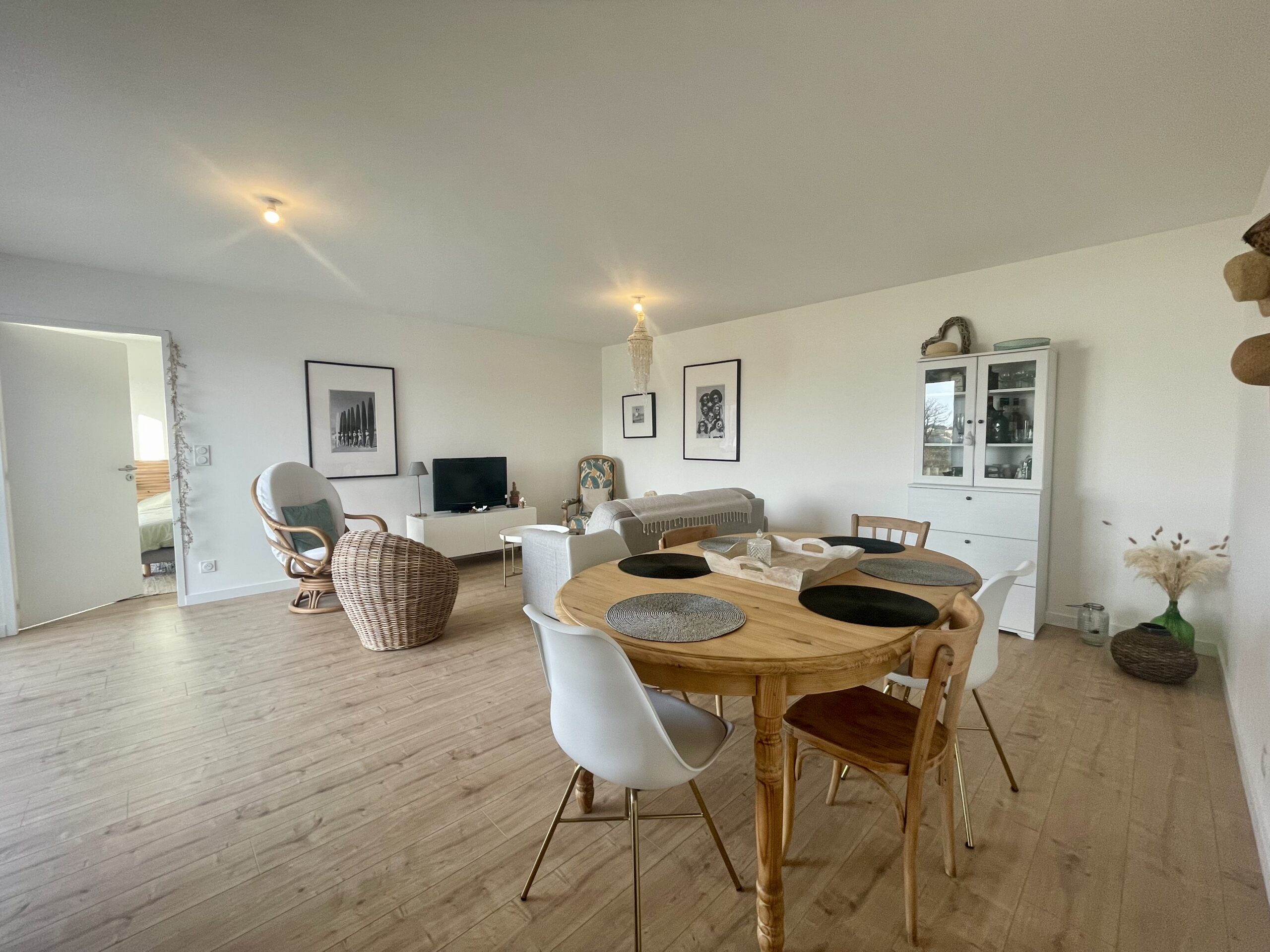 Un couloir d’entrée avec un WC dessert une spacieuse pièce de vie de 36m² avec une cuisine aménagée et équipée (plaque induction, hotte, lave-vaisselle, four et un grand réfrigérateur) ouverte sur l’espace séjour avec un coin repas (table, chaises et buffet) et coin salon/détente (TV, canapé, fauteuils et table basse). Accès WIFI.