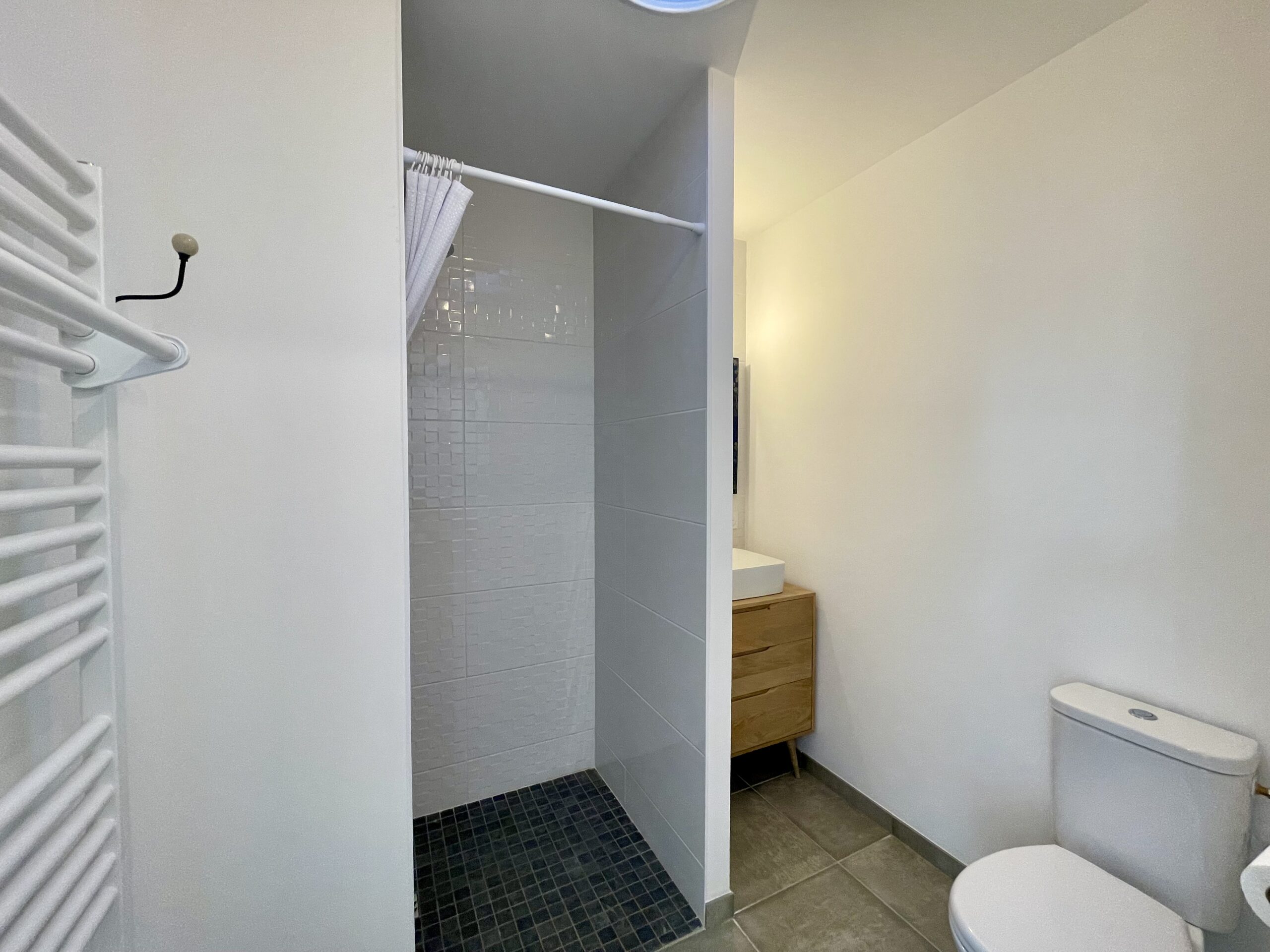De l’autre coté du séjour, un dégagement dessert 2 chambres et une seconde salle d’eau (douche, meuble vasque, sèche-serviette et un WC).
