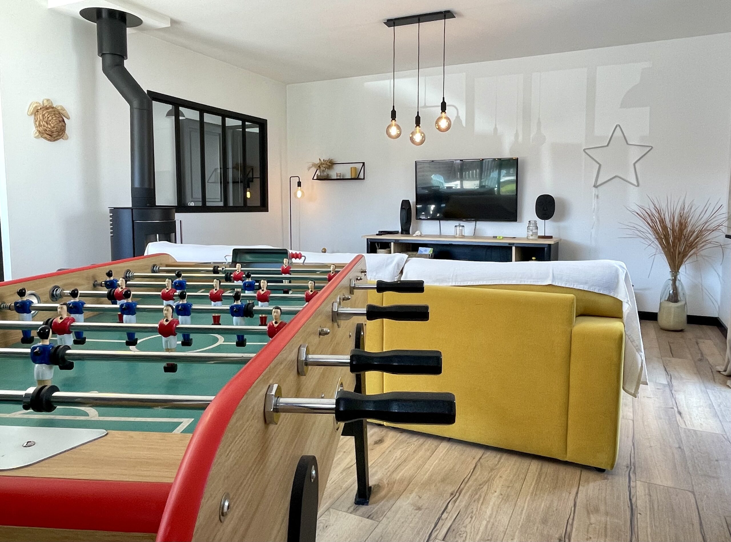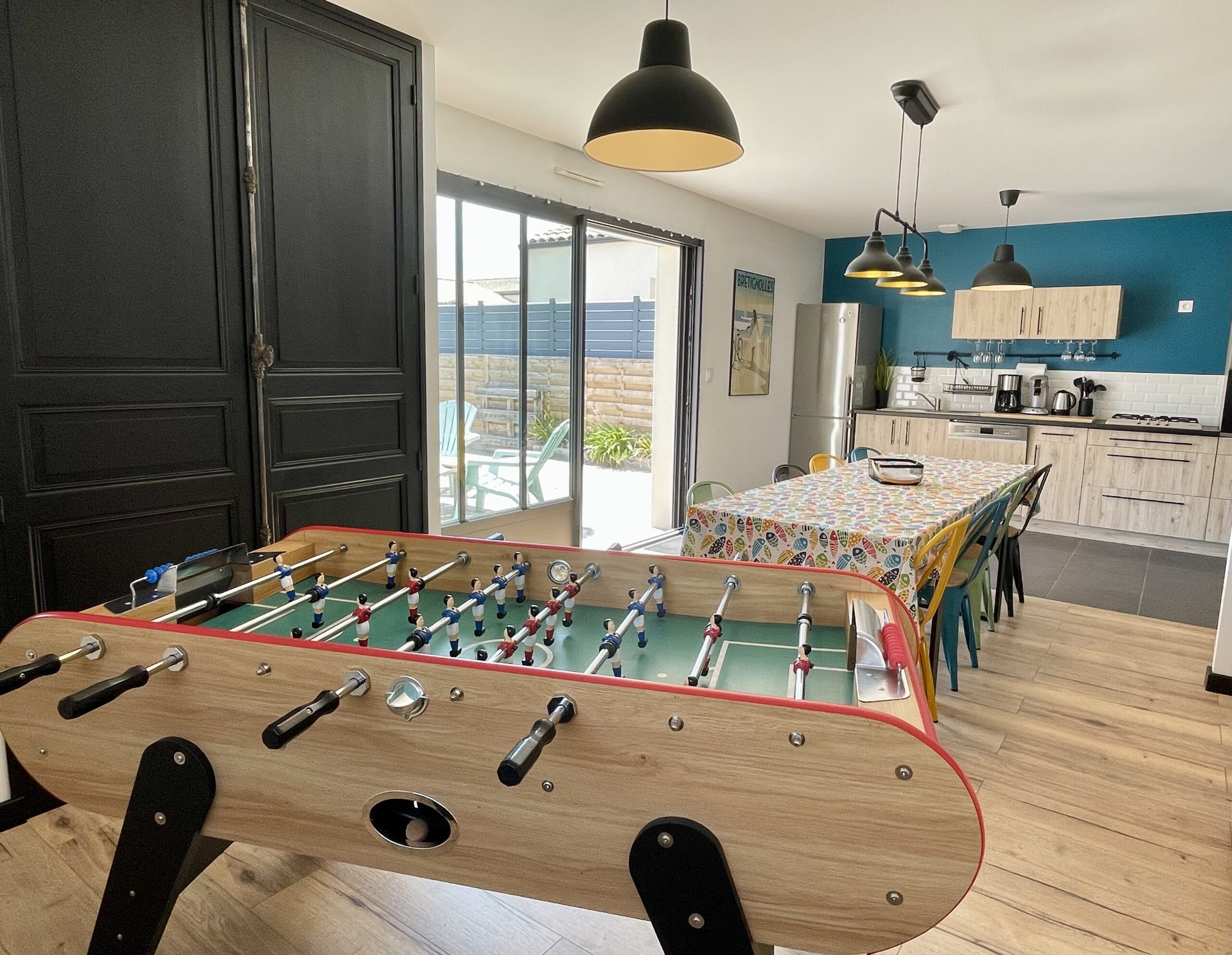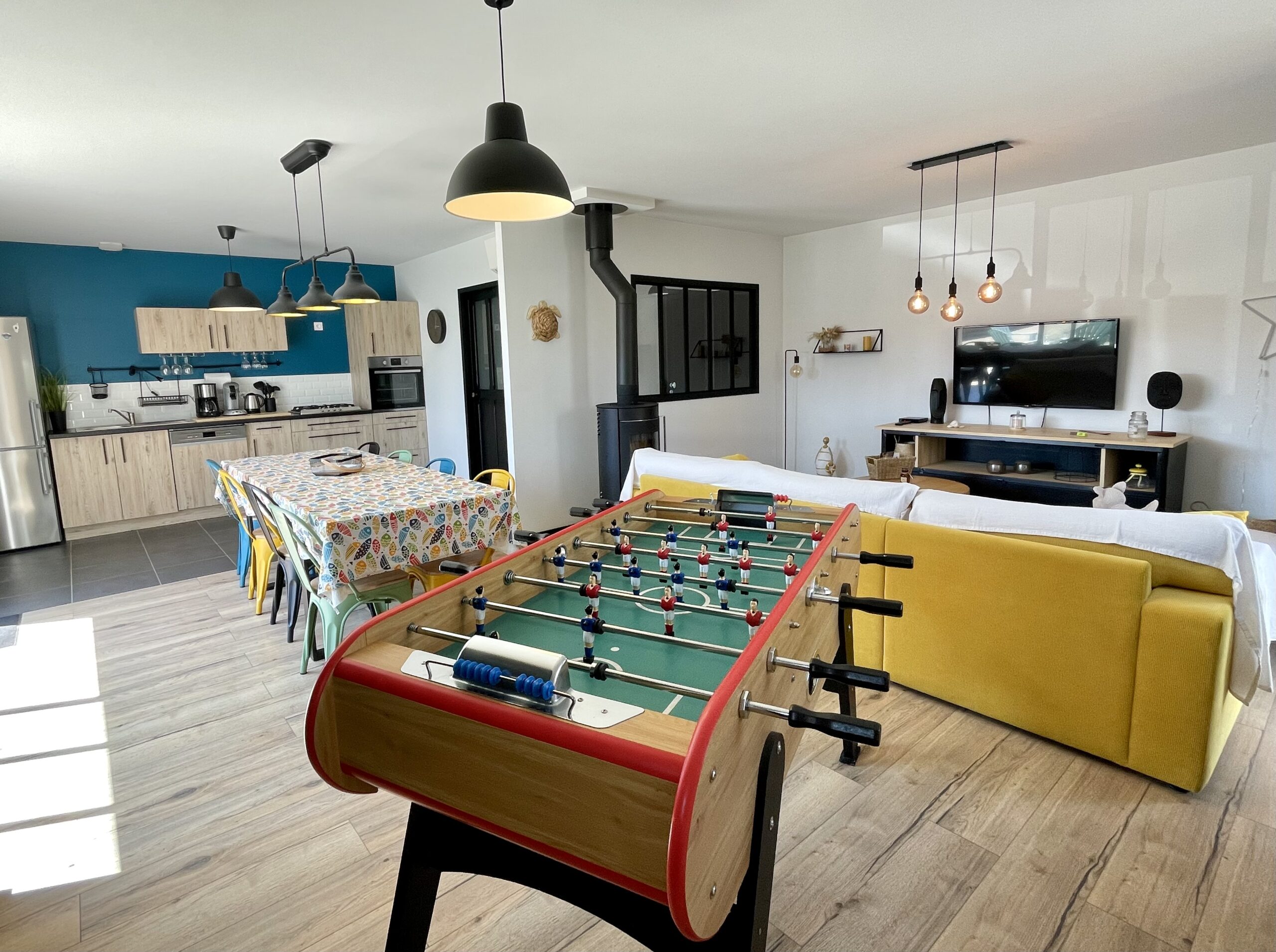 La maison comprend une pièce principale lumineuse et accueillante de 42m² env., regroupant un espace salon confortable (canapé d’angle, table basse, Tv écran plat, baby-foot, accès WIFI), un coin repas (table chaises) et une cuisine entièrement équipée (réfrigérateur avec partie congélateur, lave-vaisselle, plaque gaz, four, micro-ondes).