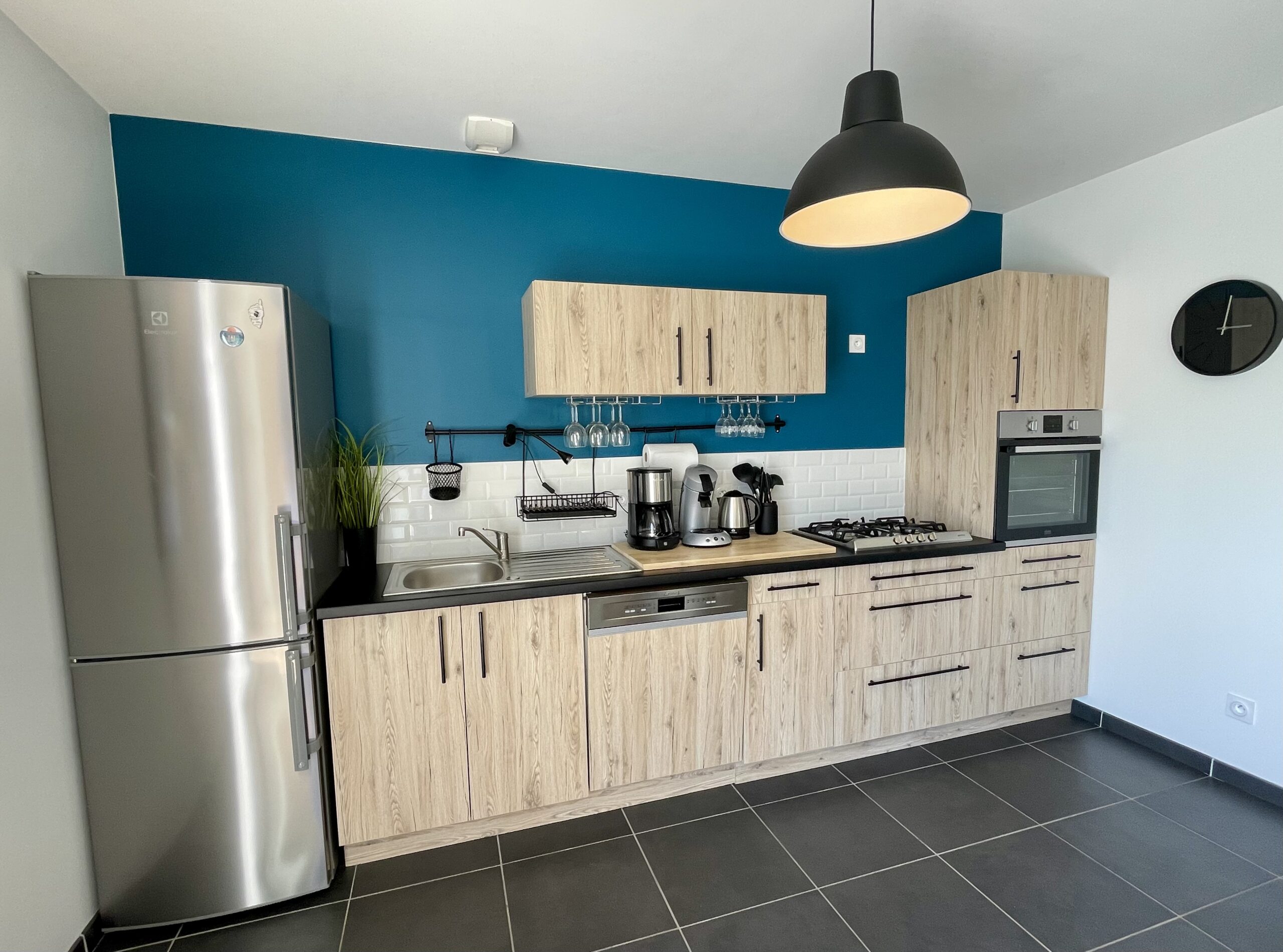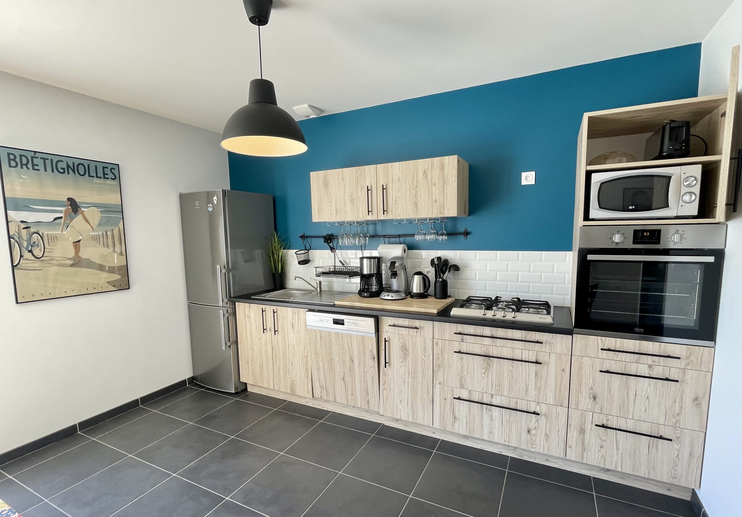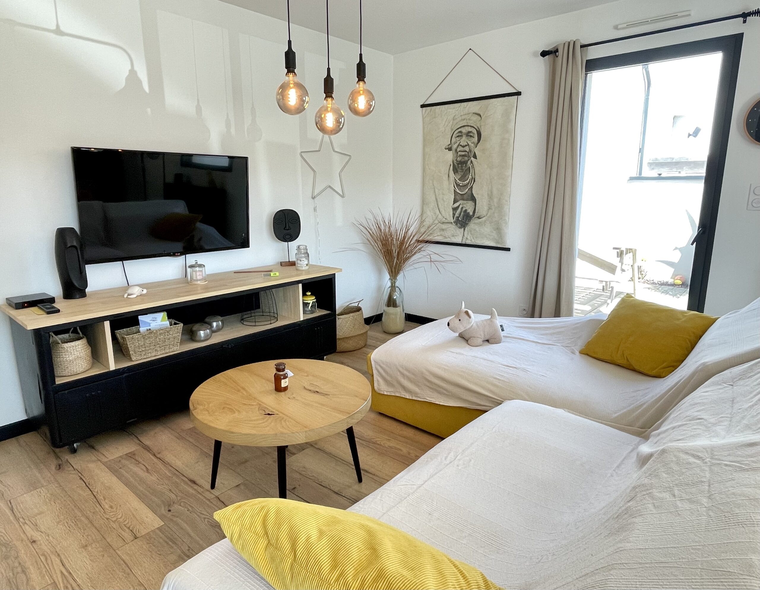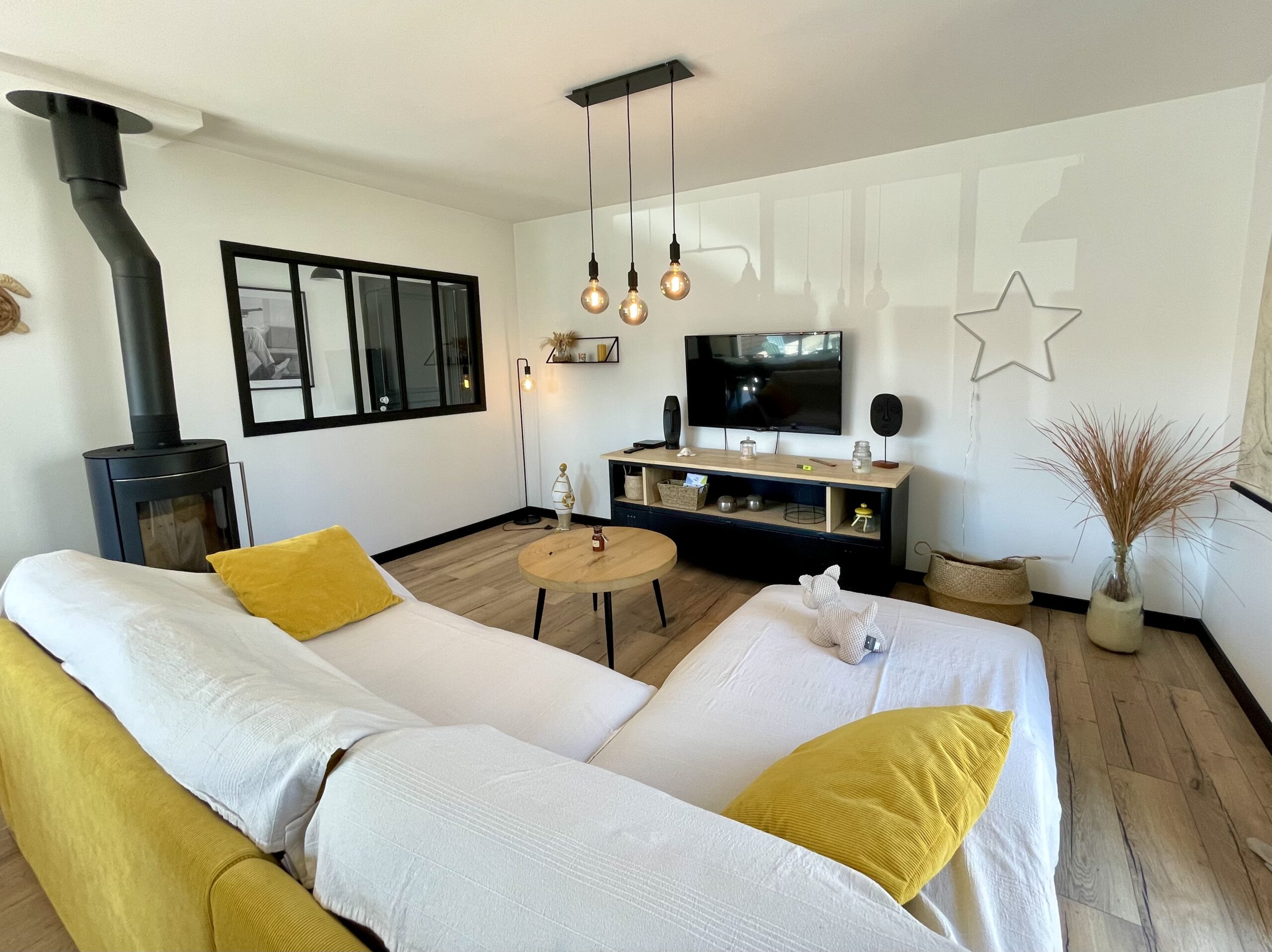 La maison comprend une pièce principale lumineuse et accueillante de 42m² env., regroupant un espace salon confortable (canapé d’angle, table basse, Tv écran plat, baby-foot, accès WIFI), un coin repas (table chaises) et une cuisine entièrement équipée (réfrigérateur avec partie congélateur, lave-vaisselle, plaque gaz, four, micro-ondes).