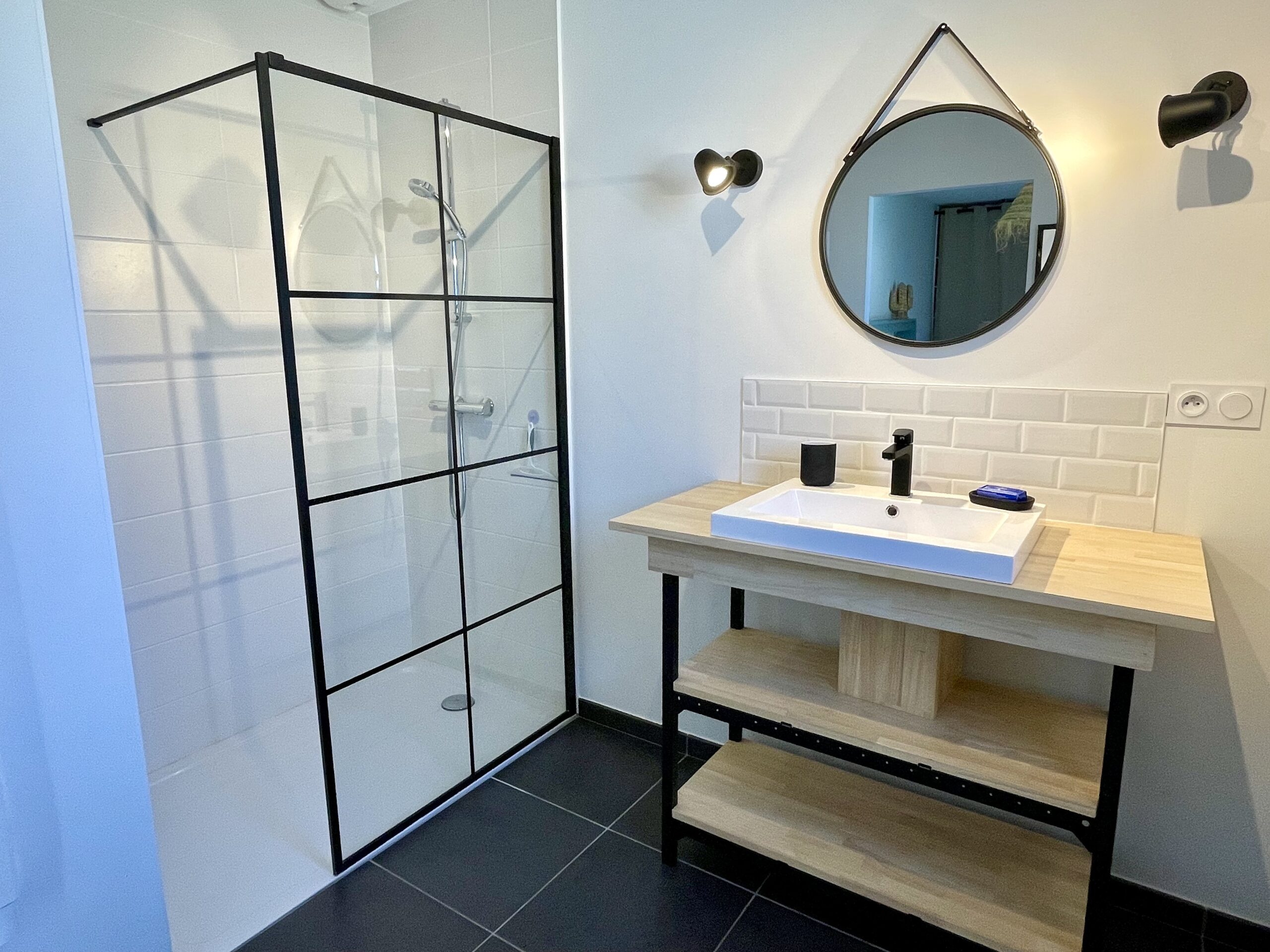 Un dégagement dessert un WC indépendant puis la chambre de type « suite parentale » (un lit double (140), grand placard dressing, TV écran plat) avec sa salle d’eau attenante (meuble vasque, douche et sèche serviette).