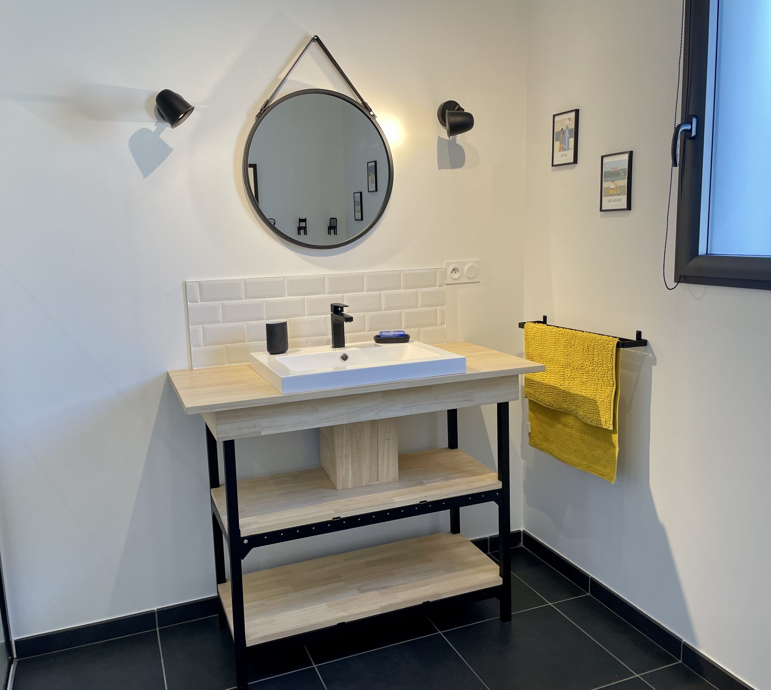 Sur le côté, une seconde terrasse avec un coin repas (table, bancs, barbecue à charbon), coin détente (canapé en palettes) et un bar.