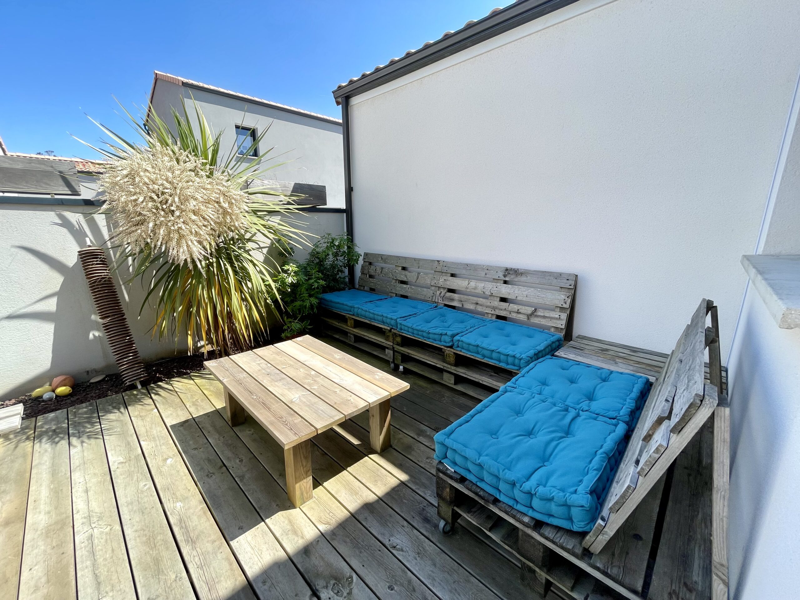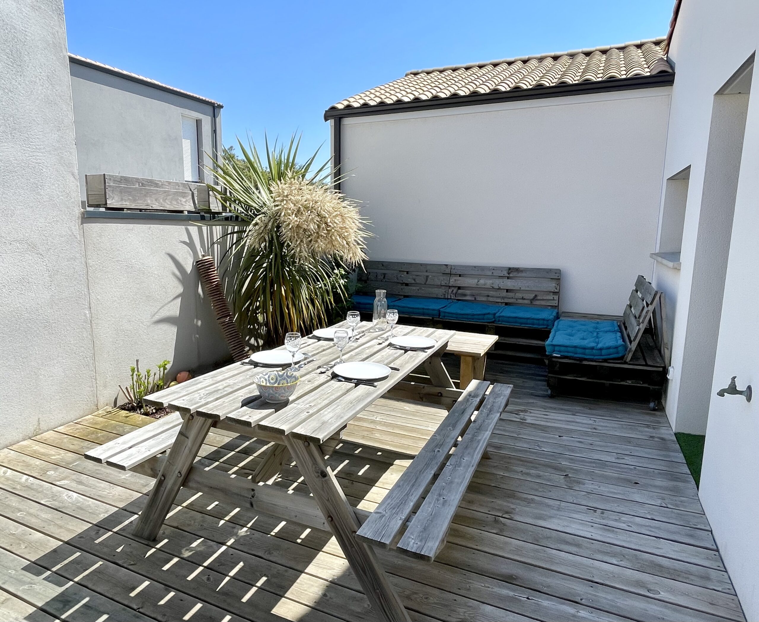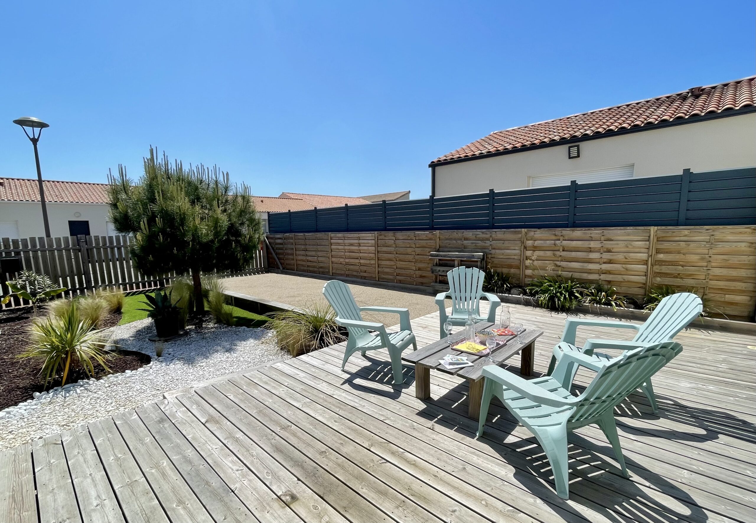 Sur le devant de la maison, une première terrasse en bois exposée sud équipée de mobilier de détente et un terrain de pétanque privatif vous attend pour des moments conviviaux.