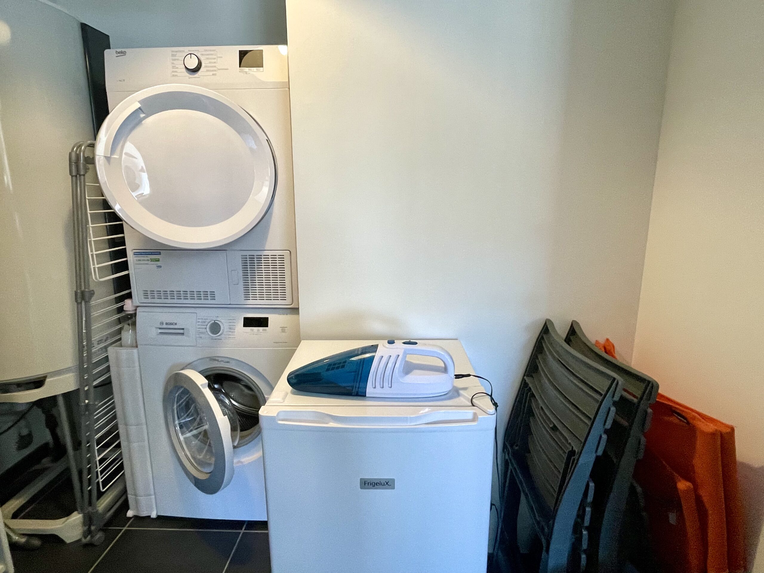 Un cellier avec lave-linge, sèche-linge et réfrigérateur d’appoint.