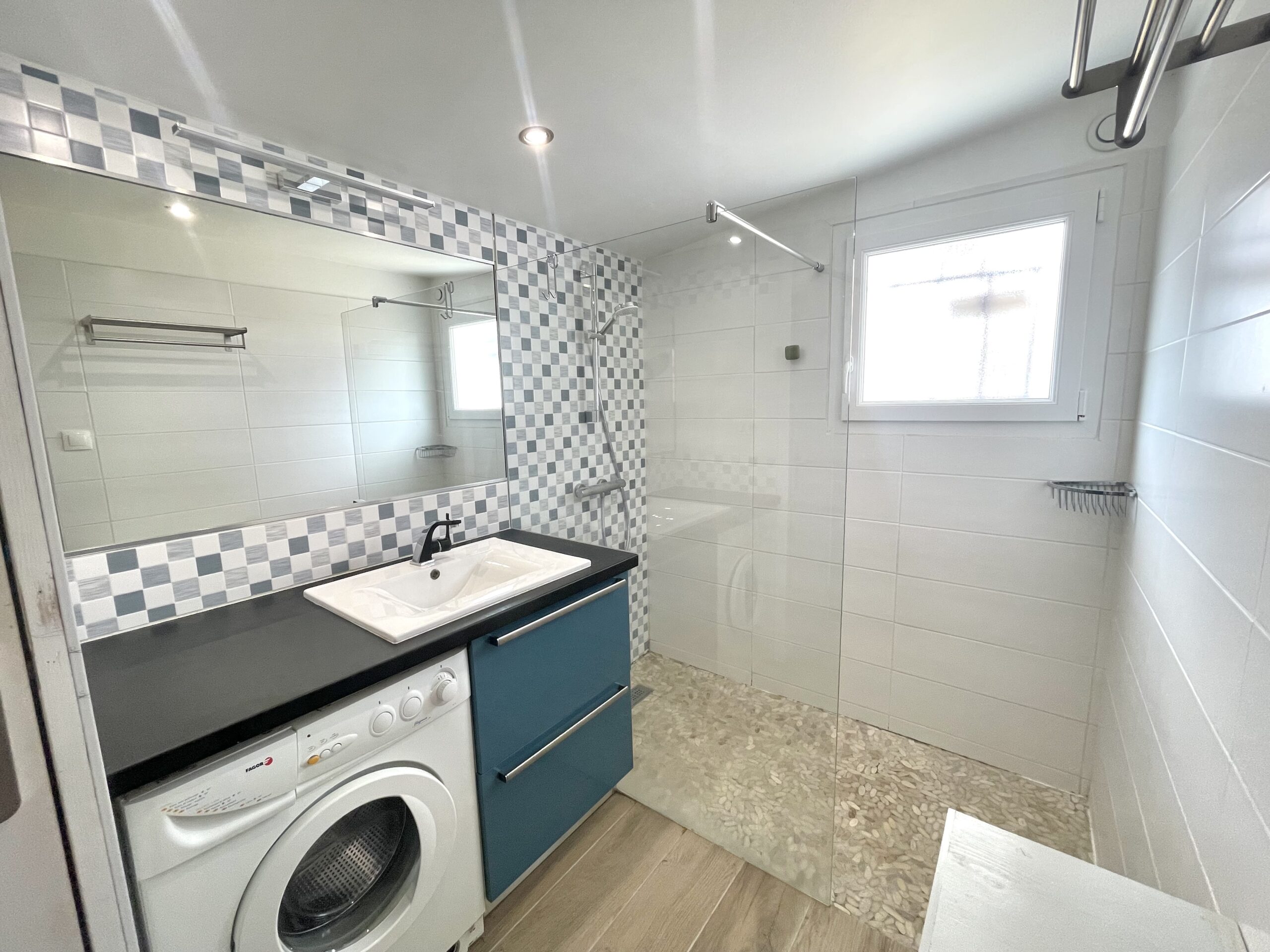 De l’autre côté de la pièce de vie, un dégagement (avec une marche) dessert un WC indépendant, une salle d’eau (douche, vasque, lave-linge et sèche-serviette) et la seconde chambre.