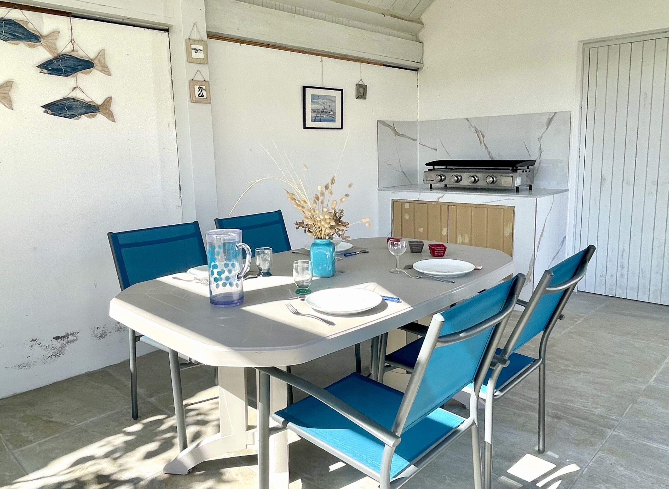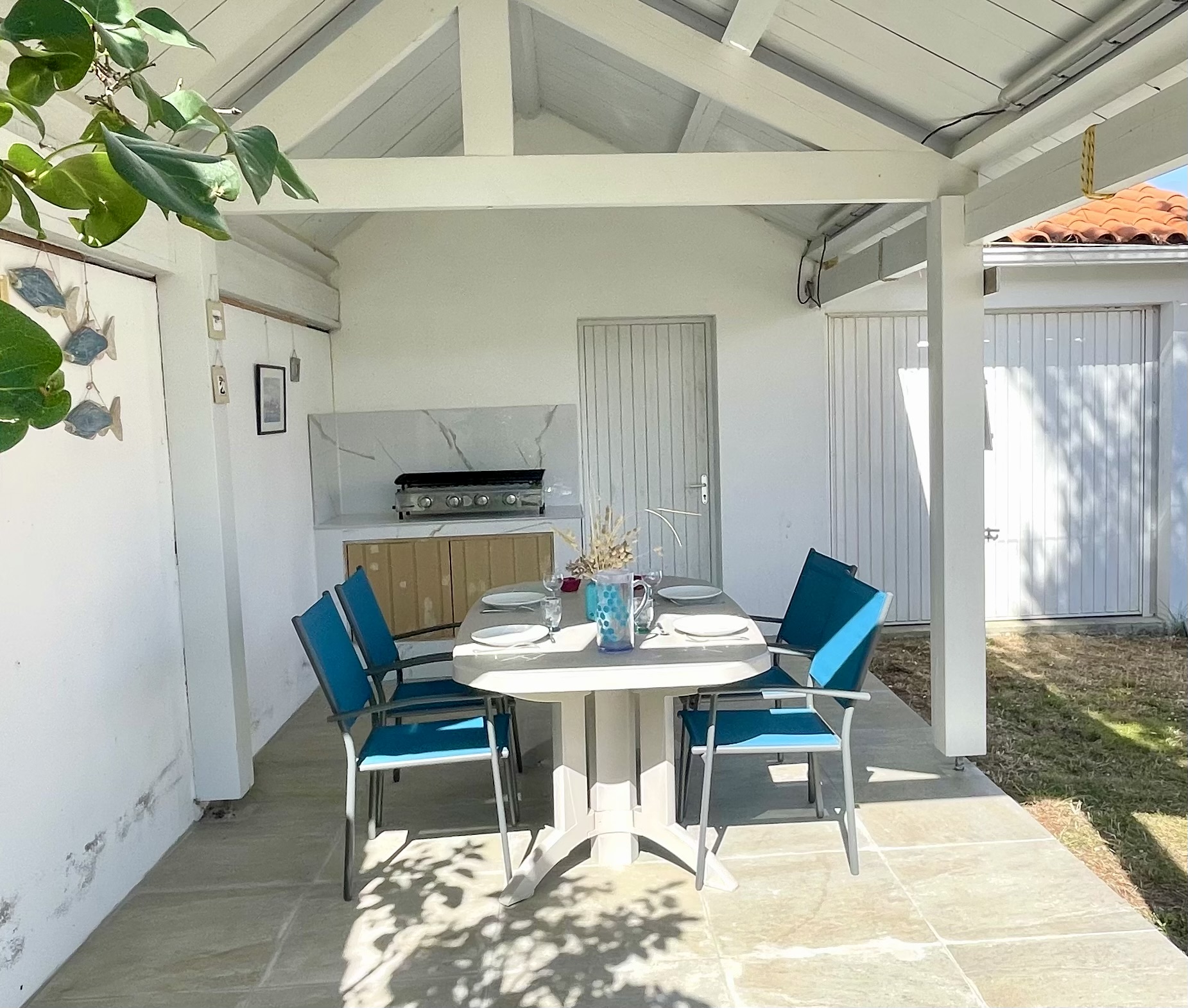 Au fond du jardin, un second coin repas abrité avec salon de jardin (table, chaises et plancha gaz).