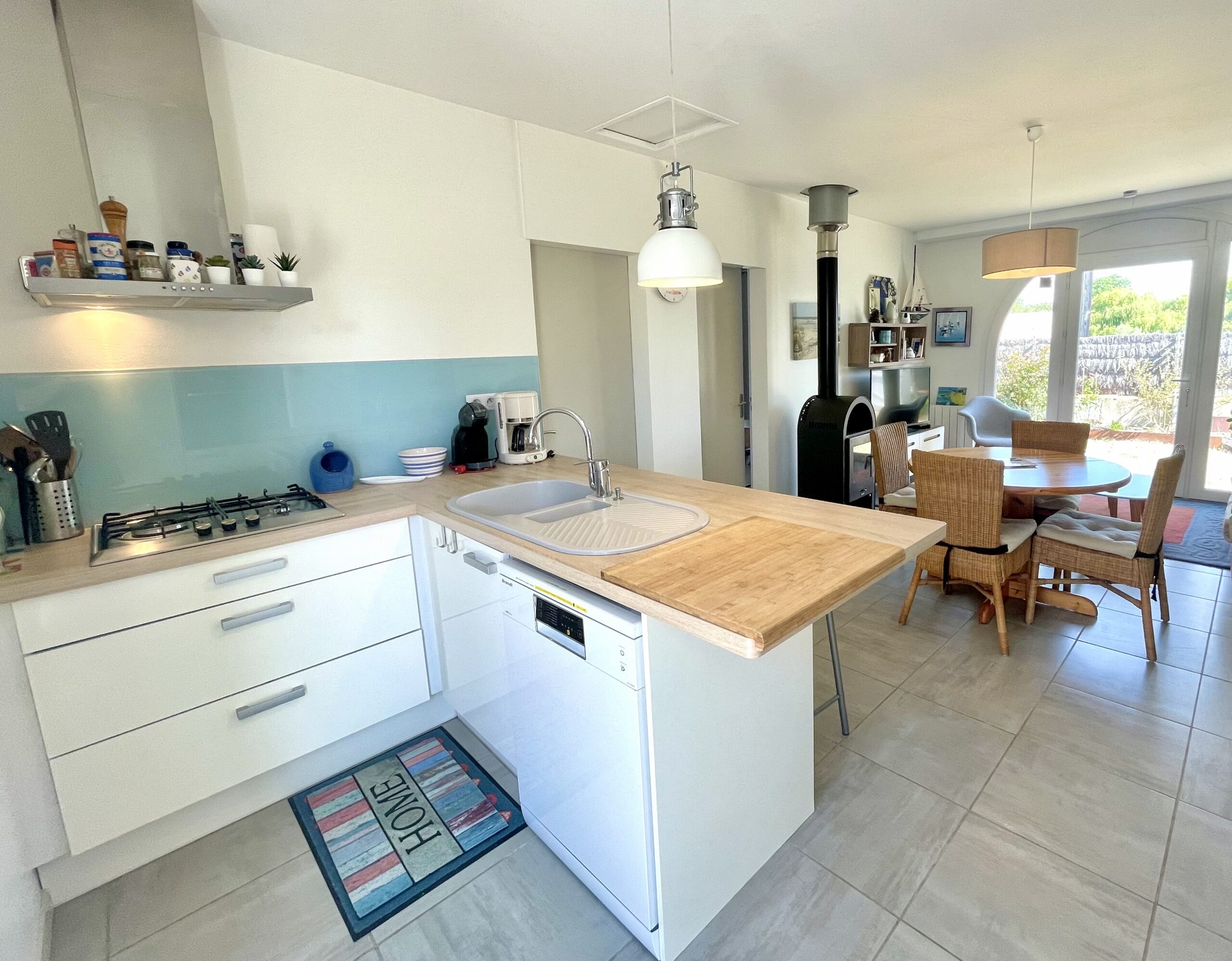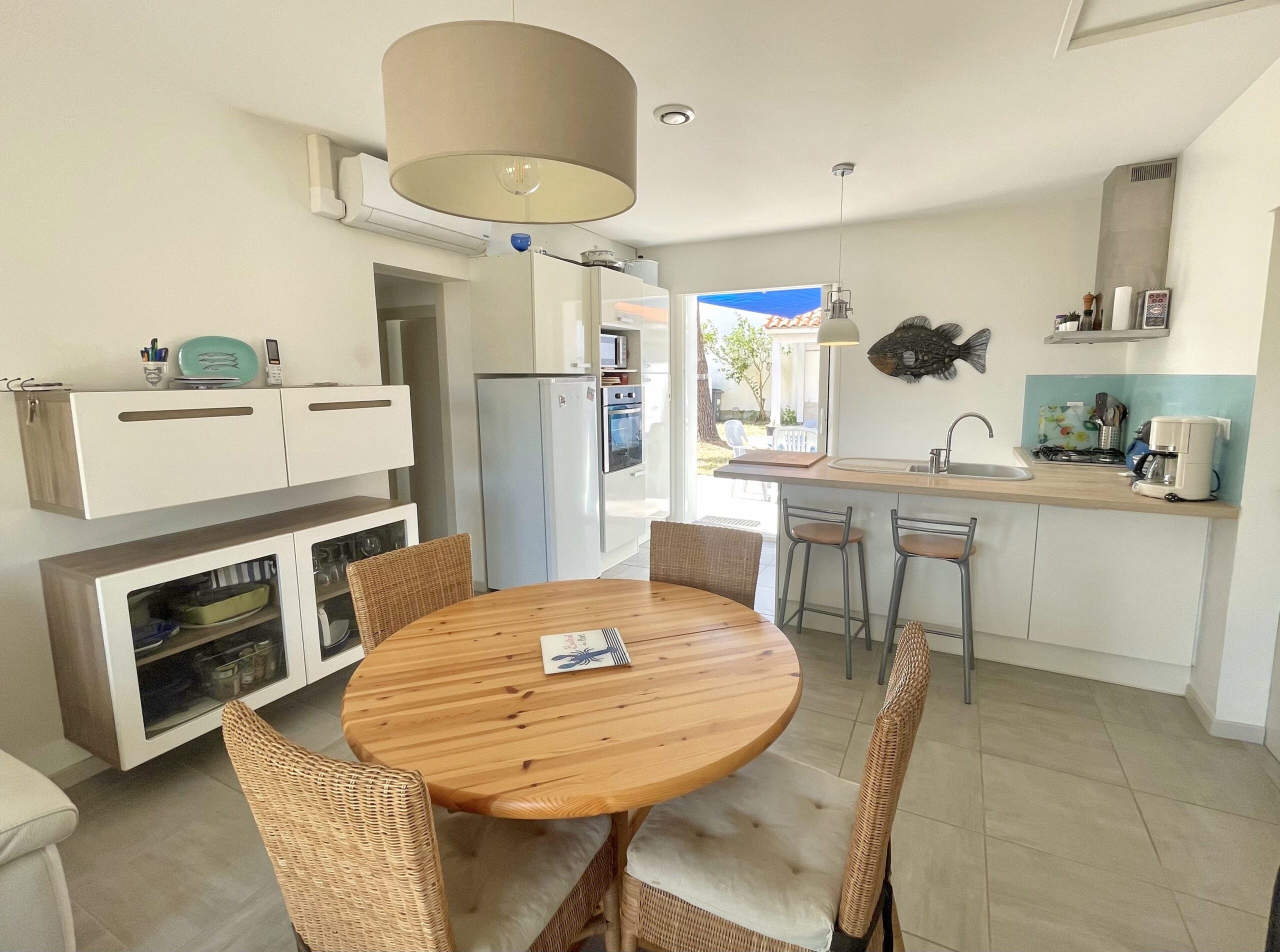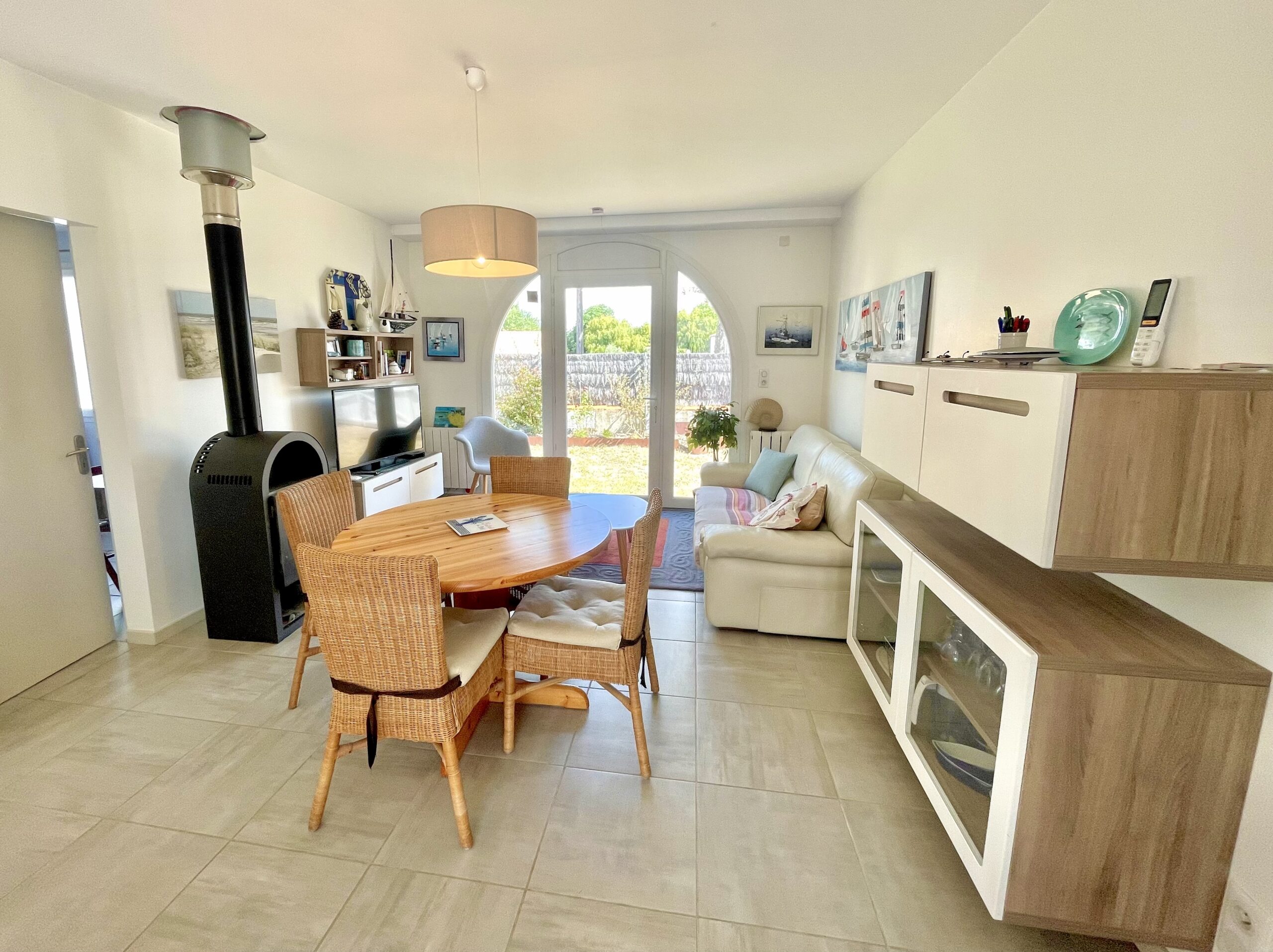 La pièce de vie ouvre sur l’arrière de la maison sur un agréable jardin clos exposé sud avec une terrasse carrelée (table, chaises, 2 bains de soleil et voiles d’ombrage).