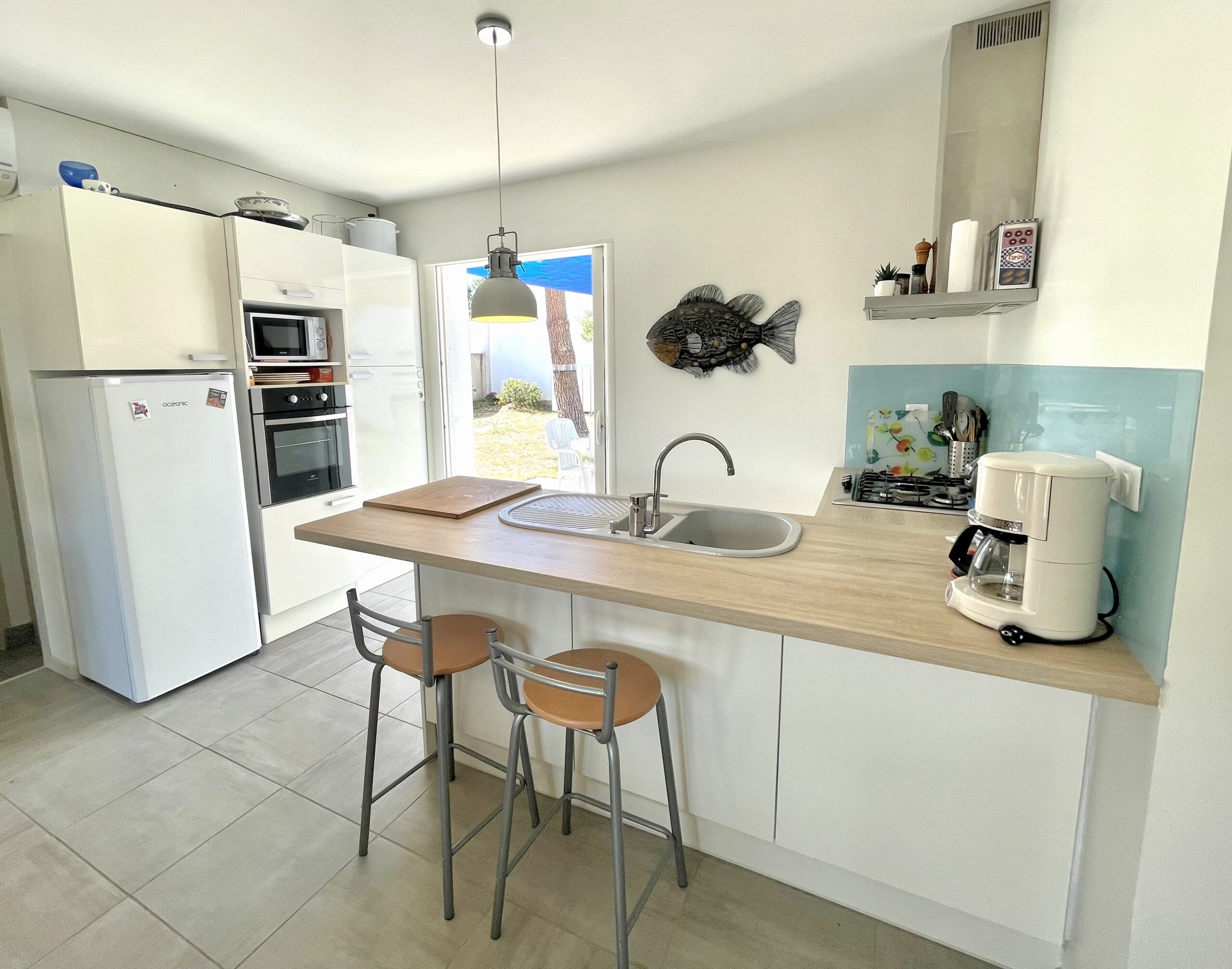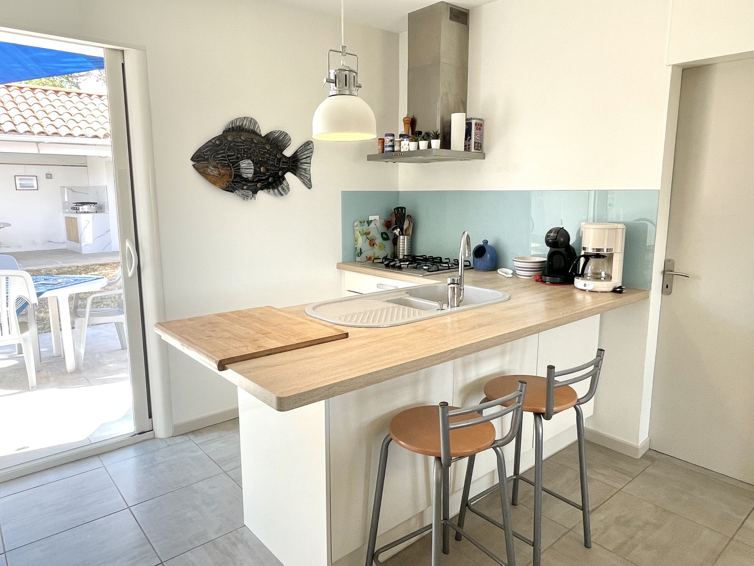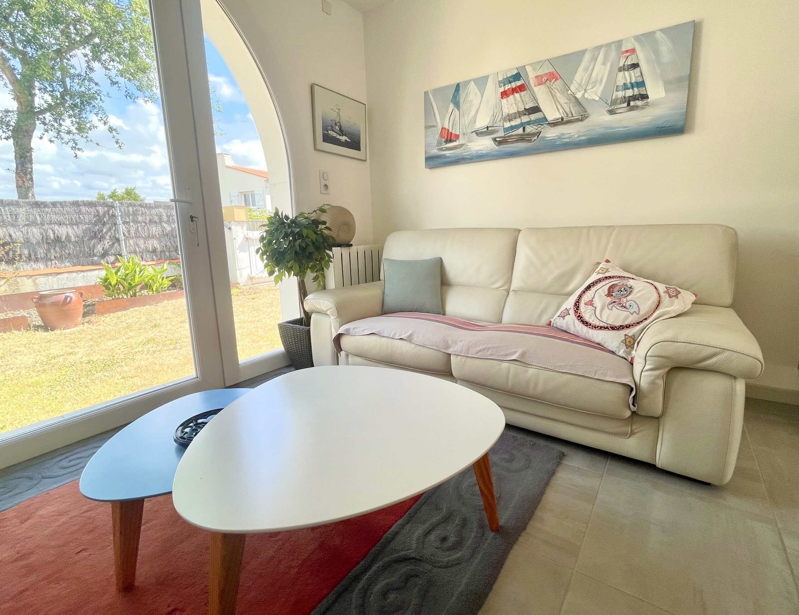 La pièce de vie ouvre sur l’arrière de la maison sur un agréable jardin clos exposé sud avec une terrasse carrelée (table, chaises, 2 bains de soleil et voiles d’ombrage).