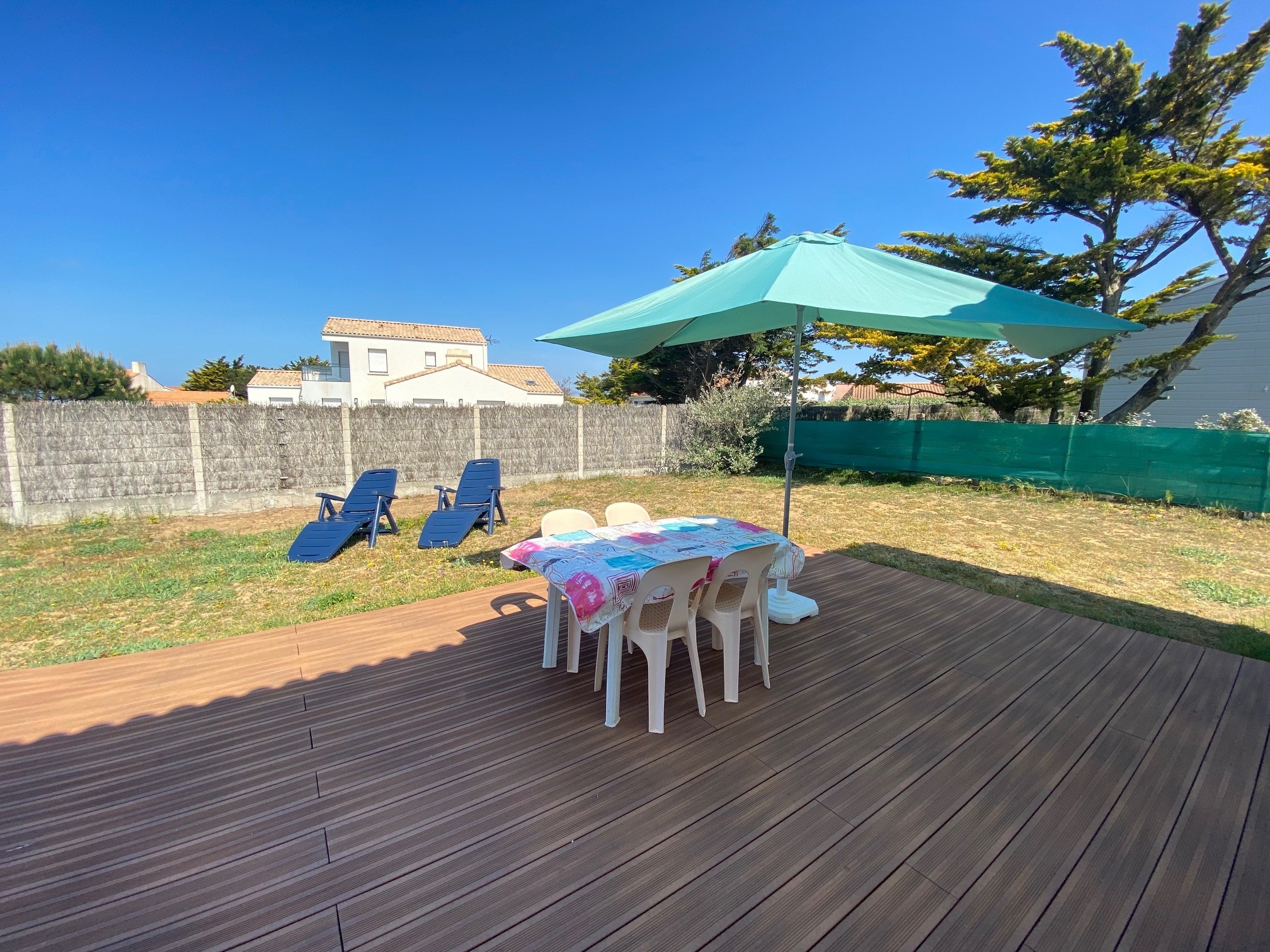 Jardin clos avec terrasse et salon de jardin (table, chaises, parasol, barbecue, transats).