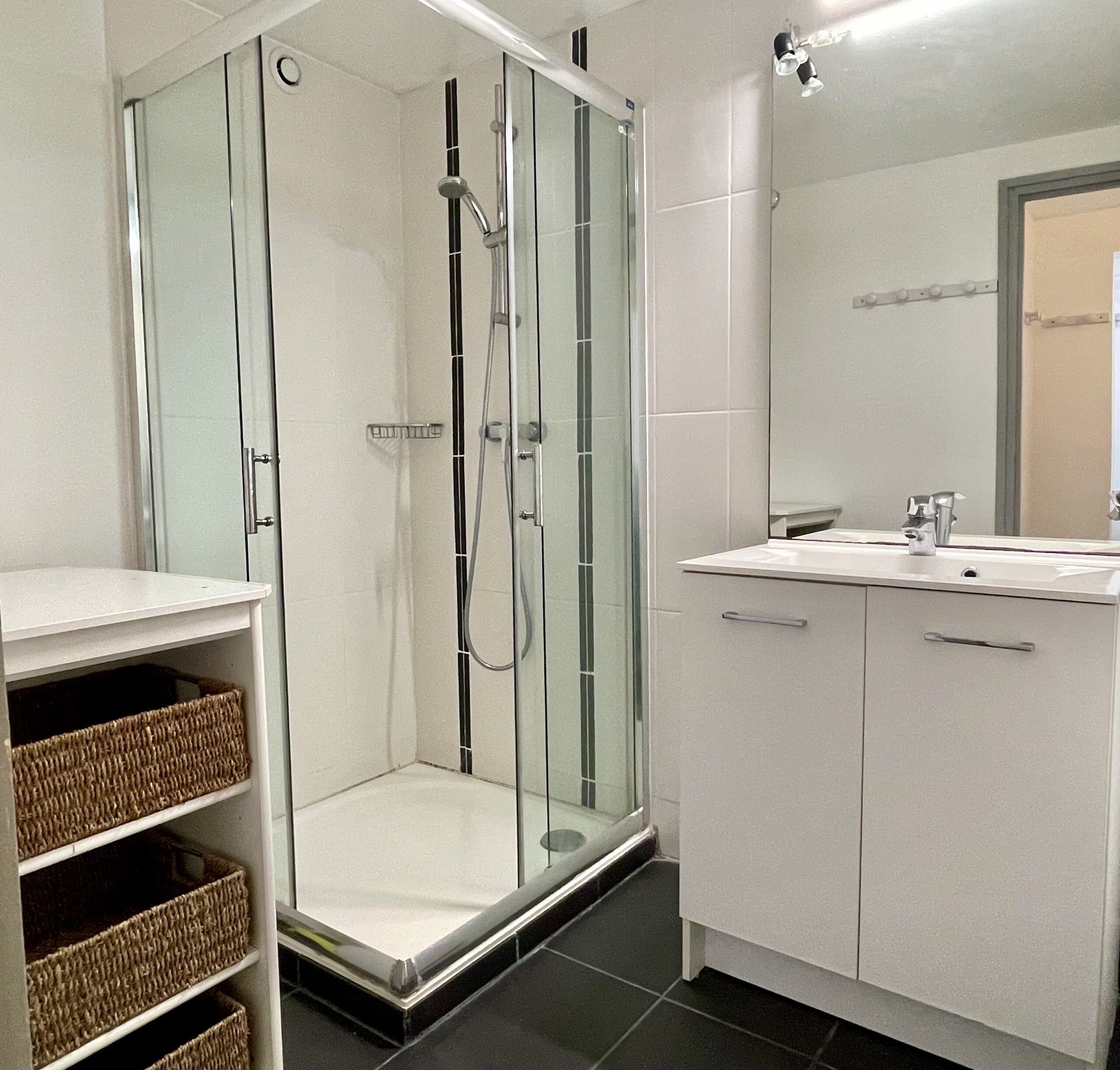 Un dégagement dessert une chambre, un toilette séparé et une salle d’eau (meuble vasque + douche).