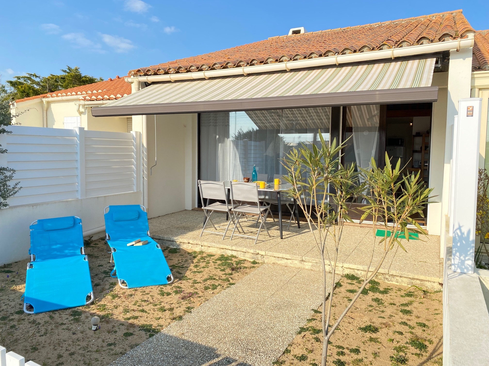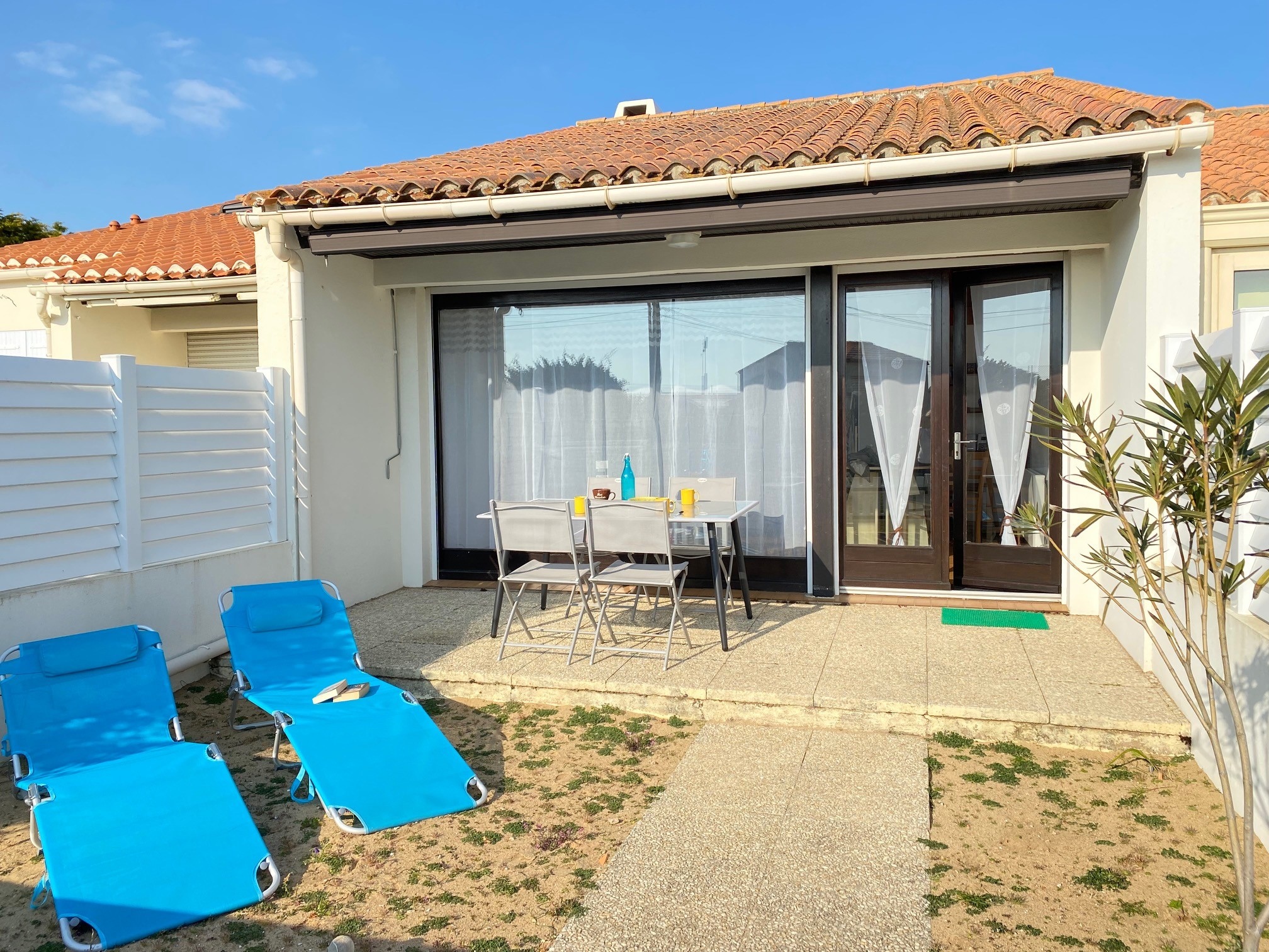 A 300m de la belle plage des Dunes, dans une petite résidence, maison de type 2 + mezzanine avec cour privative comprenant une entrée avec placard, un séjour/salon (canapé, TV écran plat, chaises et table de séjour ), cuisine aménagée et équipée (plaque induction, micro-ondes, four, lave-vaisselle, réfrigérateur-congélateur, lave-linge).