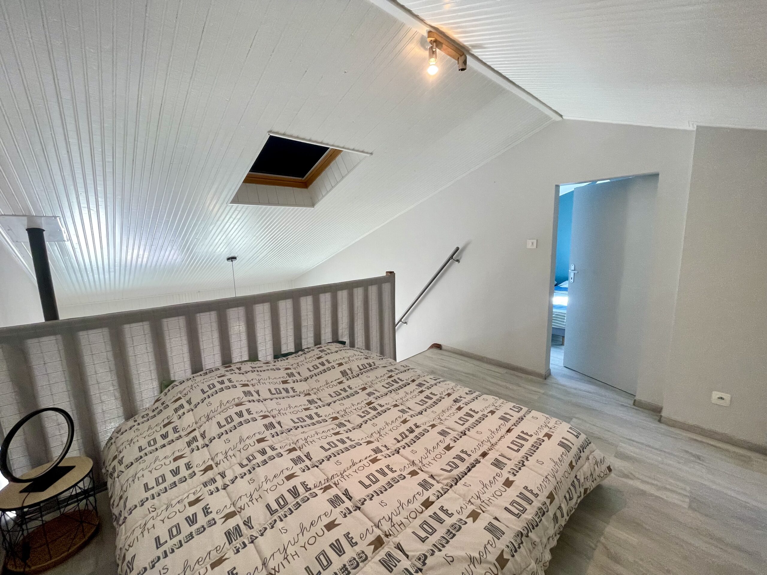 A L’ETAGE : mezzanine ouverte sur séjour avec 2 lits simples (2 x 90, qui peuvent être rapprochés) + placard.