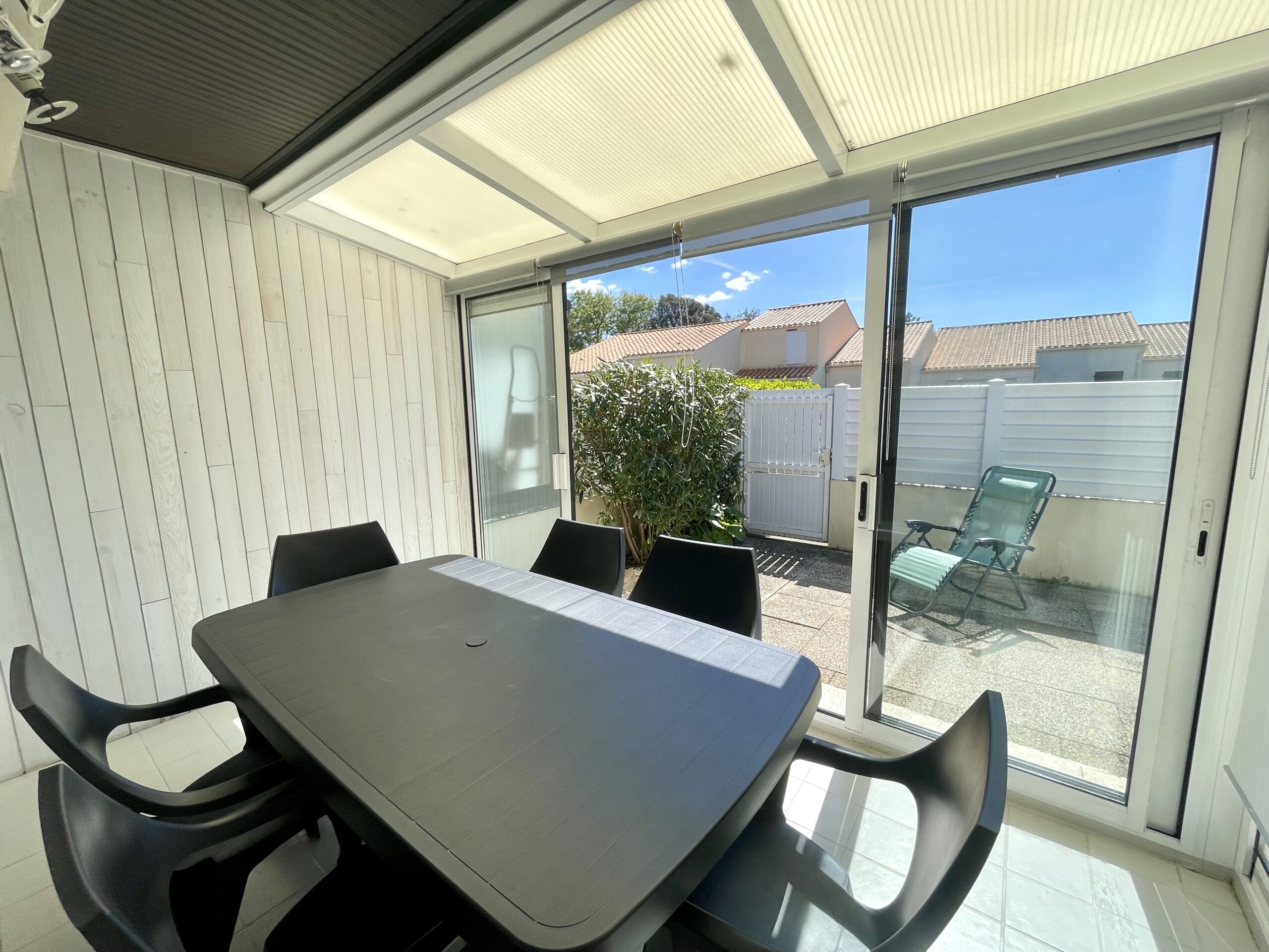 La pièce de vie ouvre sur une agréable véranda puis une cour dallée avec salon de jardin, parasol, barbecue.